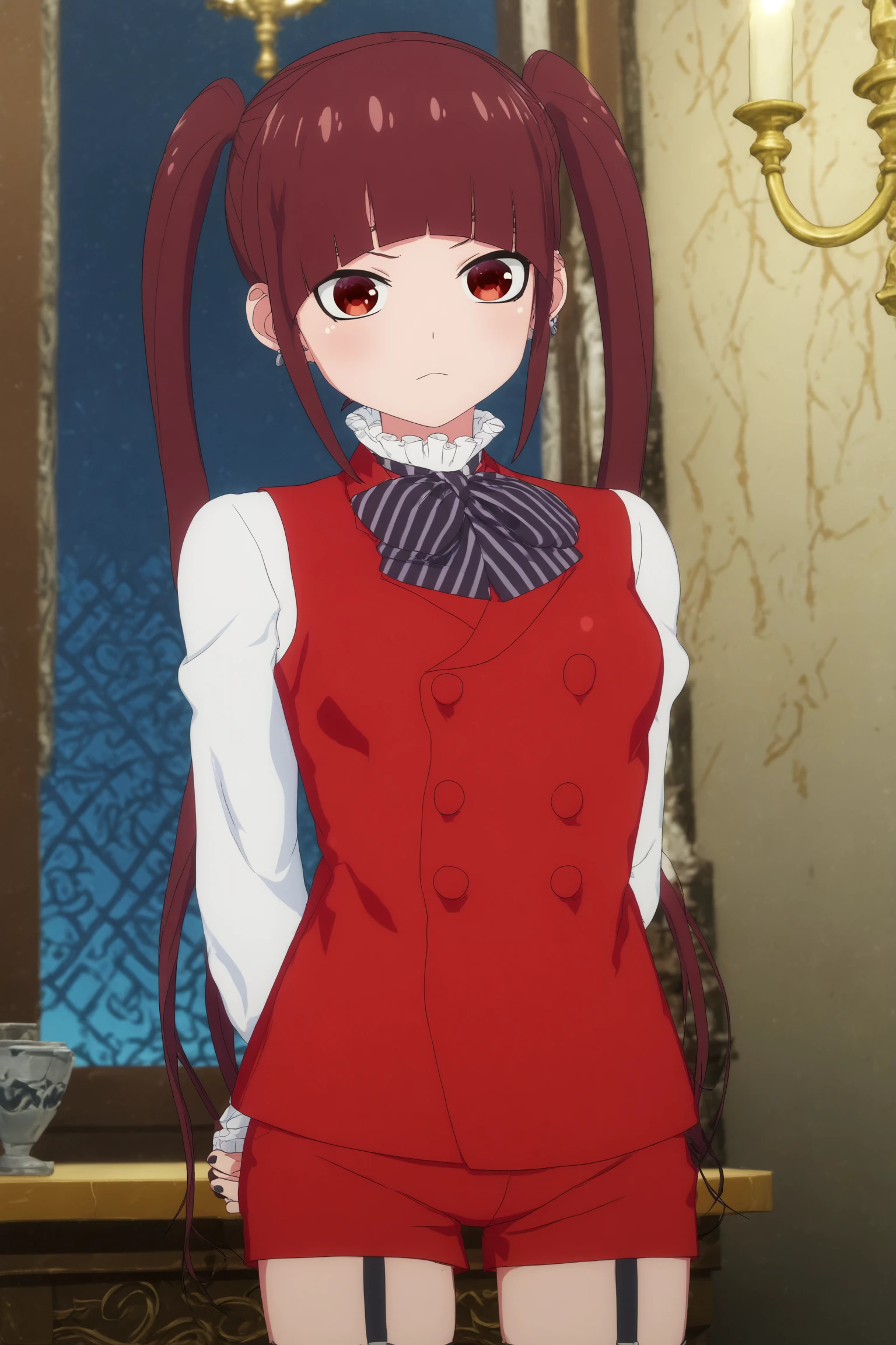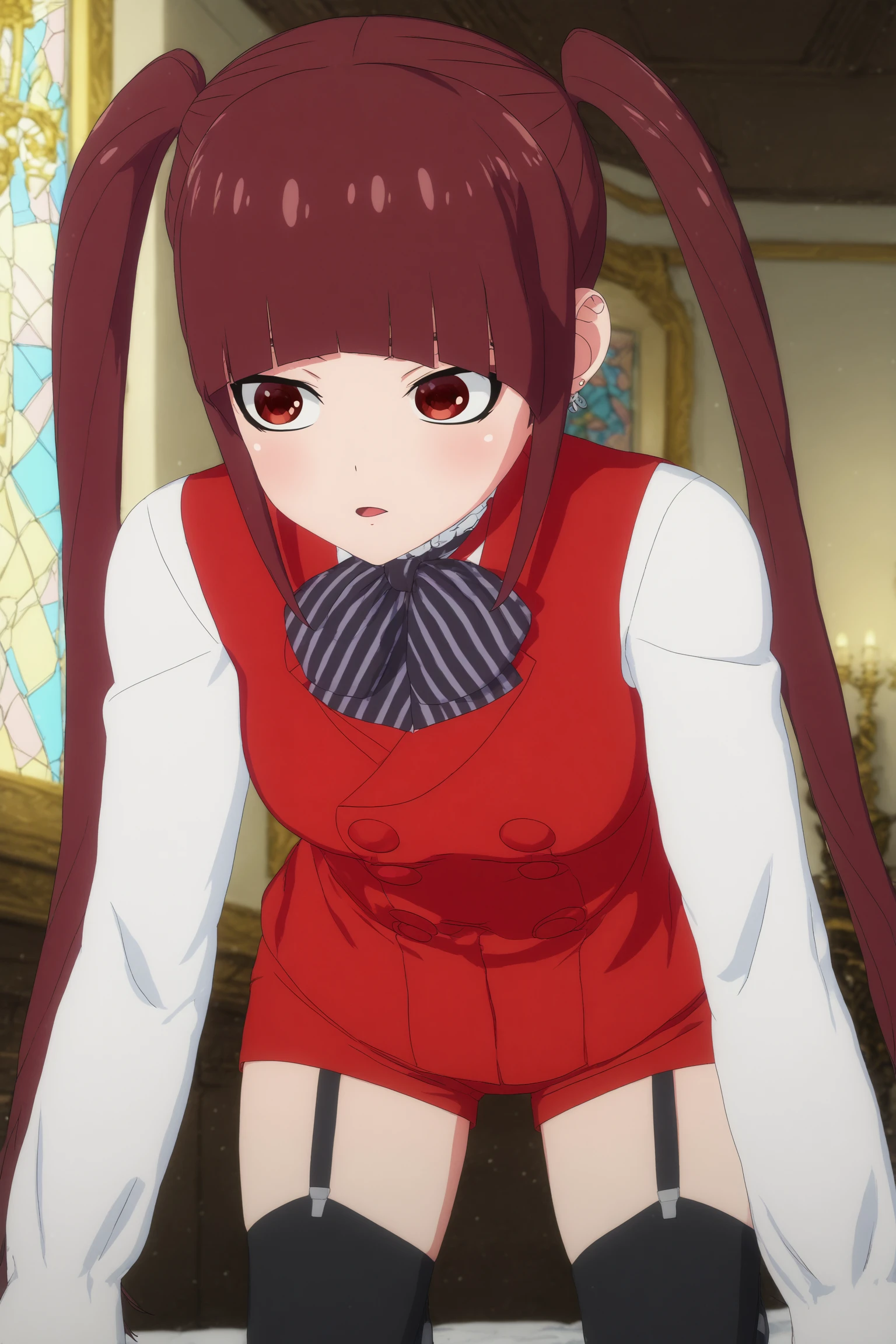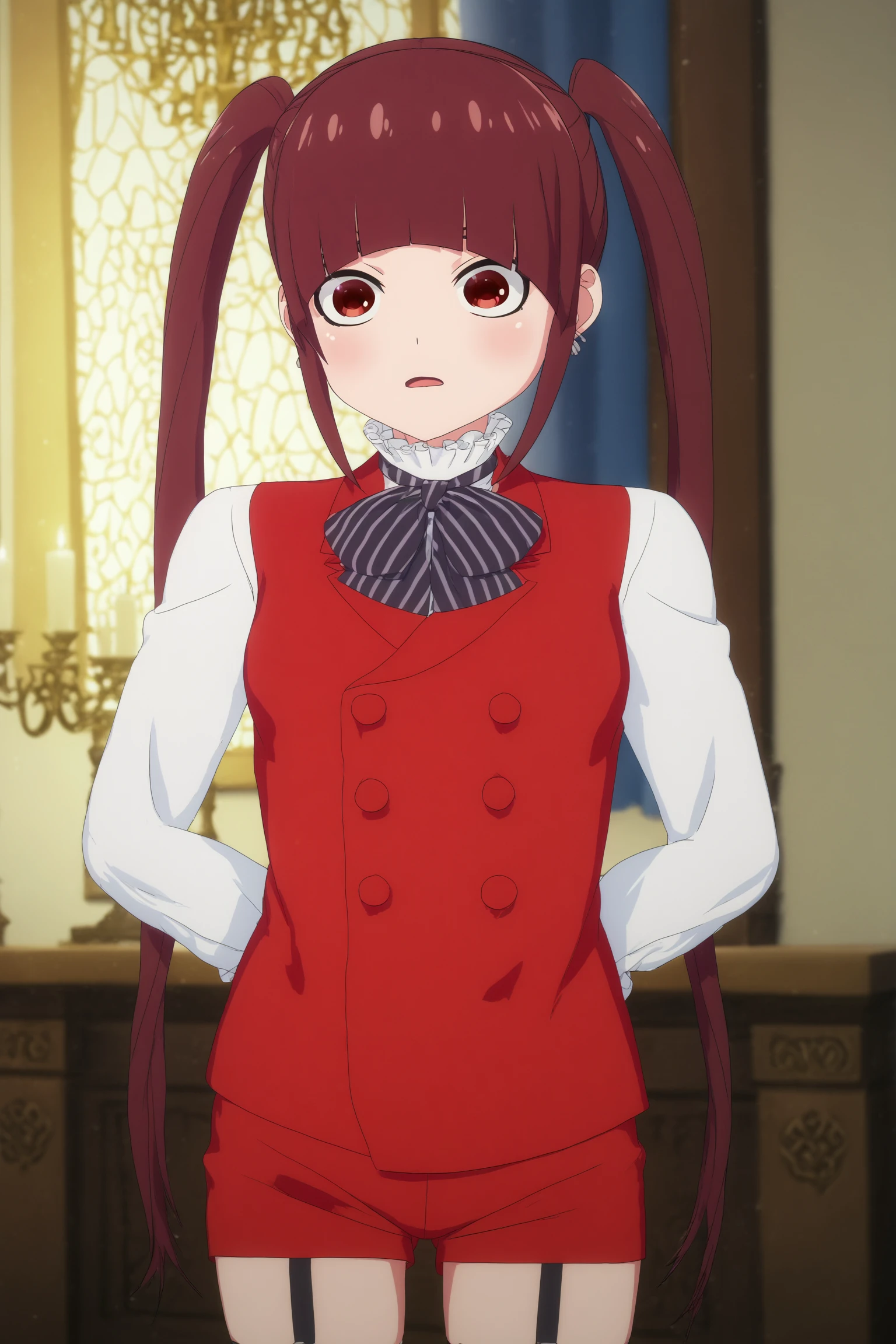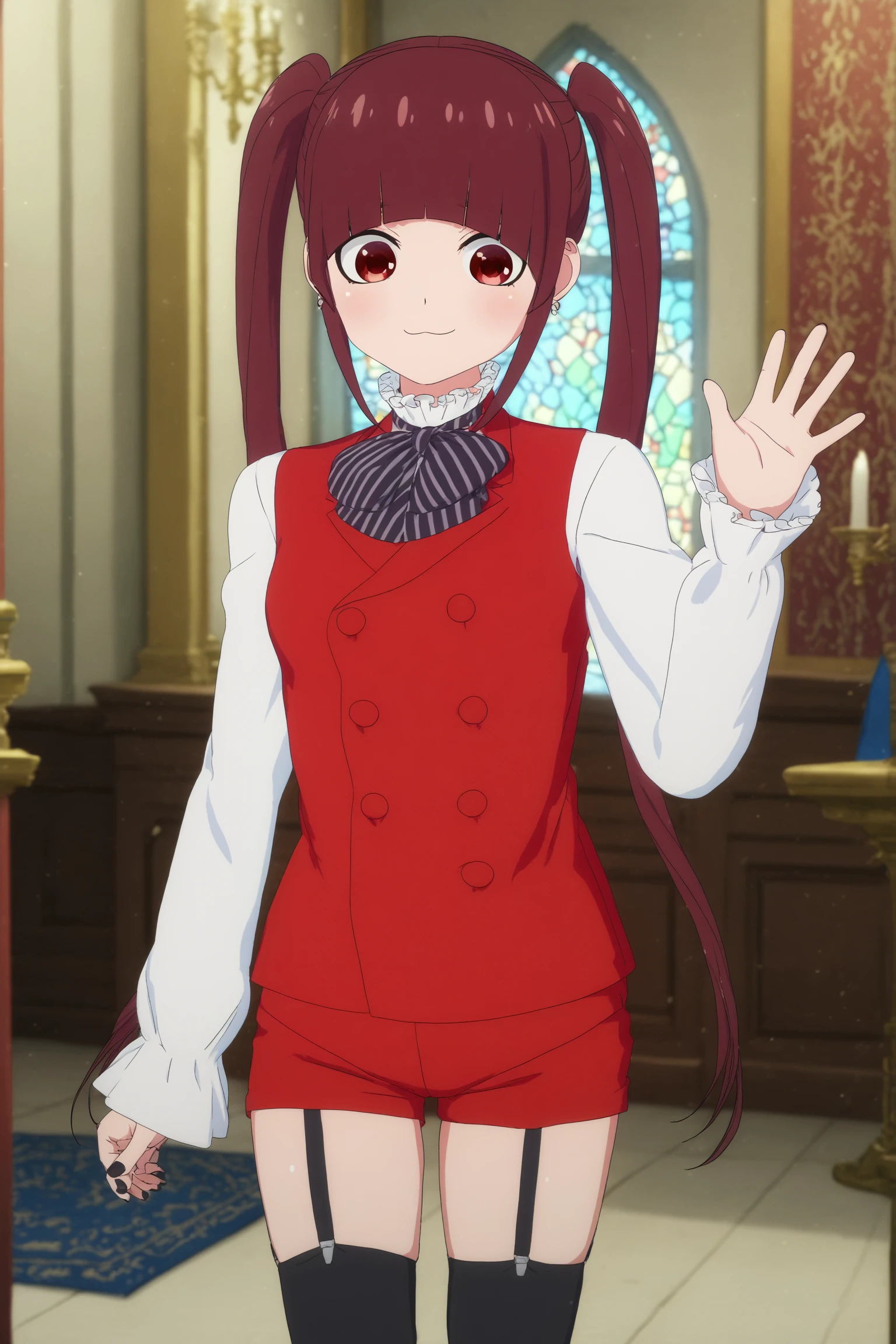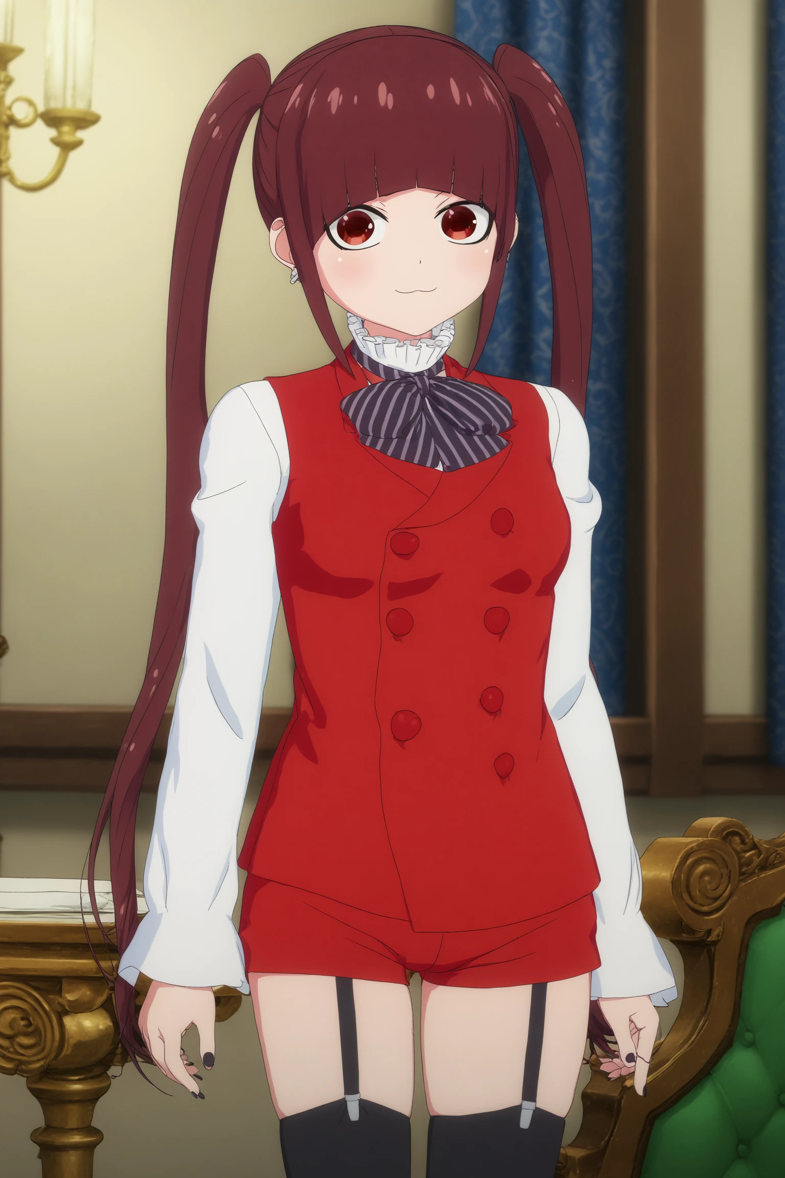 Triggers : viola,1girl,solo,breasts,twintails,long_hair, earrings, jewelry, bow,bangs,blunt_bangs, thighhighs,garter straps,black thighhighs,red shorts,long_sleeves, school uniform,red vest,nail polish,shirt,red dress