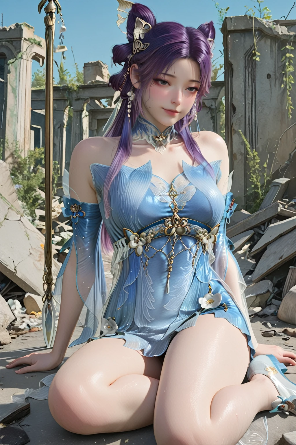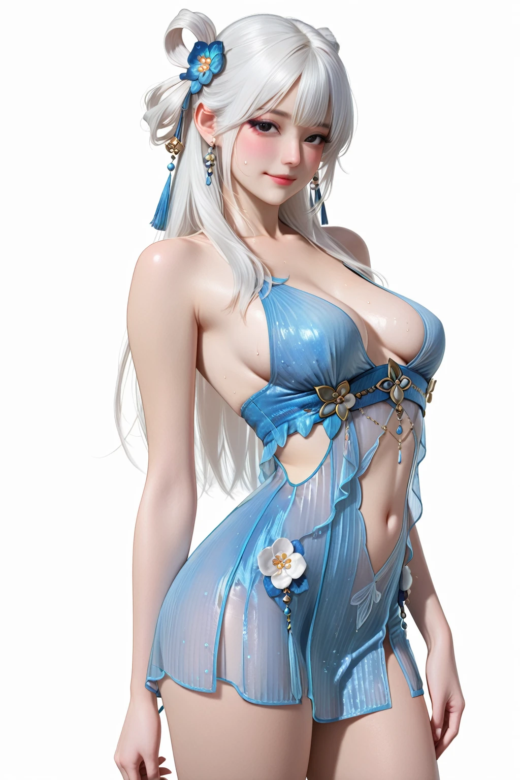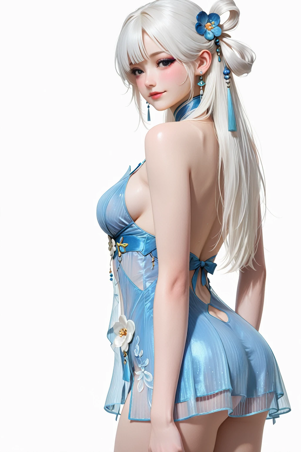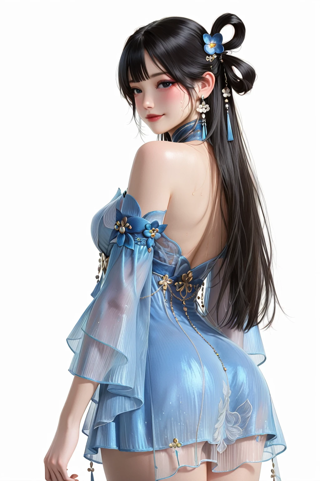 13878w,blue dress,dress,flower,detached sleeves,jewelry,bare shoulders,flat shoes,microdress,