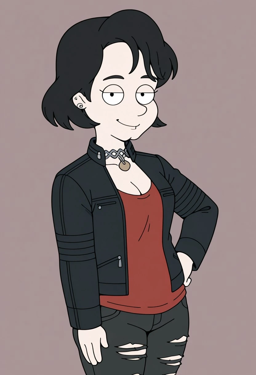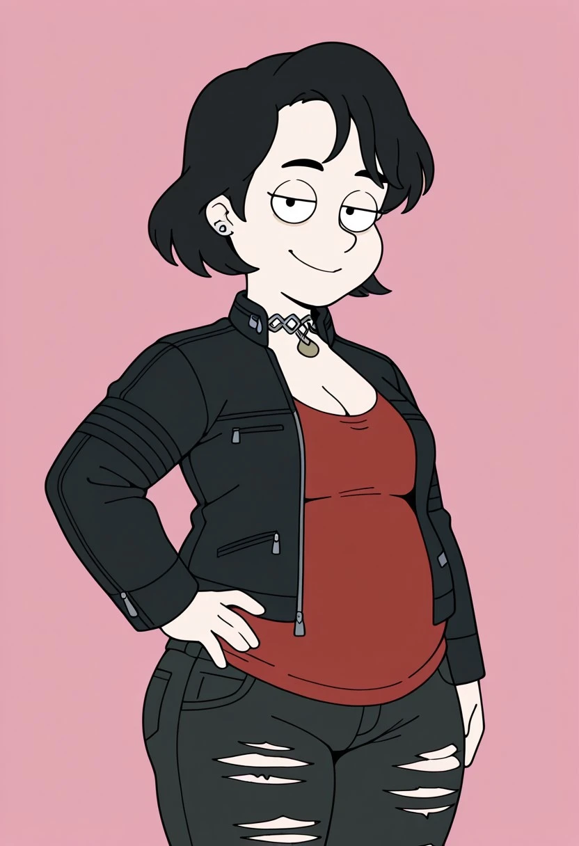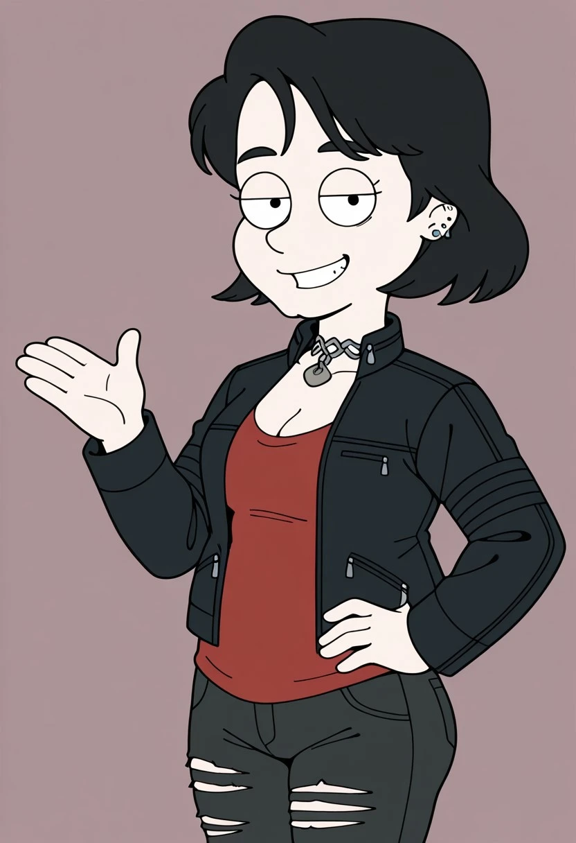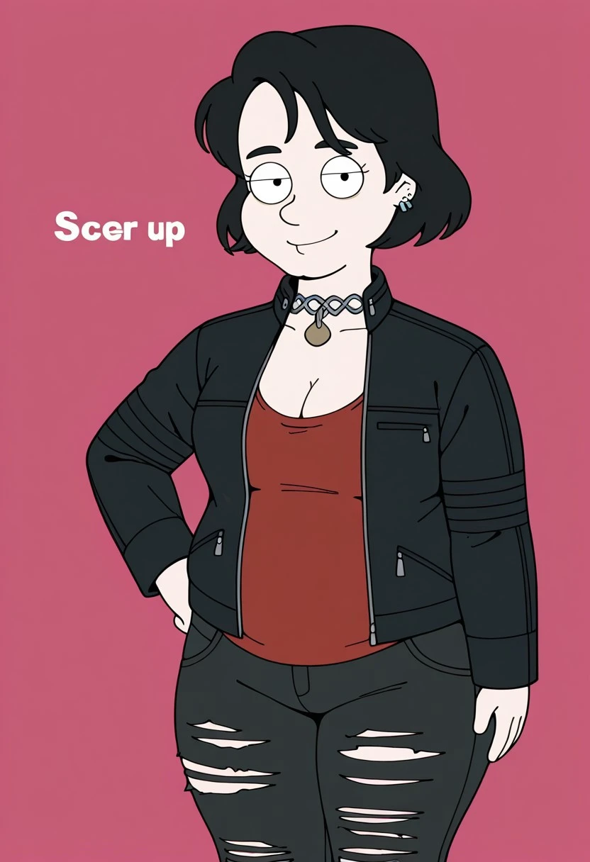 cleavage, red shirt, black jacket, leather jacket, denim, pants, torn pants, boots