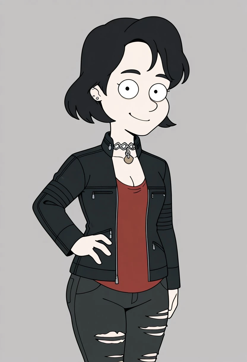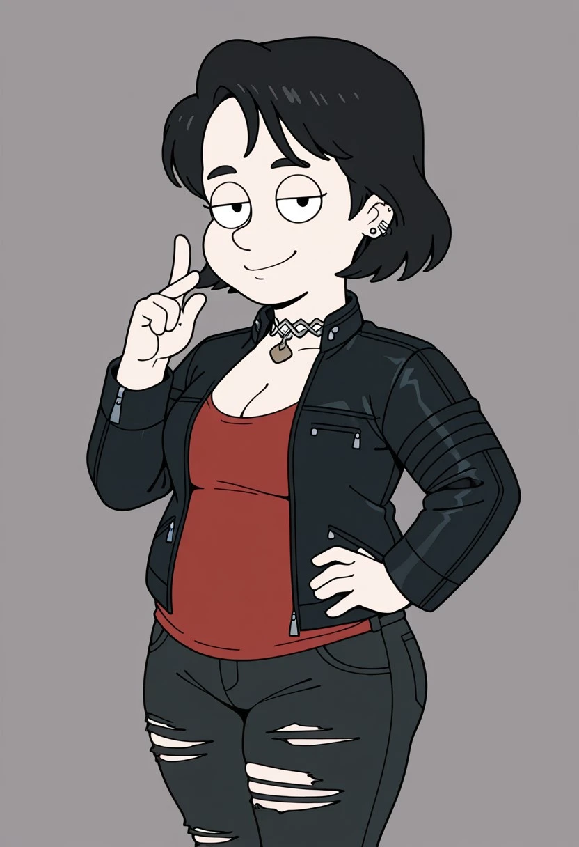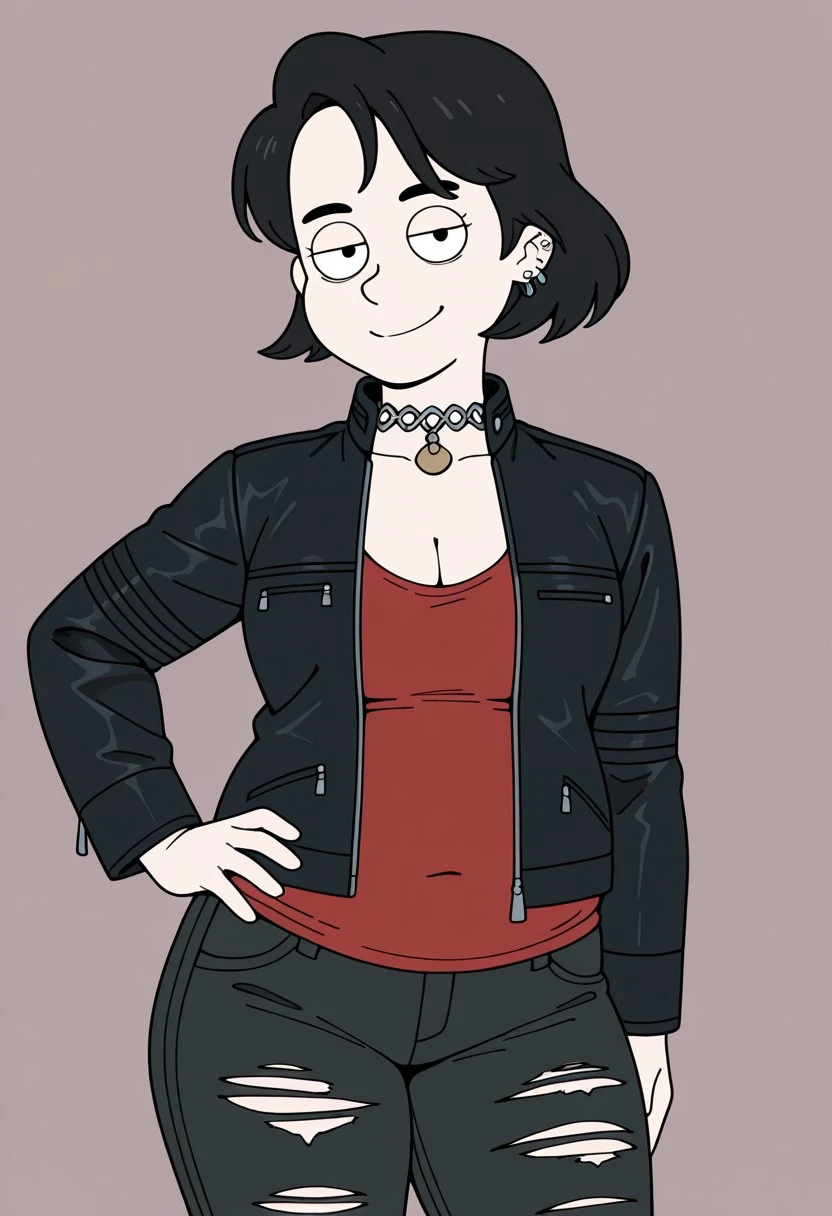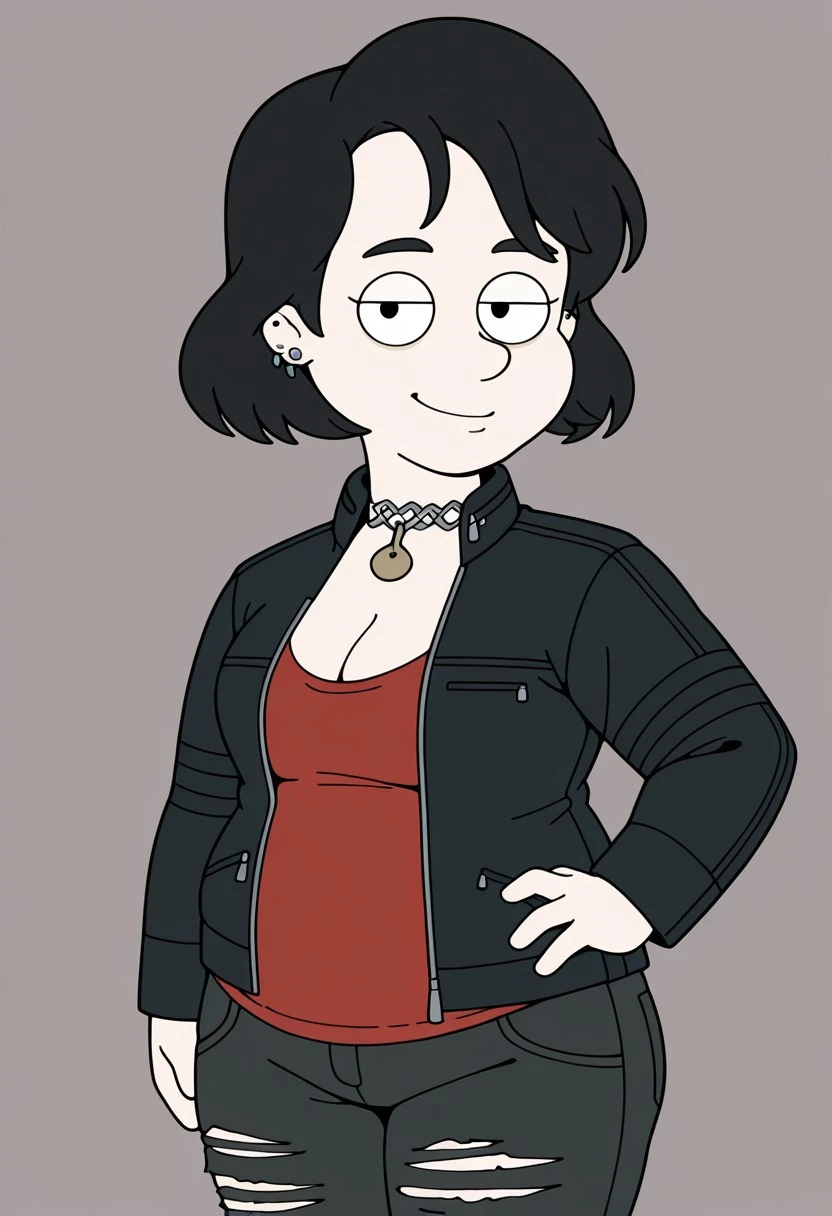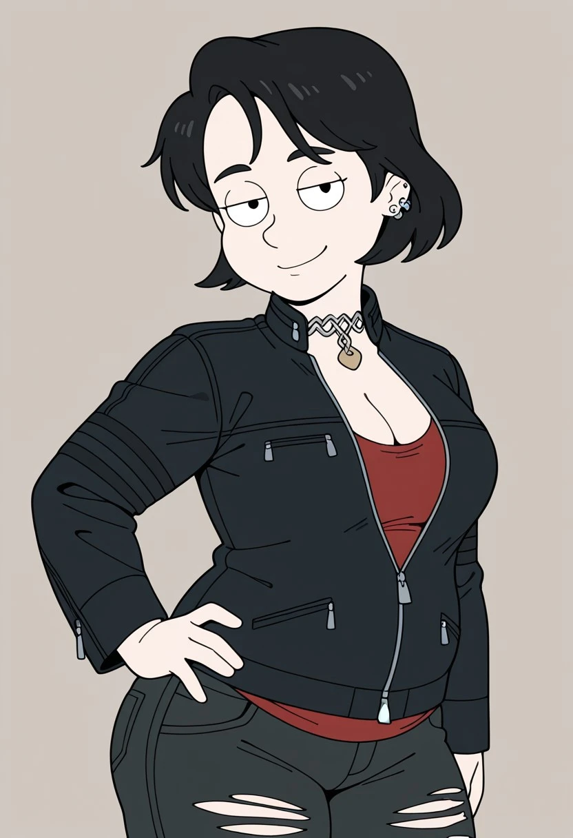 Nerfer_ad, 1girl. solo, black hair, short hair, ear piercing, earrings, choker, black eyebrows, cleft chin, breasts