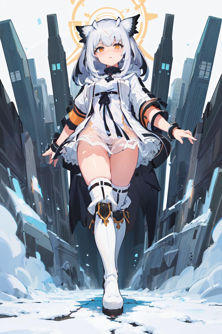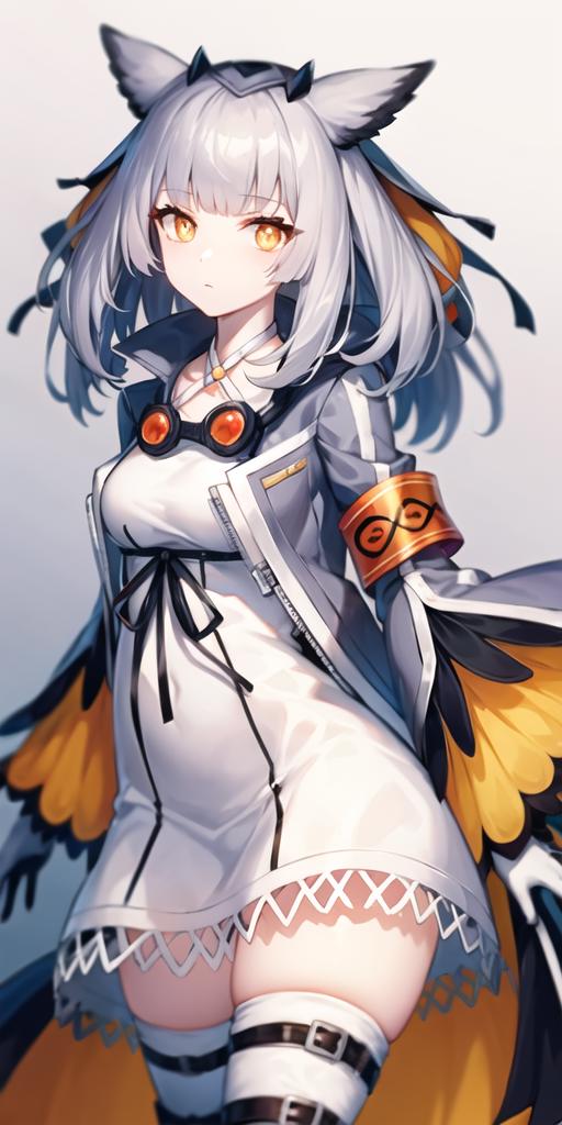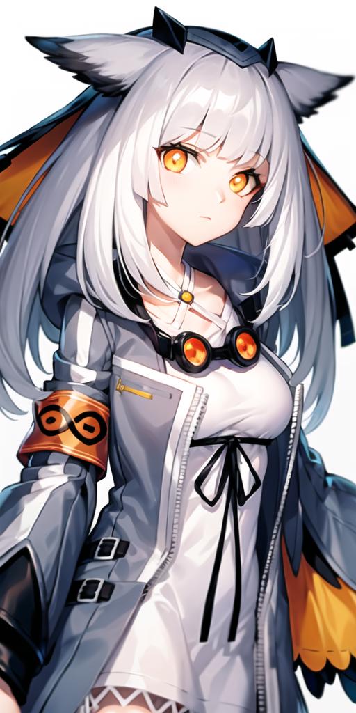 <lora:pti_locon_v1a:0.7>,1girl, black gloves, coat, cowboy shot, dress, gloves, goggles, goggles around neck, grey coat,medium hair, open clothes, open coat, simple background, solo, white background, white dress, looking at viewer, long sleeves, armband, wide sleeves,bangs, closed mouth
