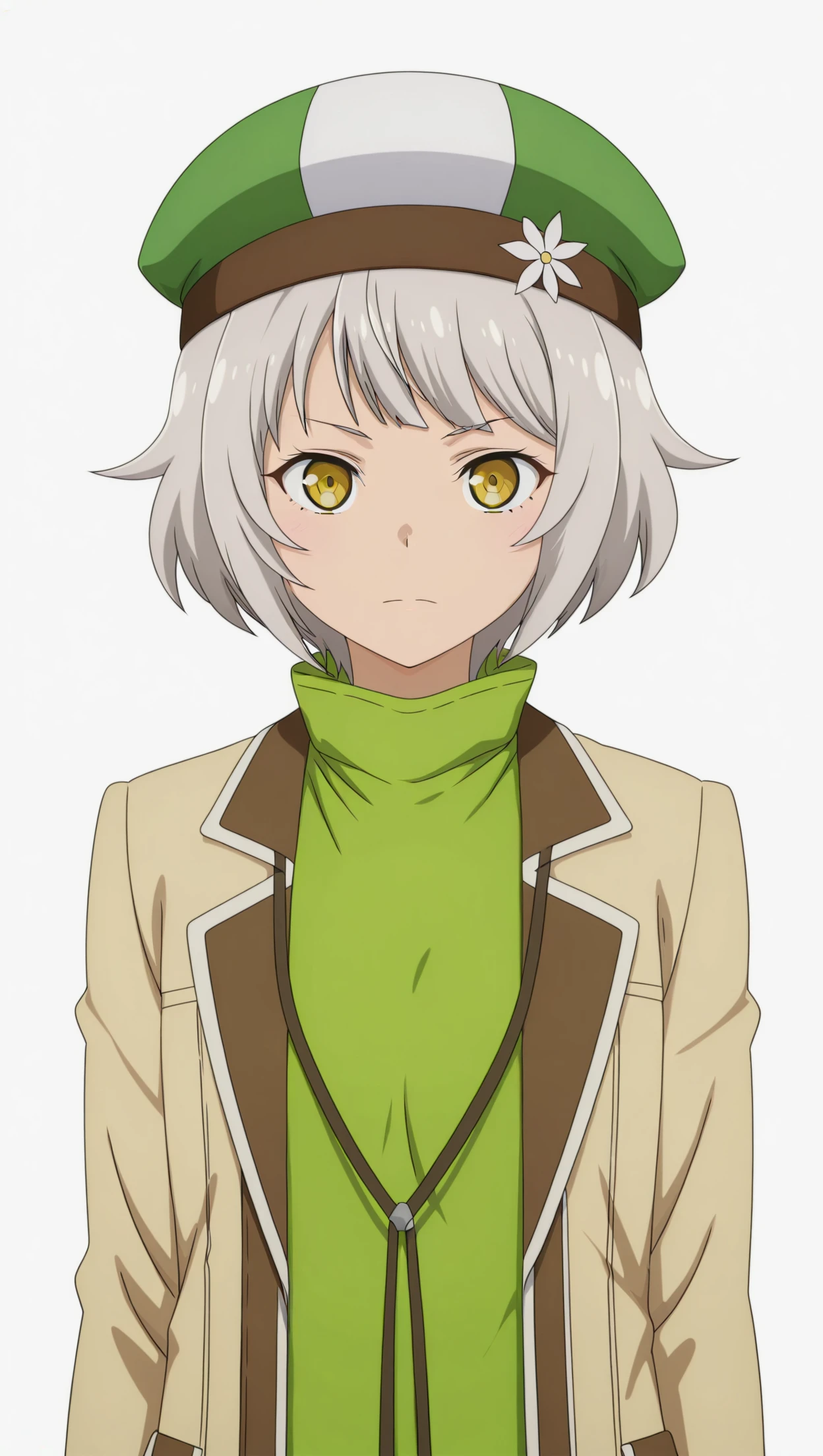 alma, short hair, silver hair, yellow eyes, hat, turtleneck, tank top, green tank top, jacket, pants, green pants,