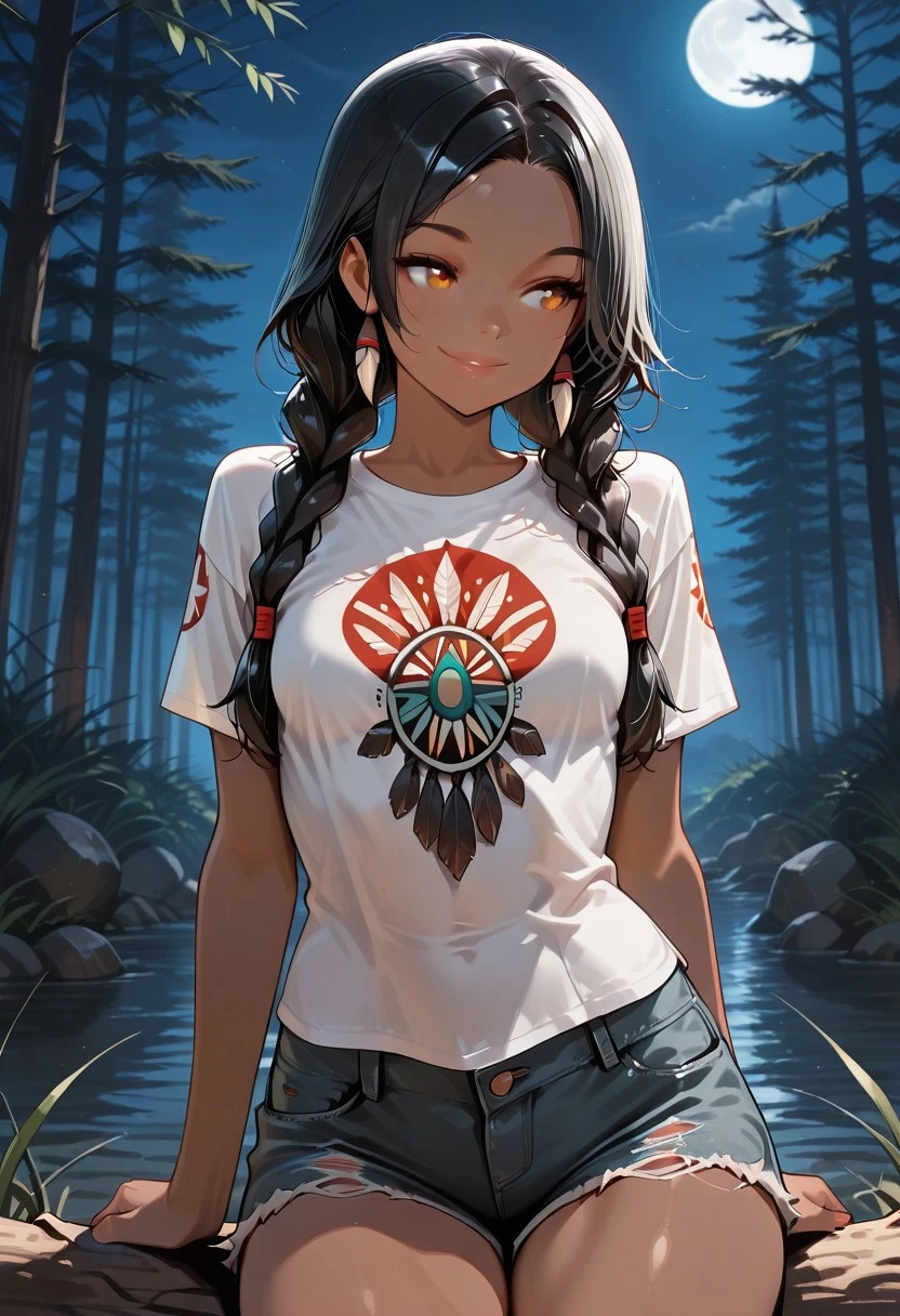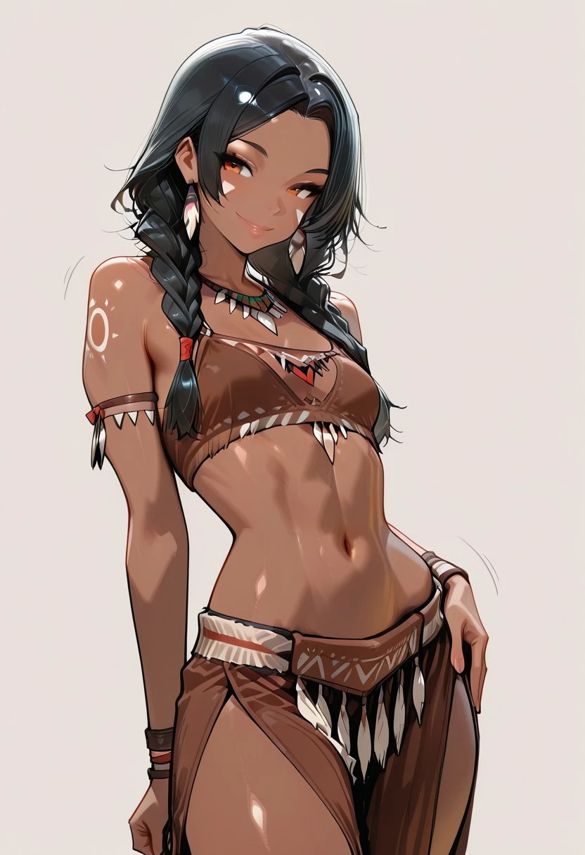 black hair, double twin braids, parted hair , very small breasts, slim, dark skin, native_american, fit, slightly toned, beautiful lips