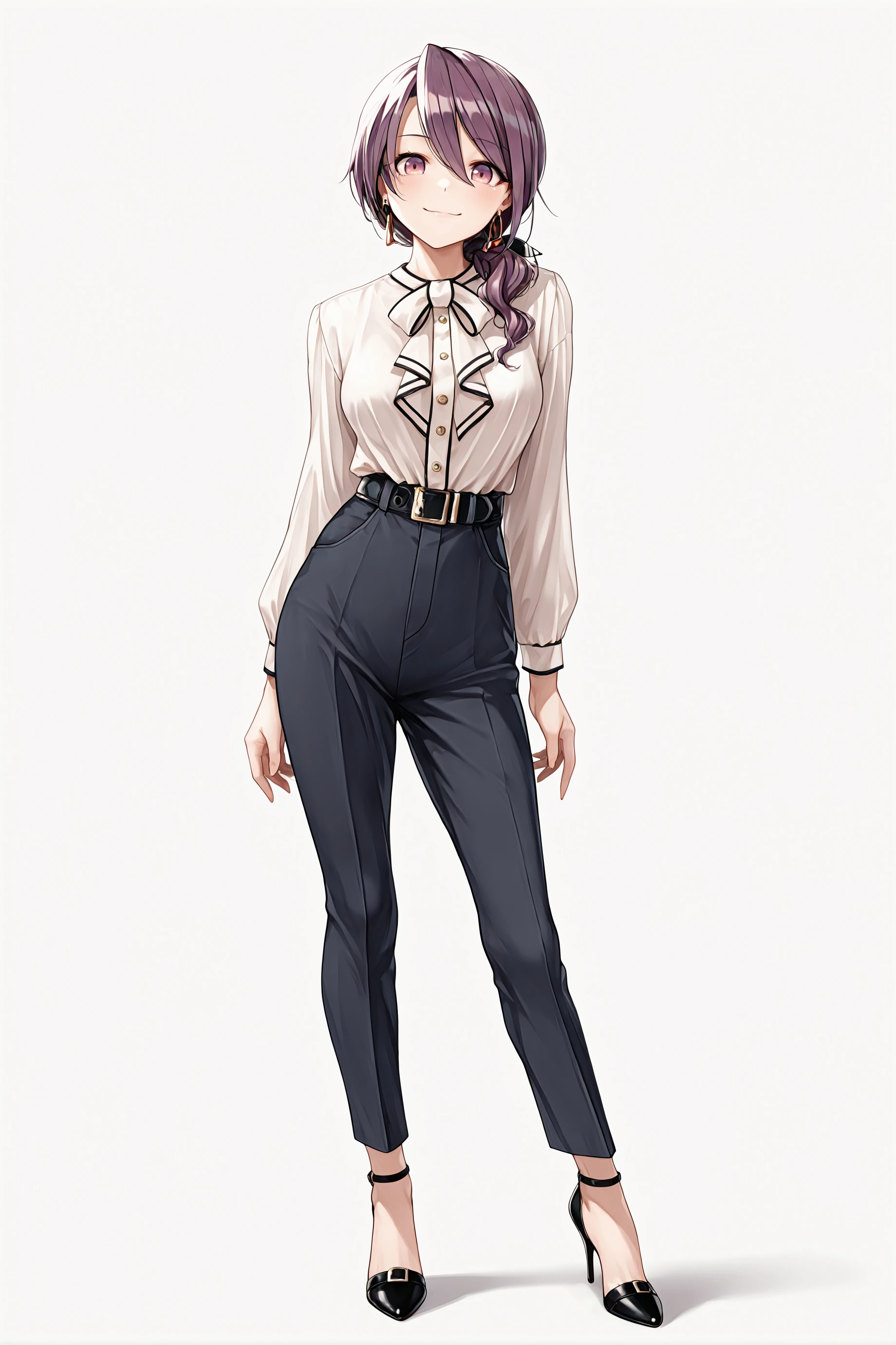 tsurugi ryoka, white shirt, long sleeves, belt, pants, ankle strap, pumps, d'orsay heels,