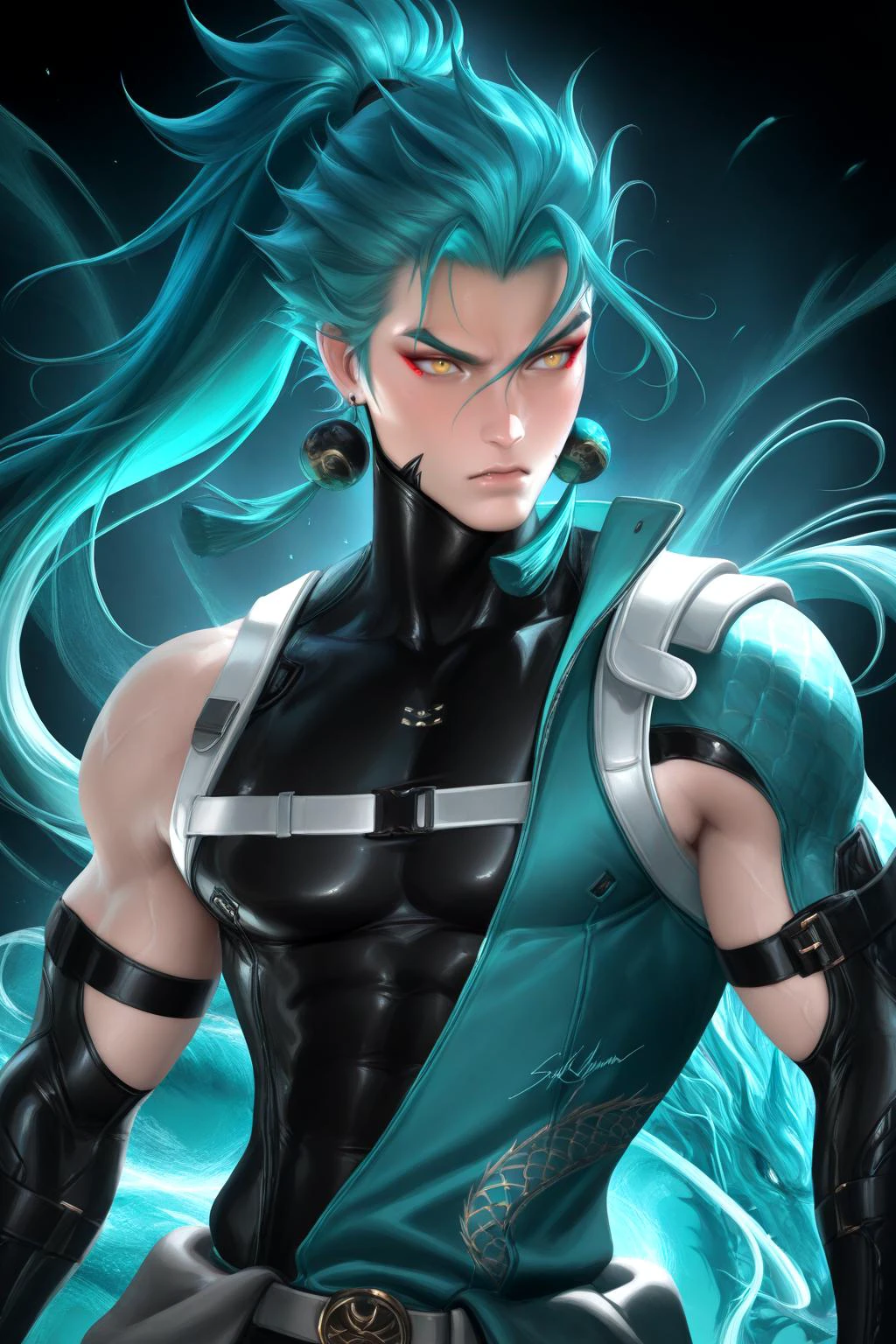 male, boy, teal_blue_hair, long_ponytail, windswept_style, asymmetrical_cut, dynamic_hair_flow, sharp_jawline, sharp_eyebrows, red eyeliner, yellow eyes, pale_skin, face tatttoo, teal_jacket, dragon_pattern_sleeve, asymmetrical_design, jiyan