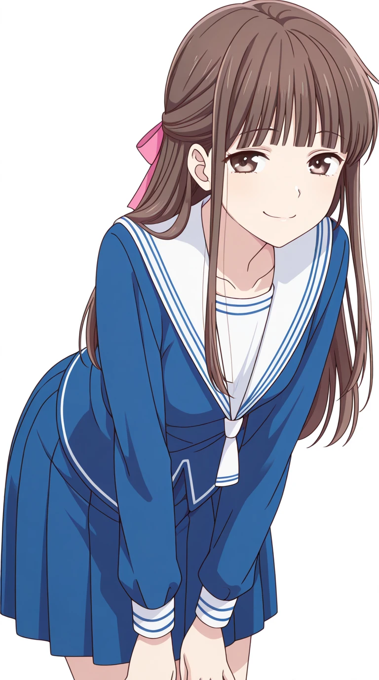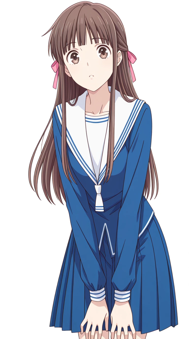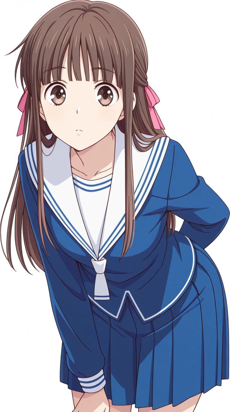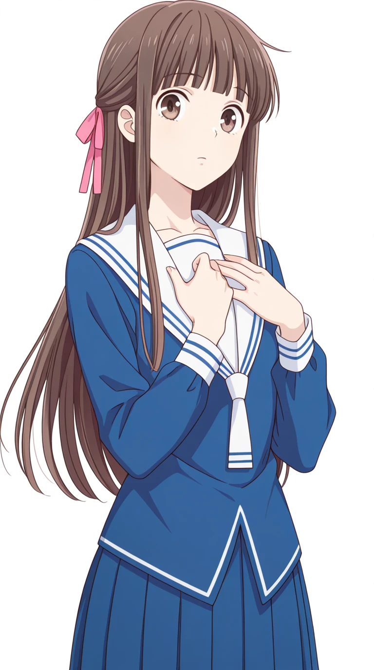 tooru honda, long hair, brown hair, ribbon, brown eyes, hair ribbon, blunt bangs, half updo, mature female, small , animes screencap