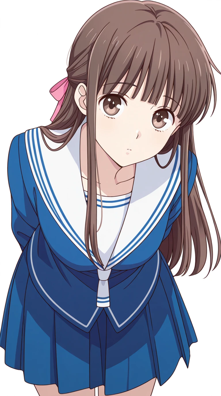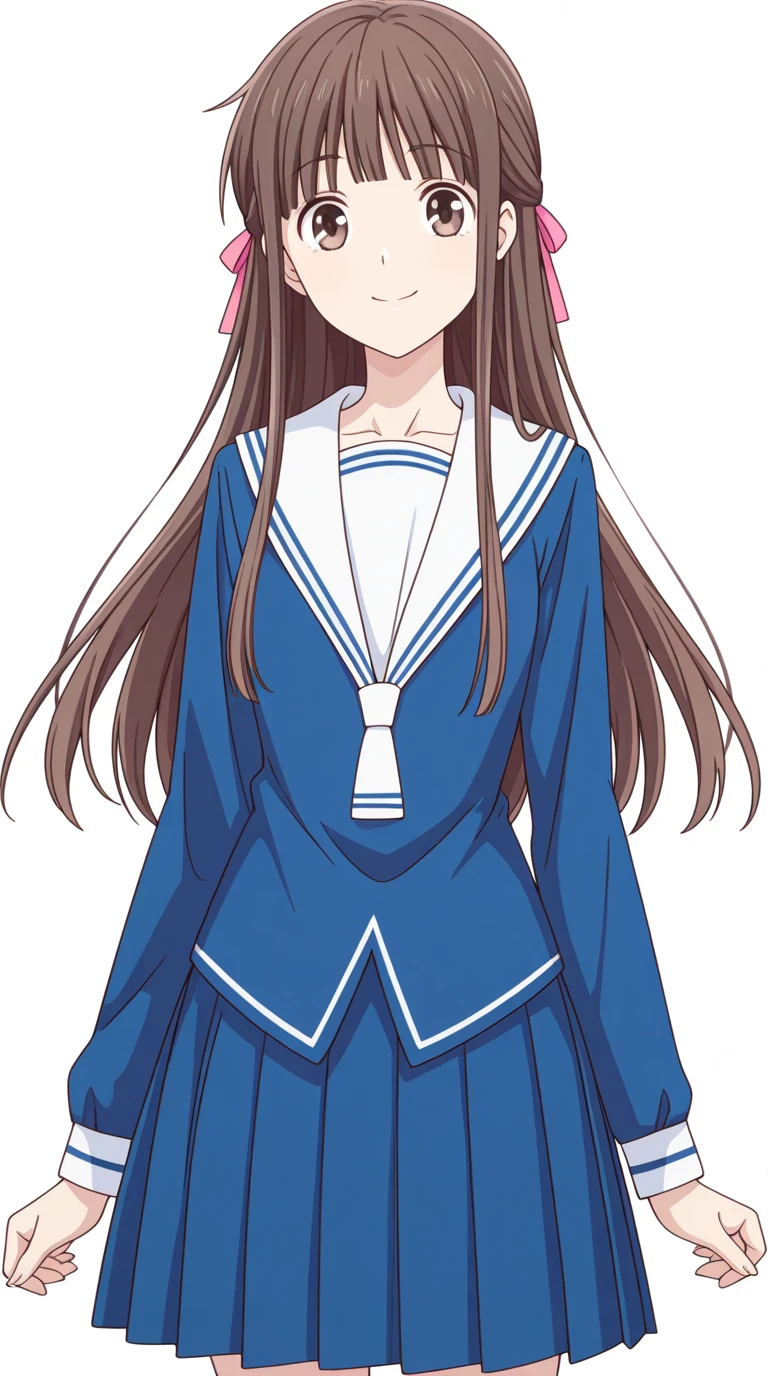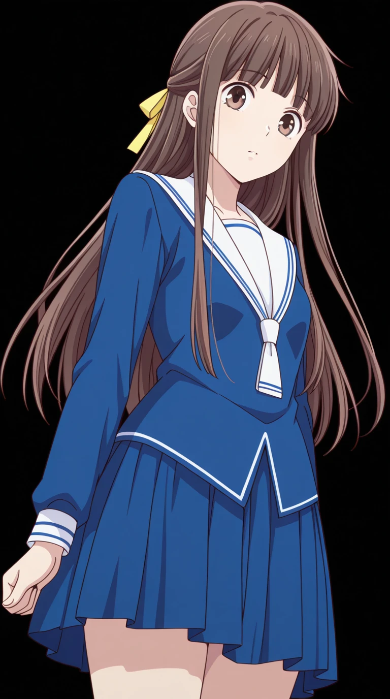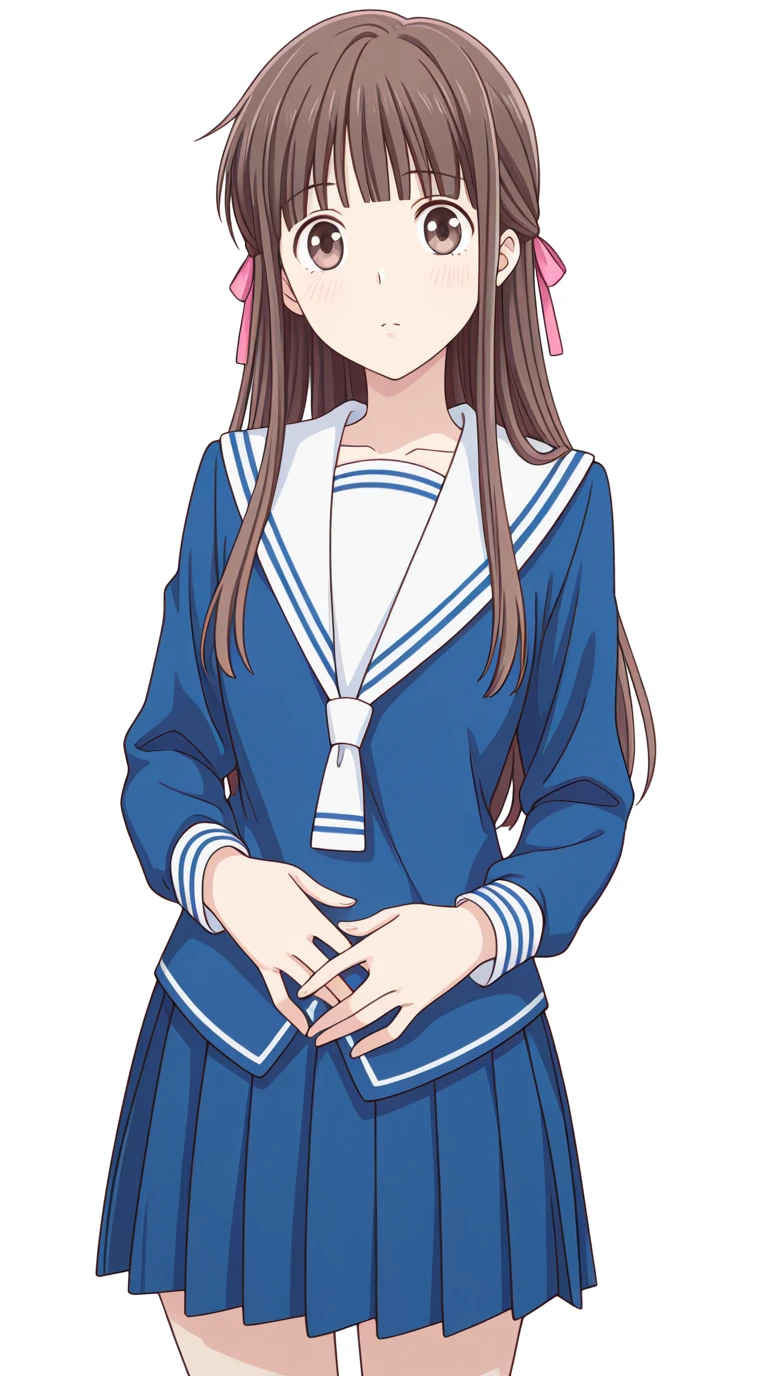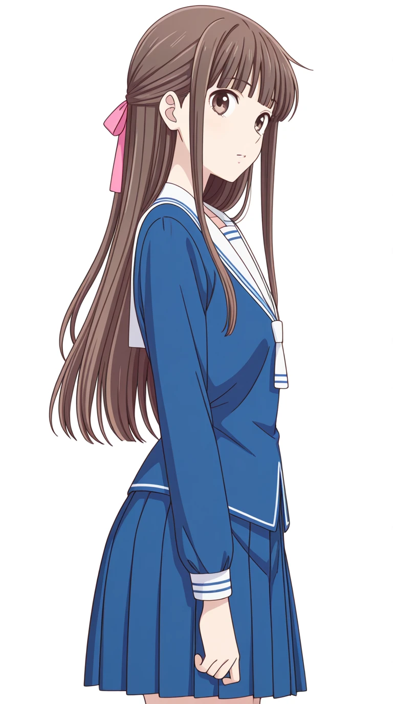 tooru honda, long hair, brown hair, ribbon, brown eyes, hair ribbon, blunt bangs, half updo, mature female, small , animes screencap