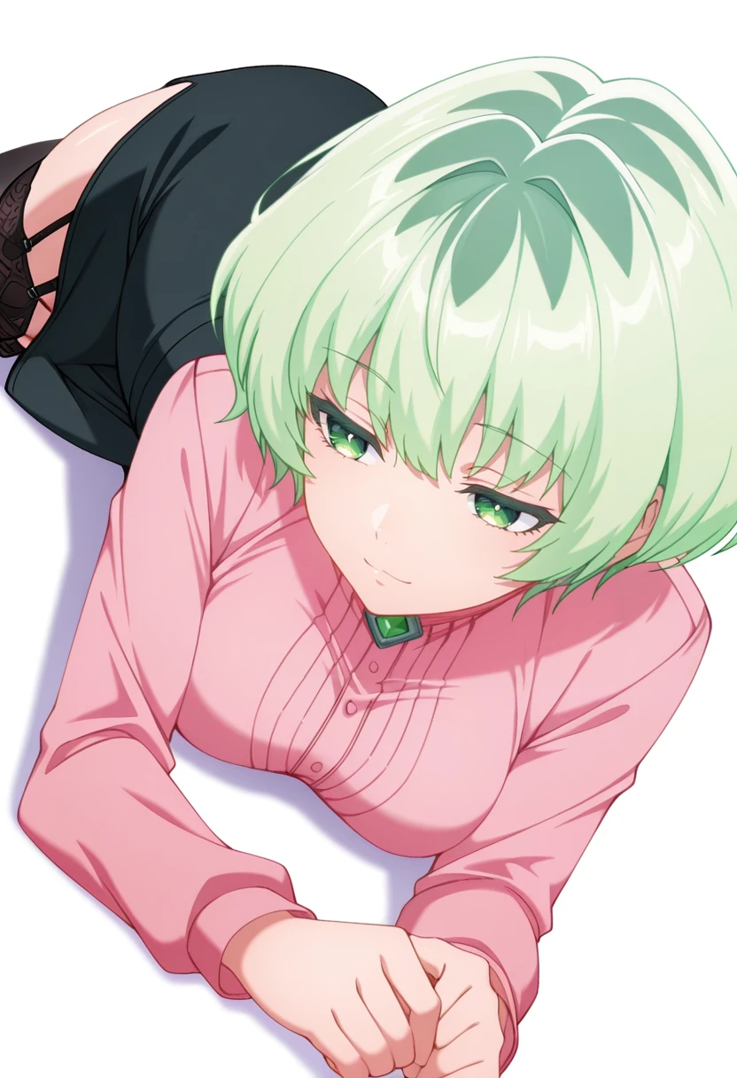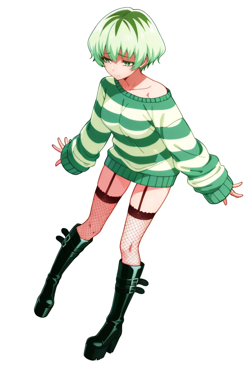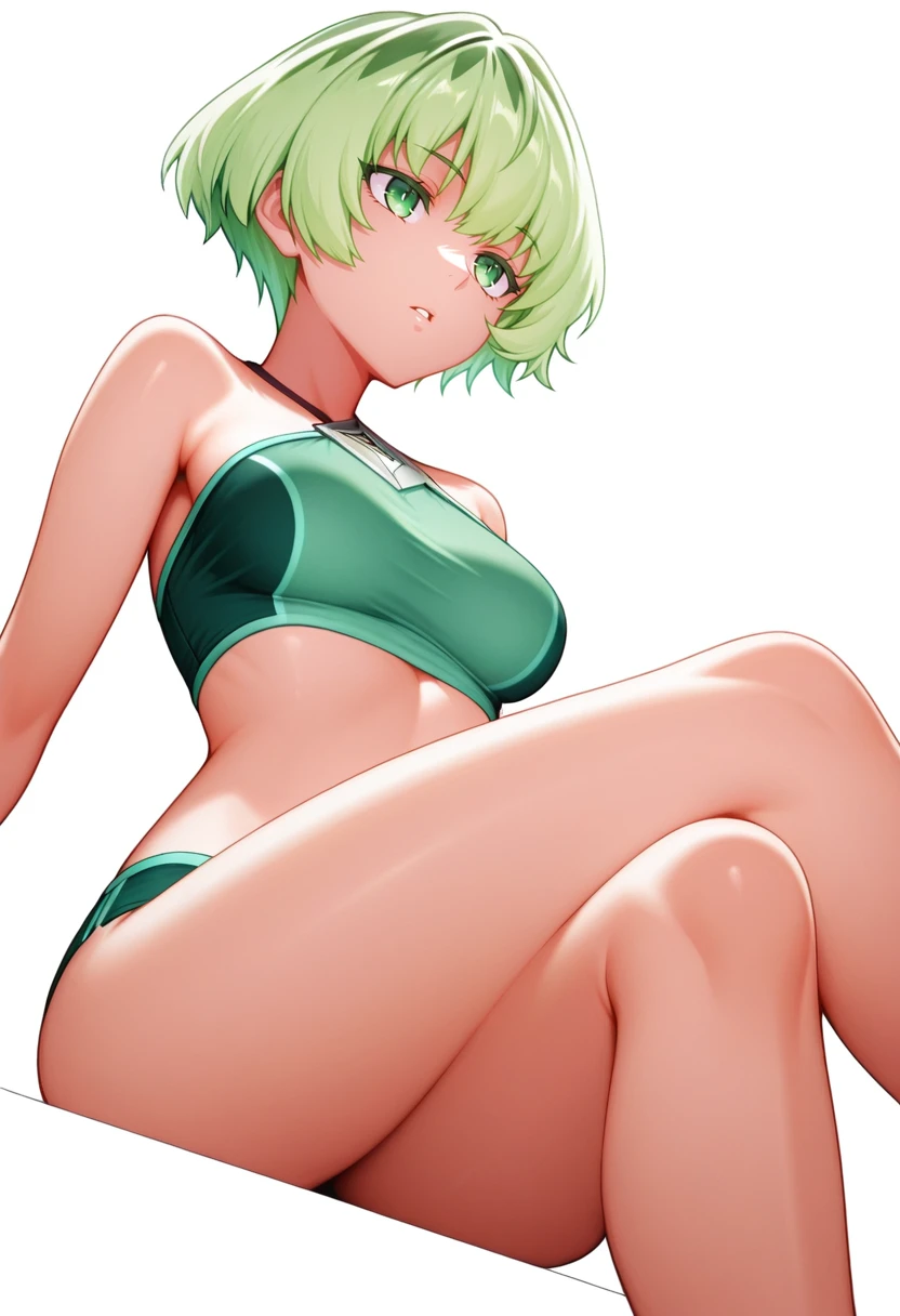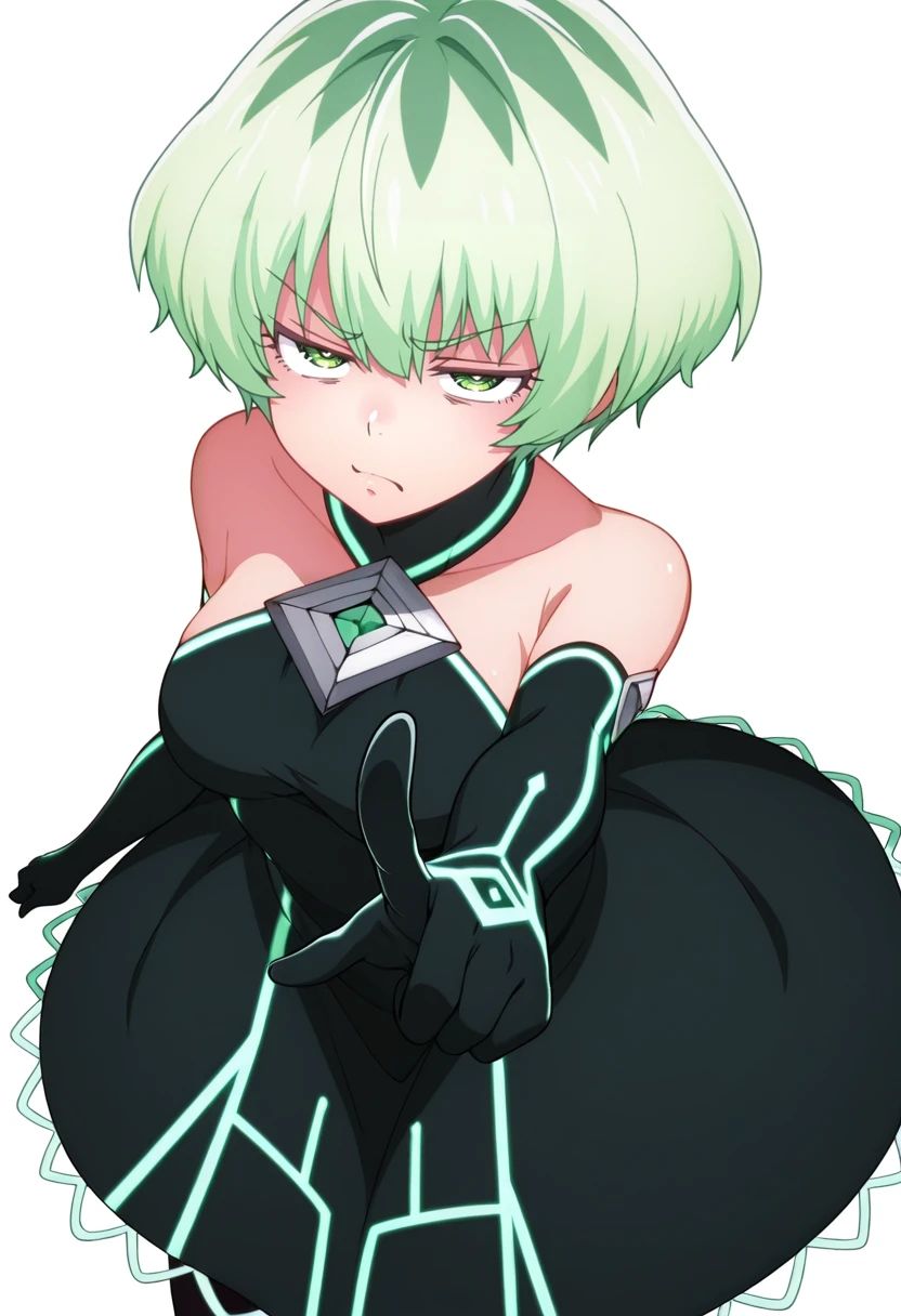 idanokan_cnr, 1girl,short hair, green eyes, green hair, medium breasts,