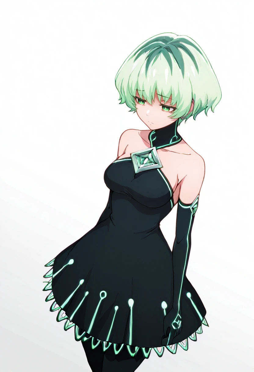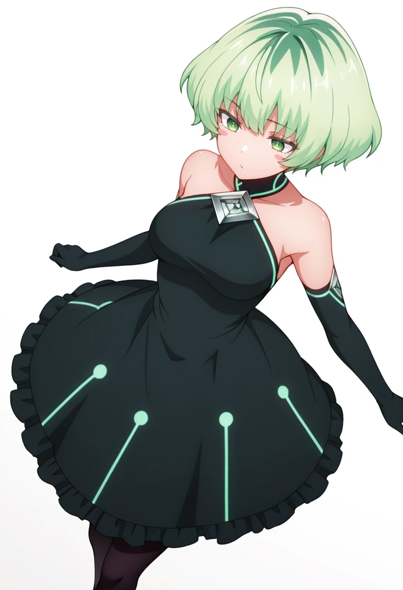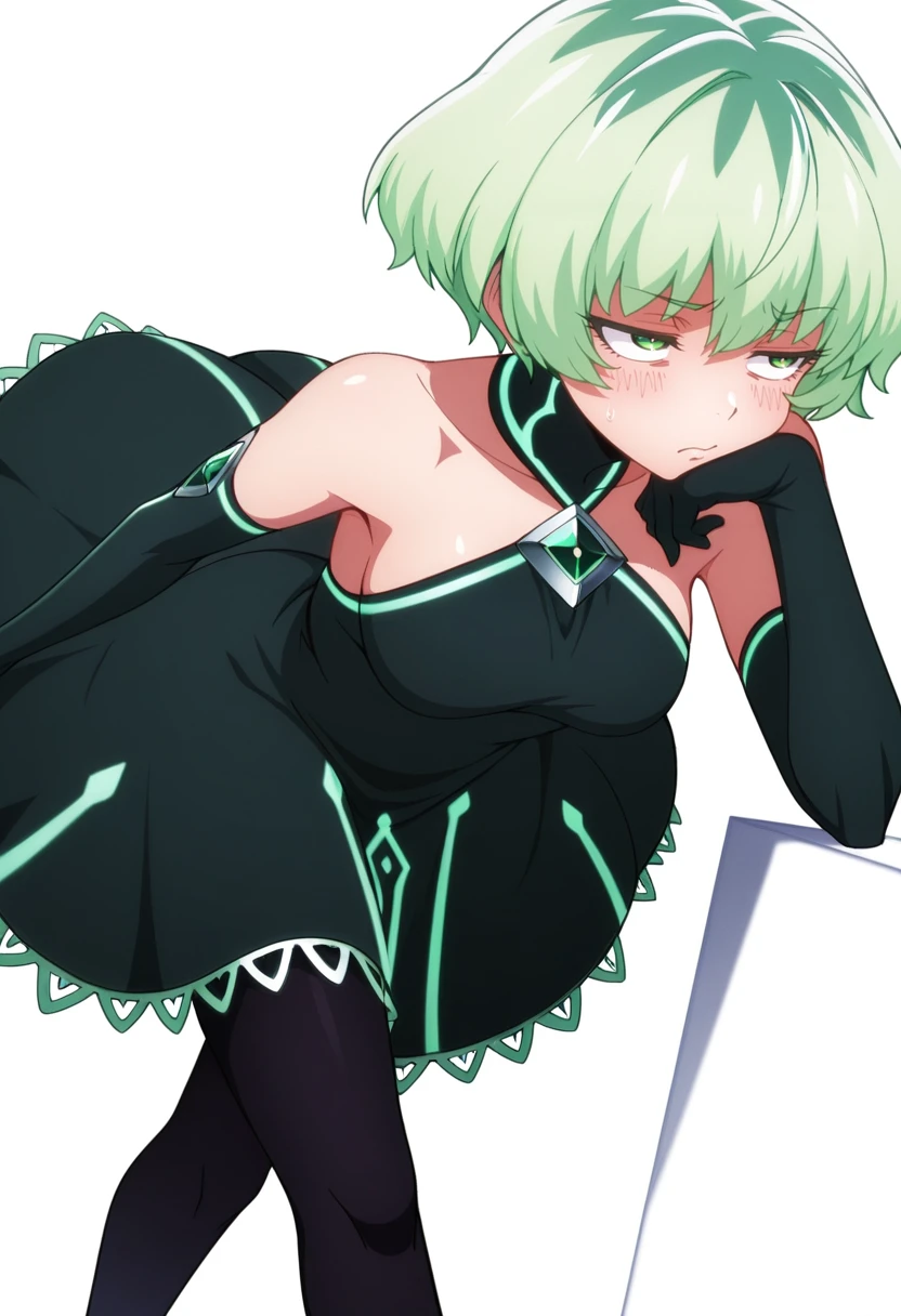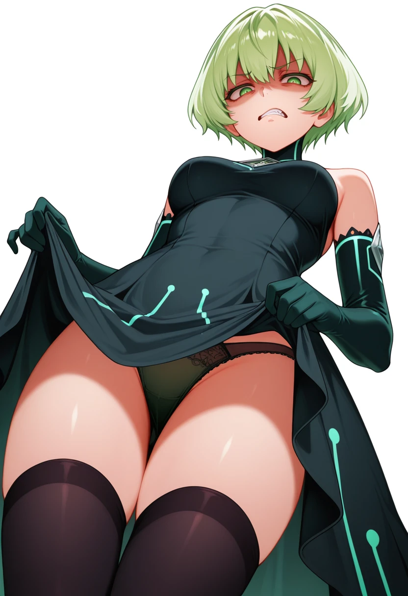 idanokan_cnr, 1girl,short hair, green eyes, green hair, medium breasts,