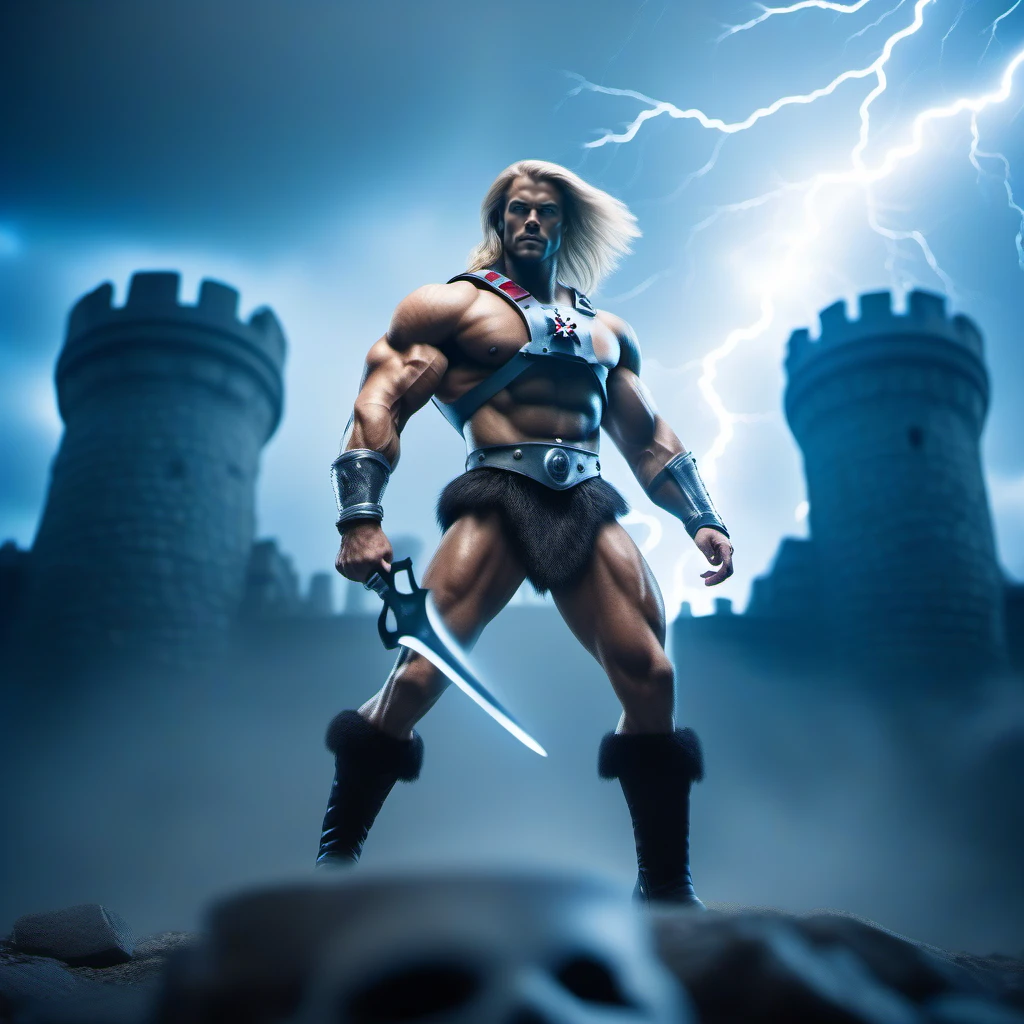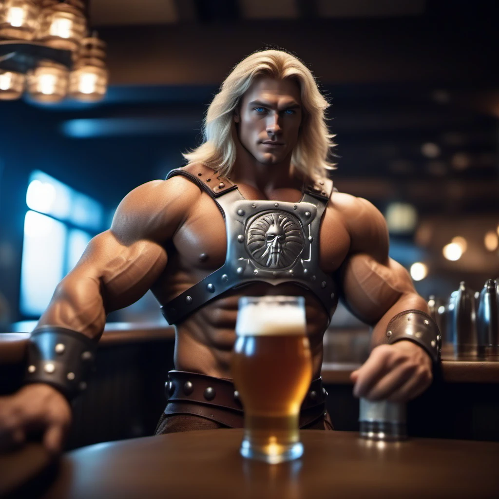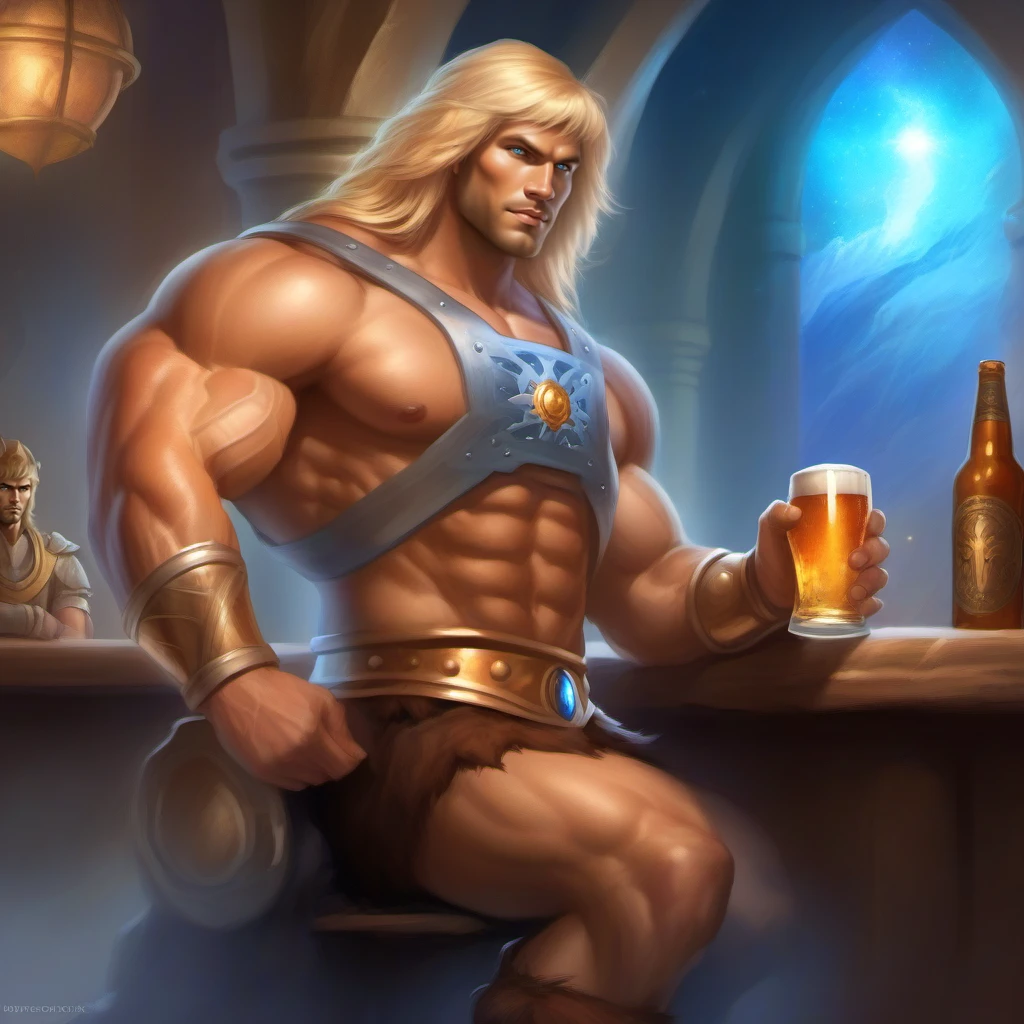 muscular man, blond long hair, blue eyes, boots, manly, armor
