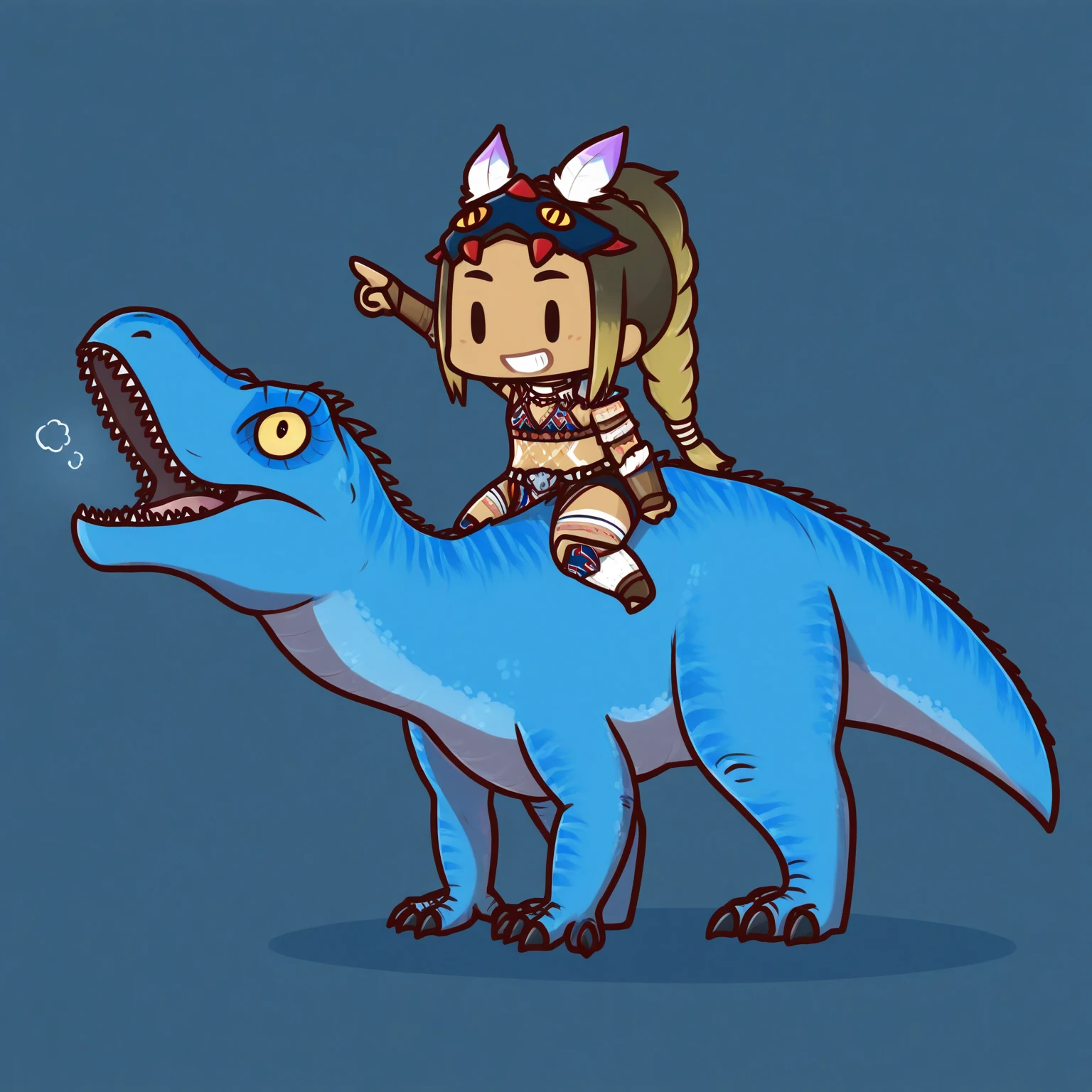 Her signature monstie isn't particularly well-reproducible, but you can try with:velocidrome and/or blue dinosaur