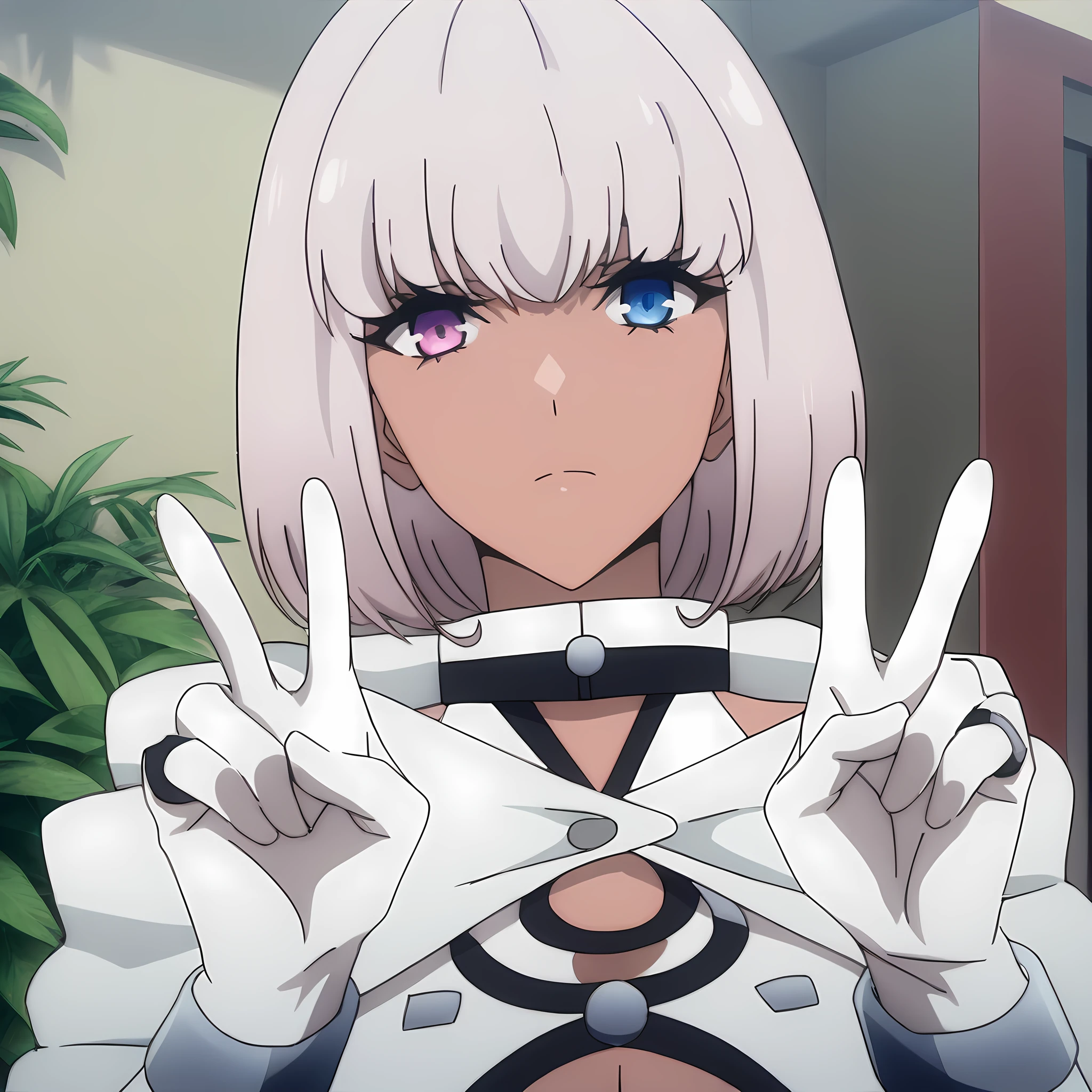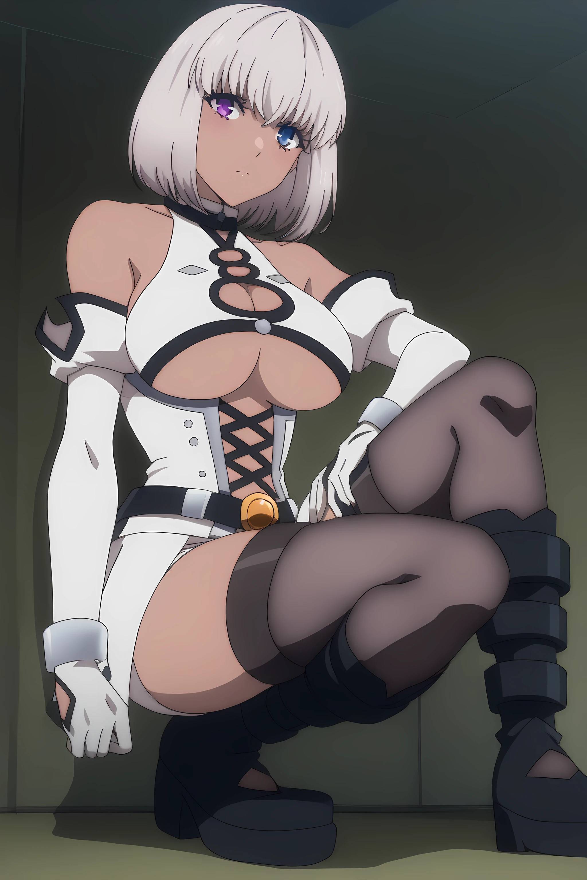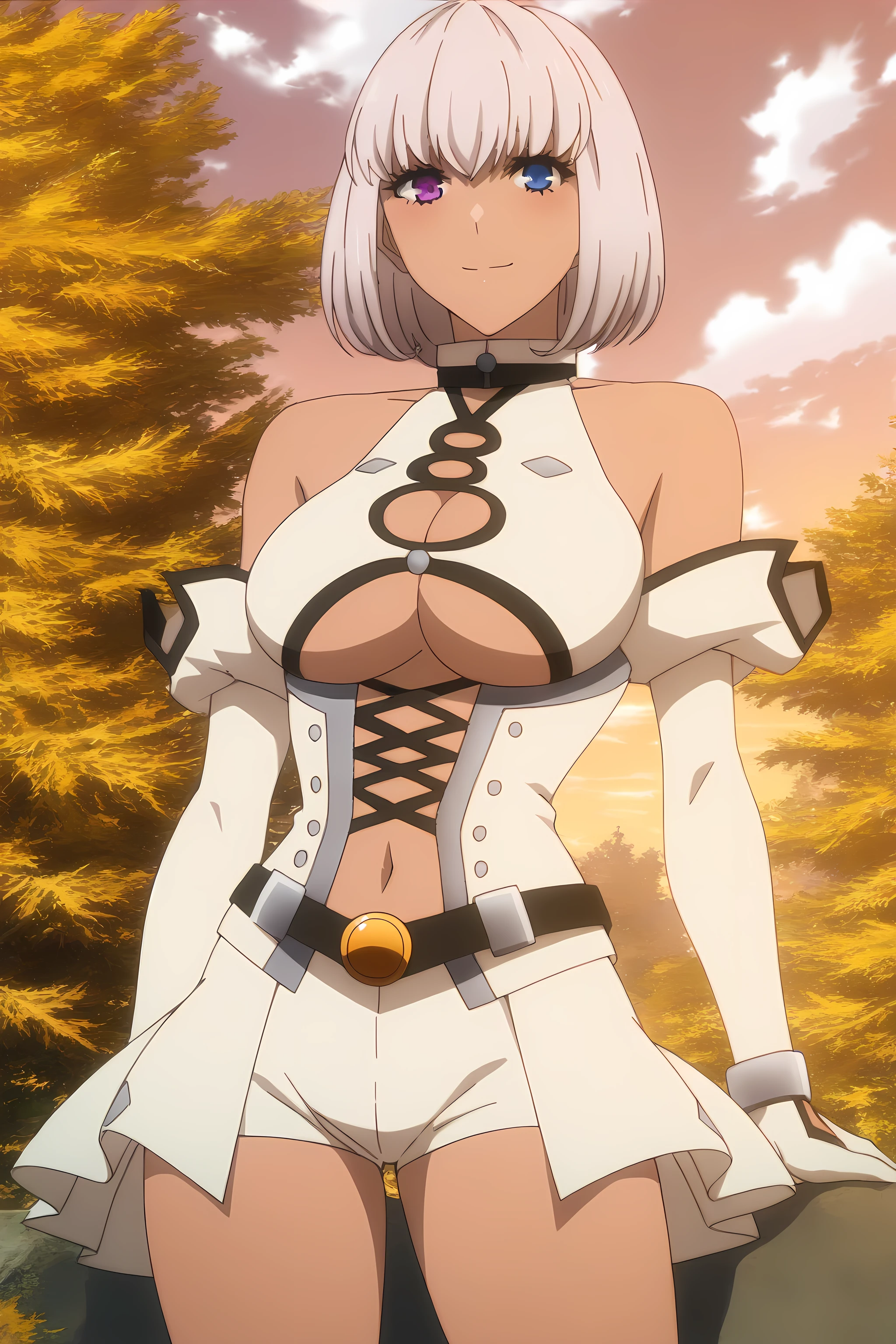 Activation tag is "alma_judikhali, 1girl, short hair, grey hair, dark-skinned female, dark skin, heterochromia, purple eyes, blue eyes, large breasts,", and outfit tag is "gloves, shorts, underboob, black boots, white gloves, elbow gloves, bare shoulders, thighhighs, black footwear, " variant of outfit is "gloves, shorts, underboob, black boots, white gloves, elbow gloves, white cape, thighhighs, black footwear, " with additional style change of "anime coloring" tag.
