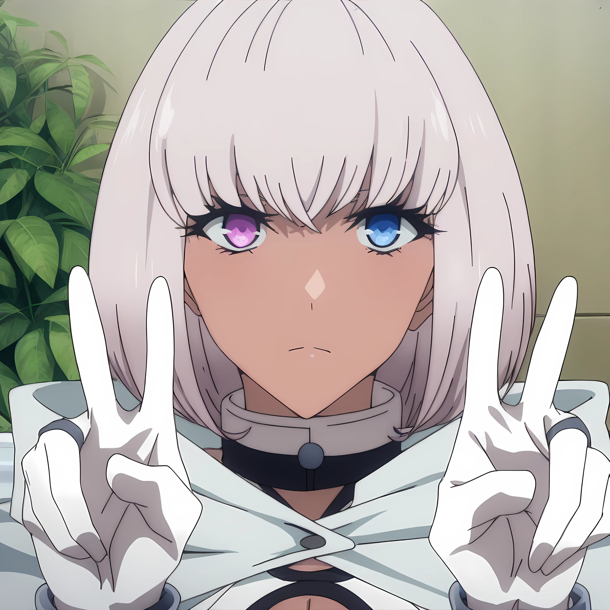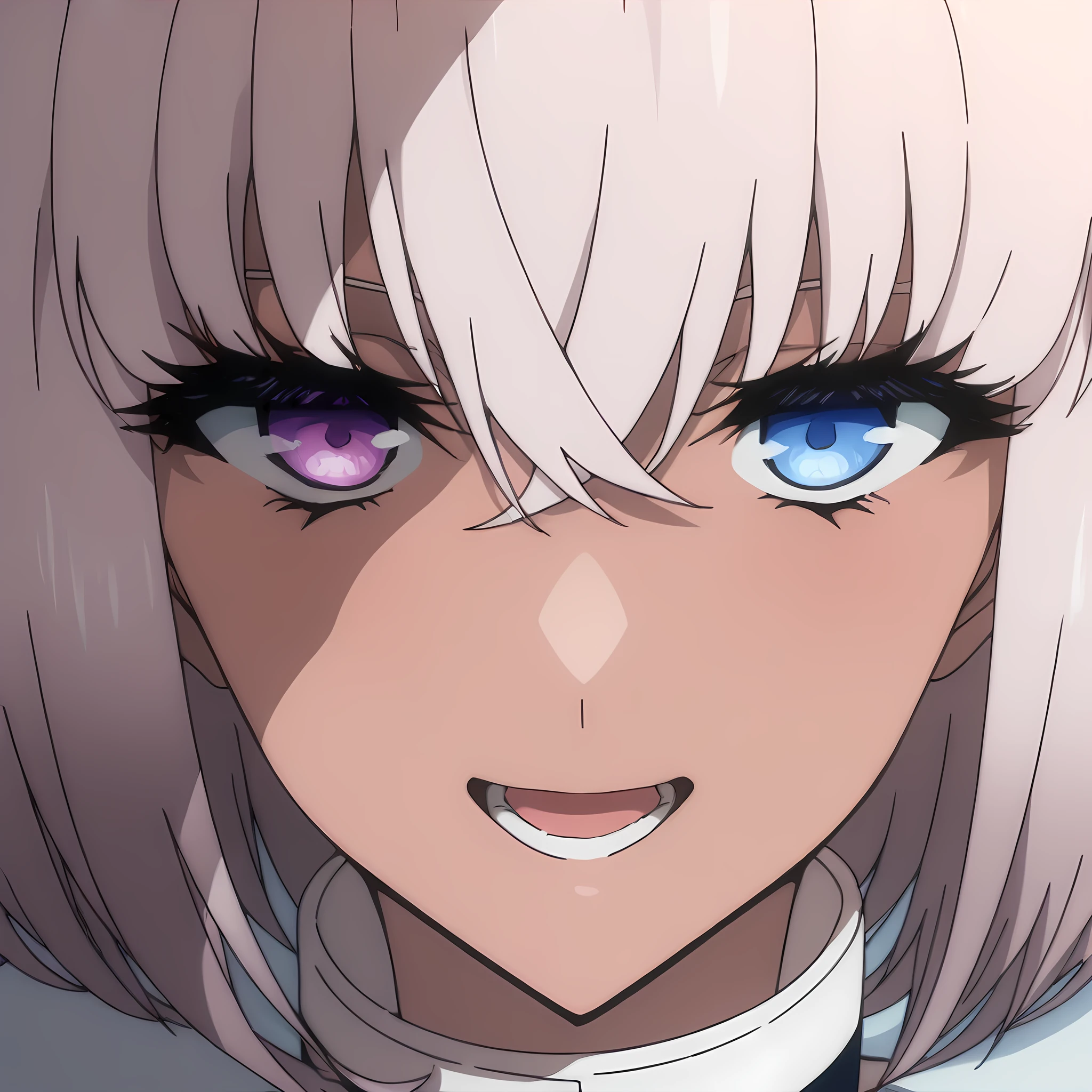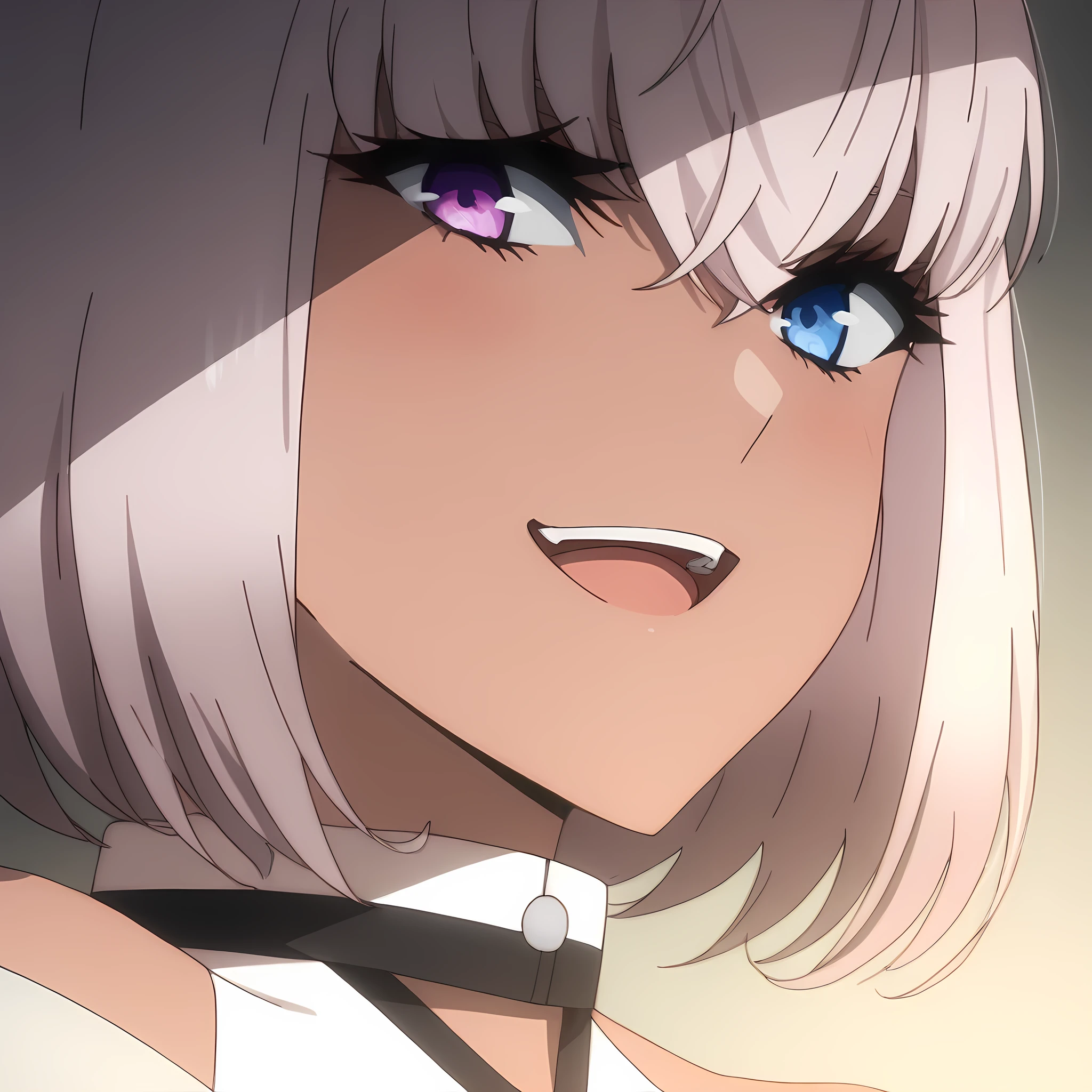 Activation tag is "alma_judikhali, 1girl, short hair, grey hair, dark-skinned female, dark skin, heterochromia, purple eyes, blue eyes, large breasts,", and outfit tag is "gloves, shorts, underboob, black boots, white gloves, elbow gloves, bare shoulders, thighhighs, black footwear, " variant of outfit is "gloves, shorts, underboob, black boots, white gloves, elbow gloves, white cape, thighhighs, black footwear, " with additional style change of "anime coloring" tag.