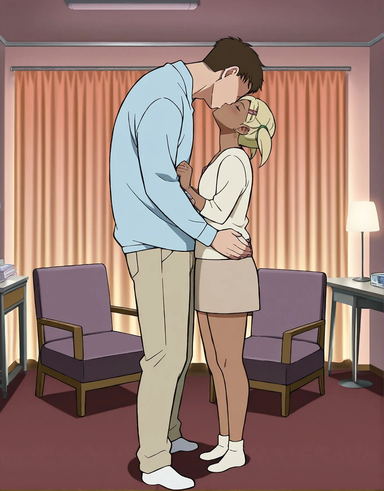 1girl,1boy,hetero,kiss,closed eyes, huge guy,(size difference:1.3) ,cuddling,