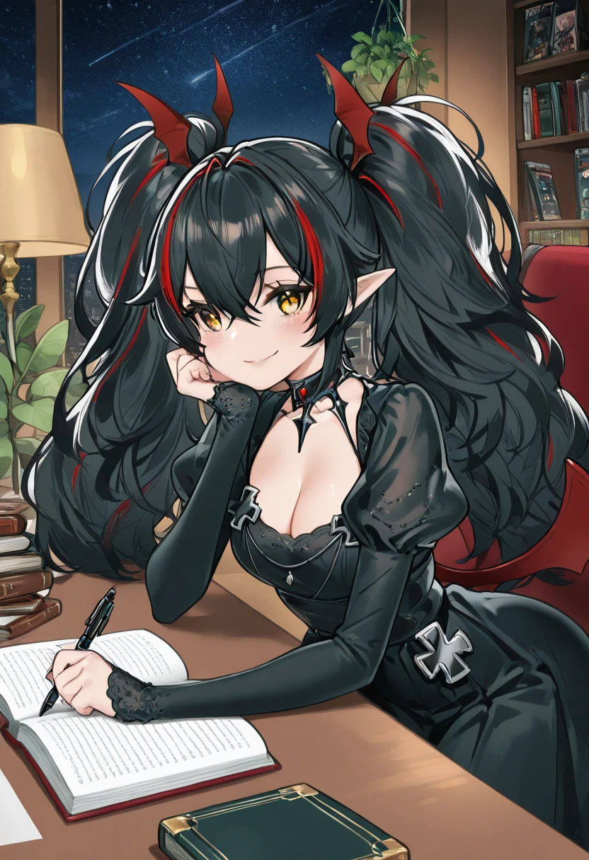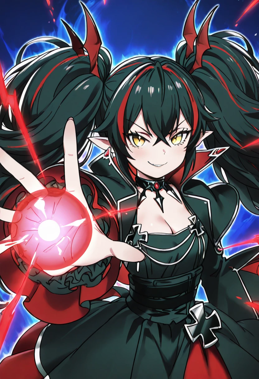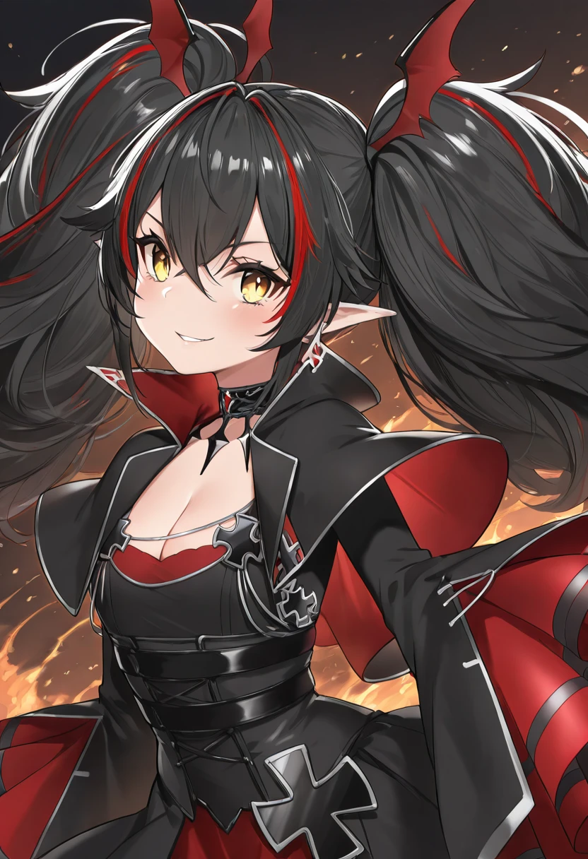 zZ24, hair between eyes, yellow eyes, black hair, hair ornament, long hair, multicolored hair, pointy ears, red hair, streaked hair, twintails, two-tone hair, wing hair ornament, cross, cleavage, black choker, iron cross, choker, dress, wings, black dress,