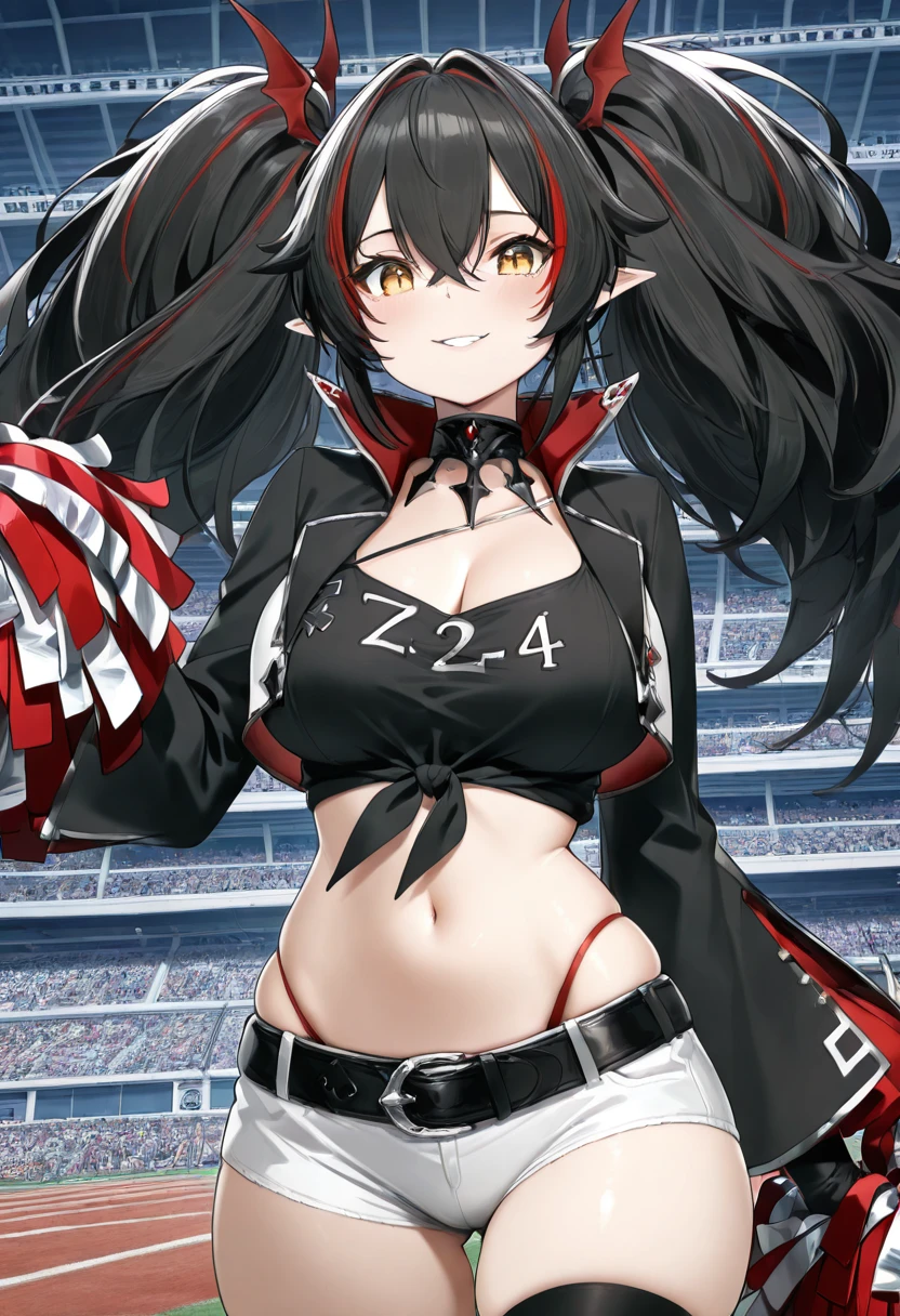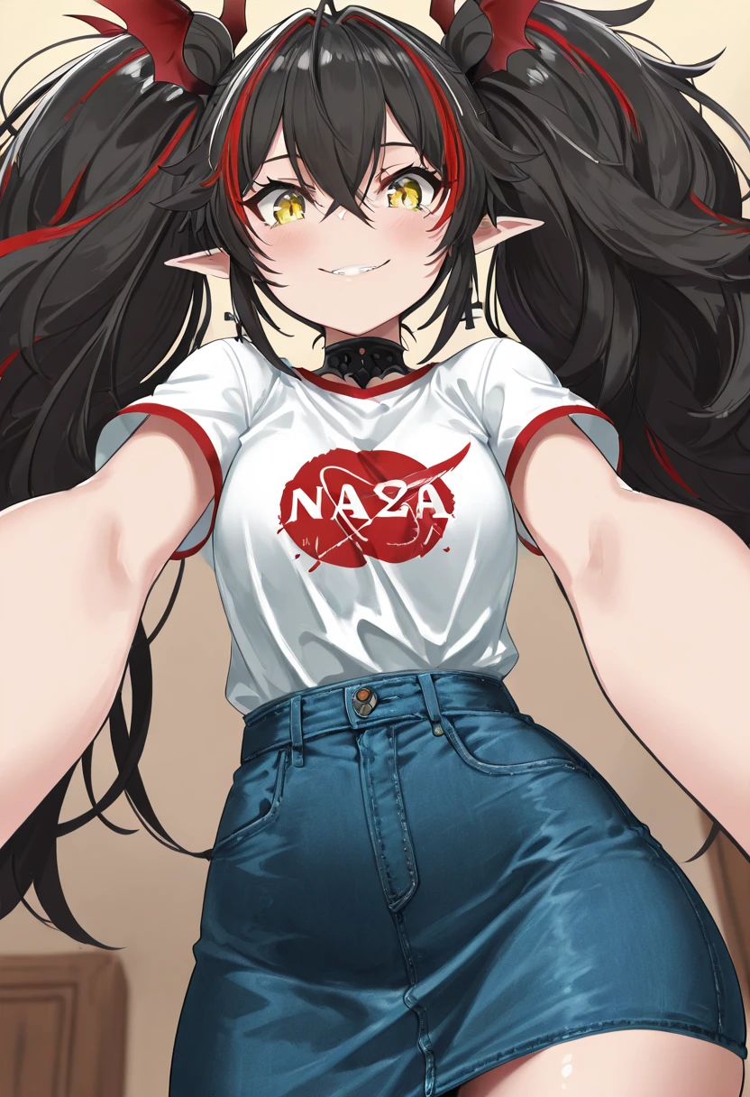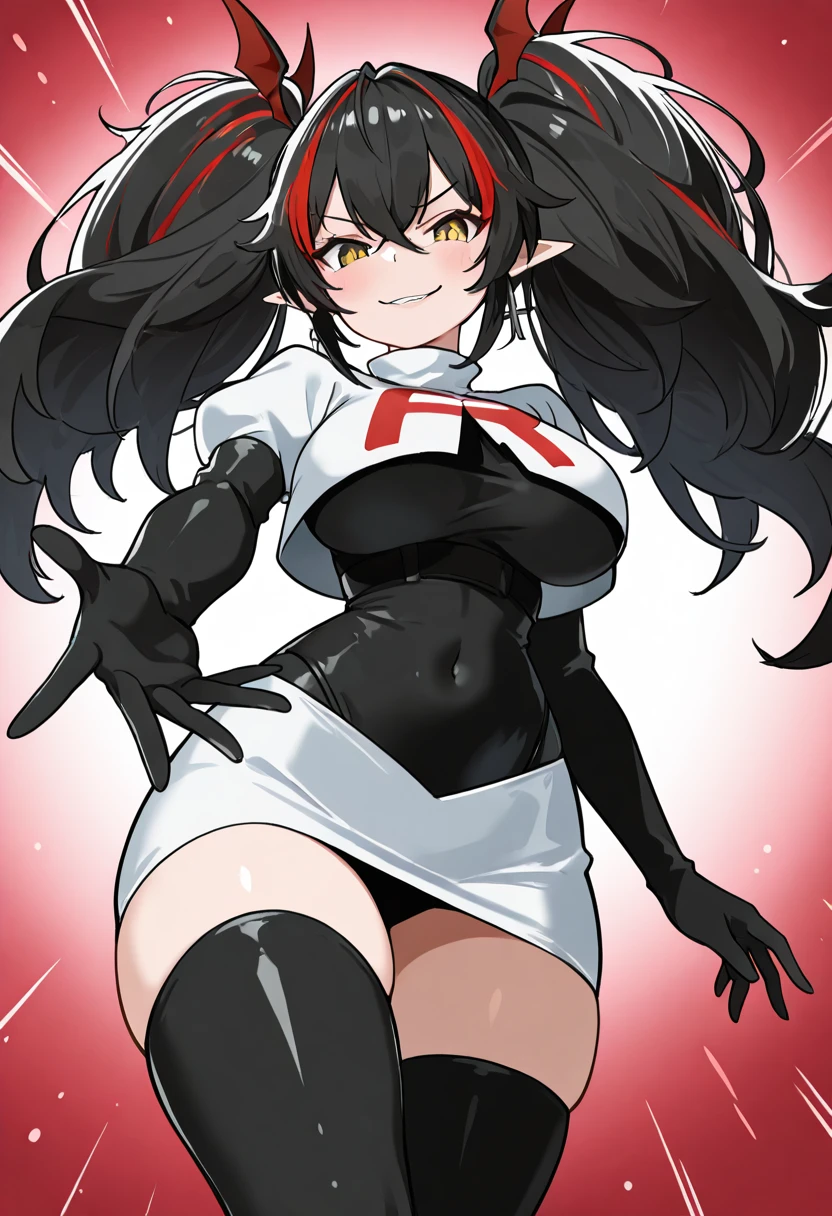 zZ24, hair between eyes, yellow eyes, black hair, hair ornament, long hair, multicolored hair, pointy ears, red hair, streaked hair, twintails, two-tone hair, wing hair ornament,