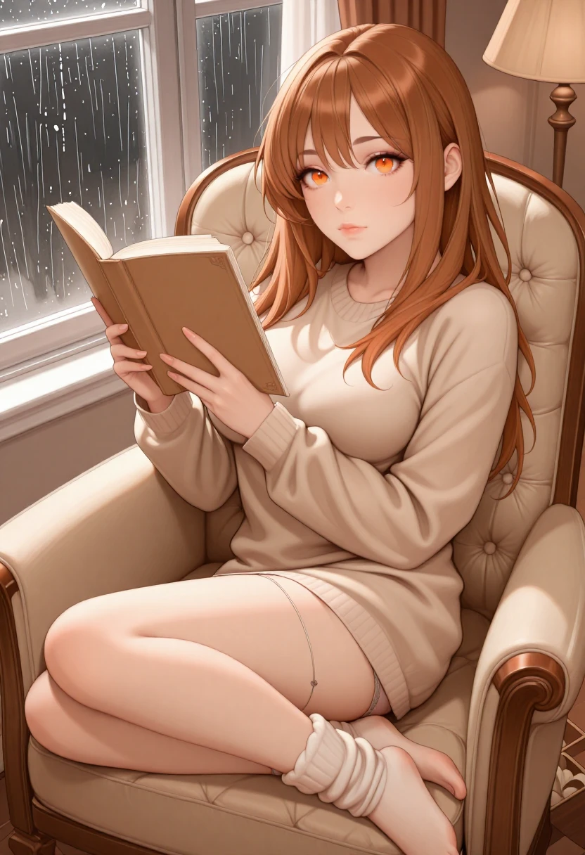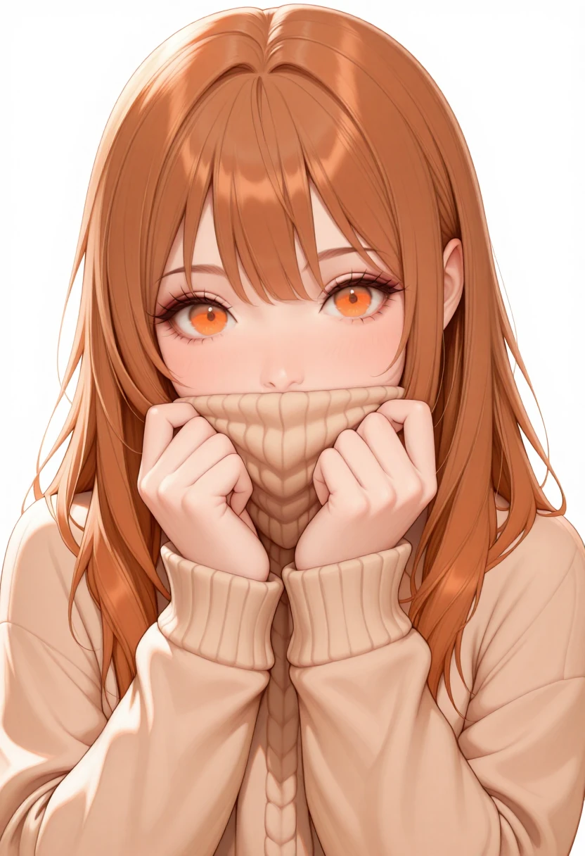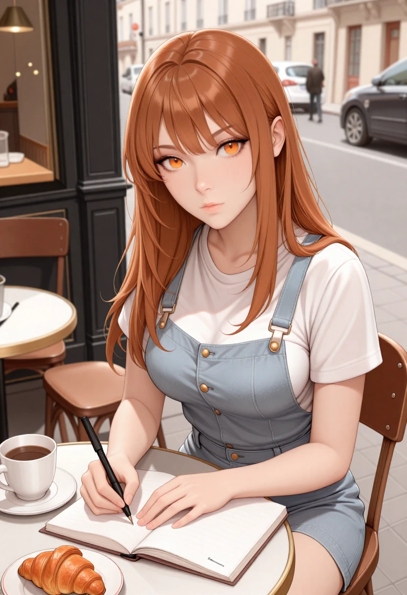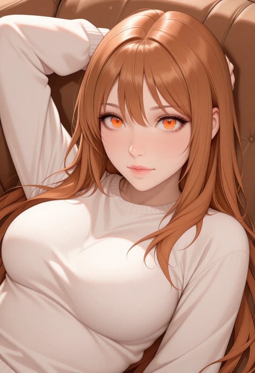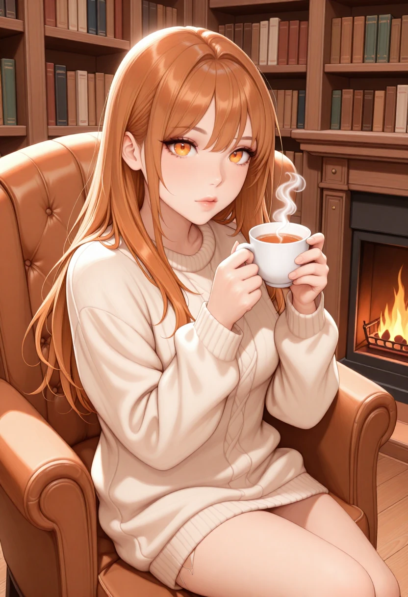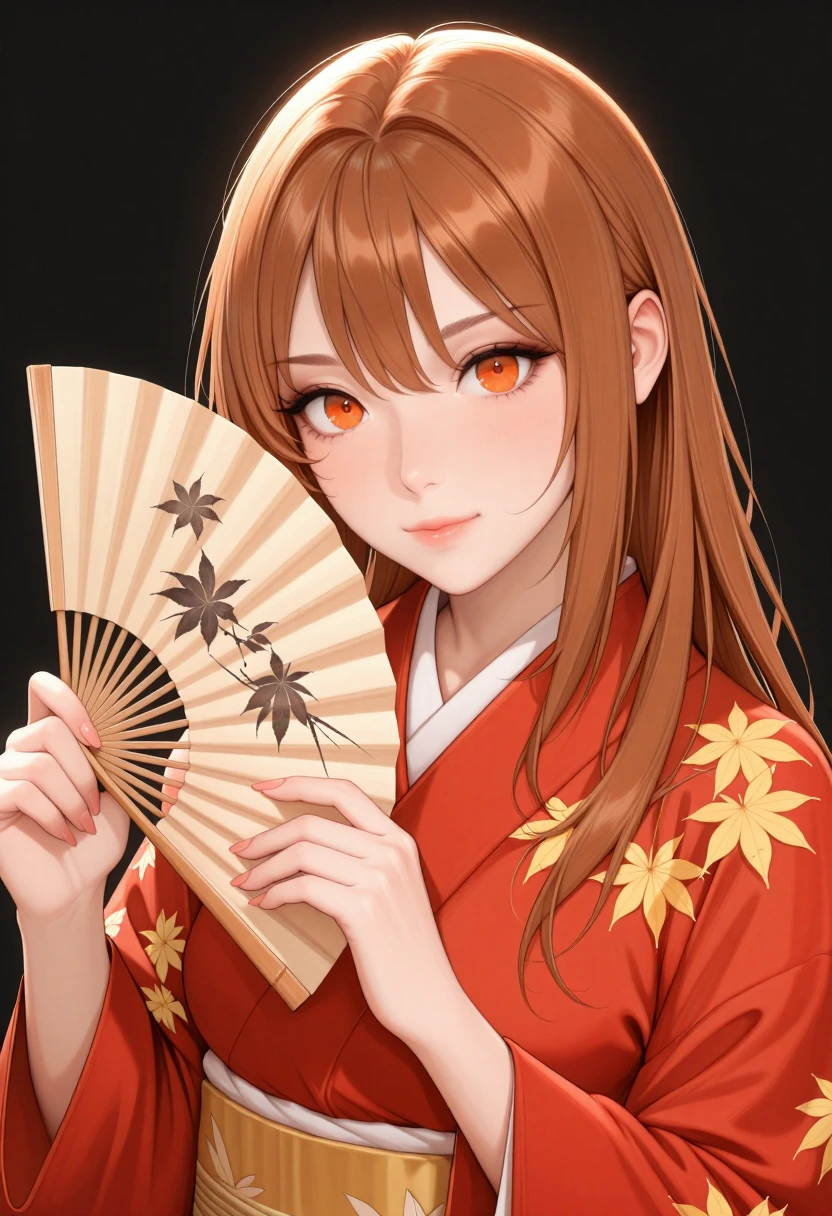 This is a highly detailed digital illustration in a realistic anime style, showcasing a young woman named Sophie Ellenblume with a slender, tall physique, medium-sized breasts and a fair, porcelain-like complexion. She has long, straight, auburn hair with bangs that frame her face, and striking, almond-shaped eyes that are a vibrant amber color. Her facial features are delicate, with a small, slightly upturned nose and full lips.