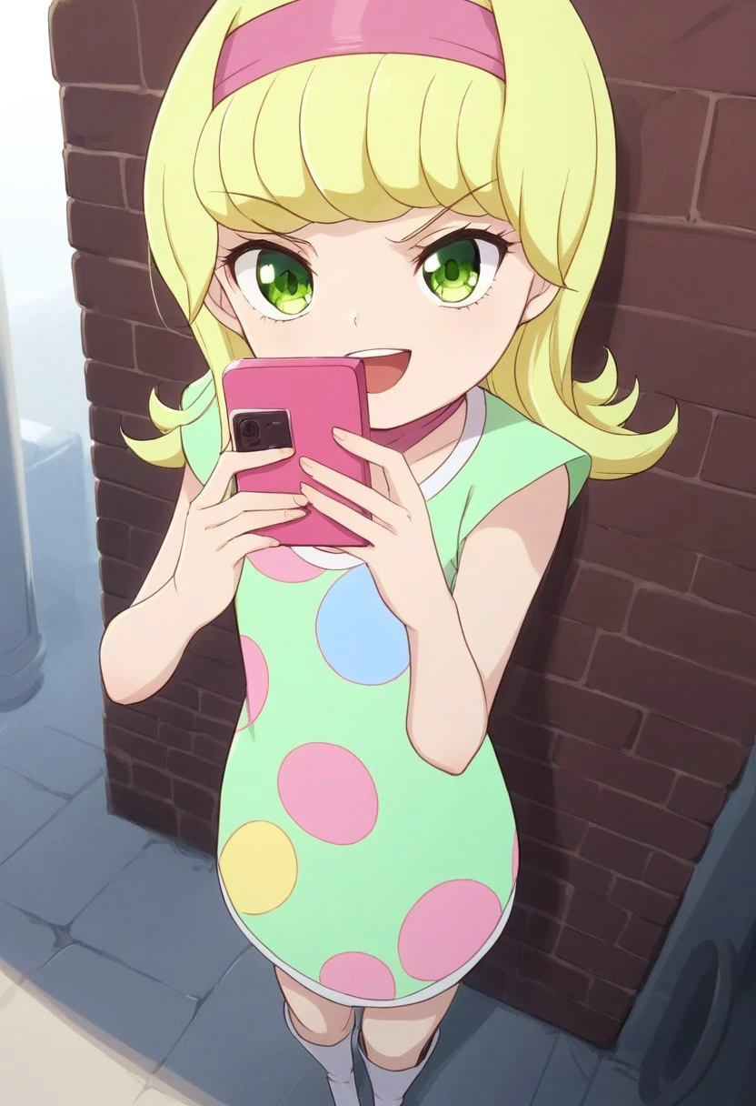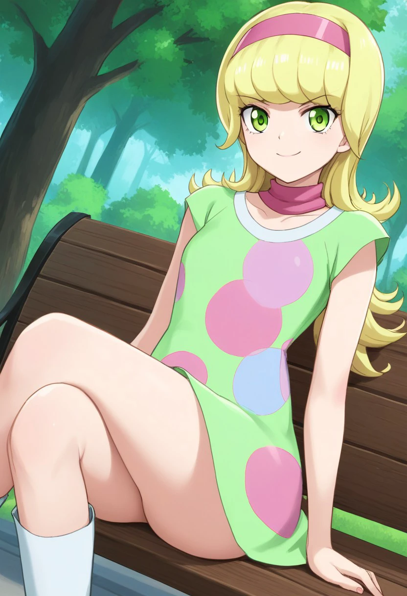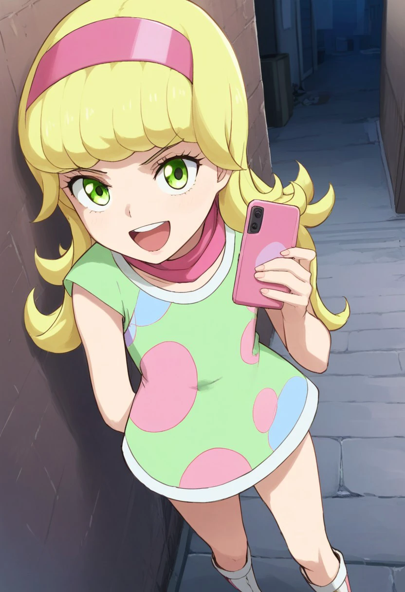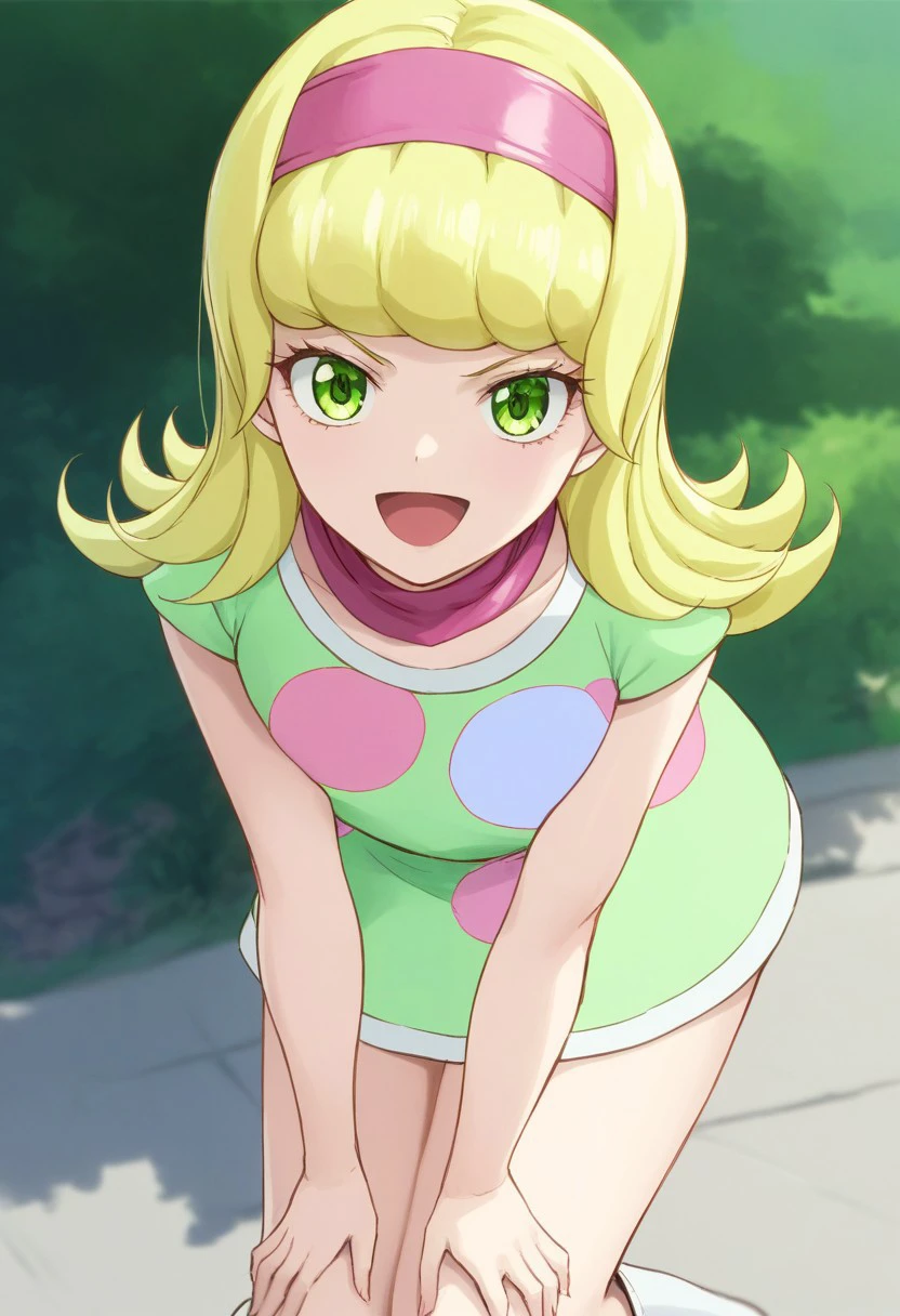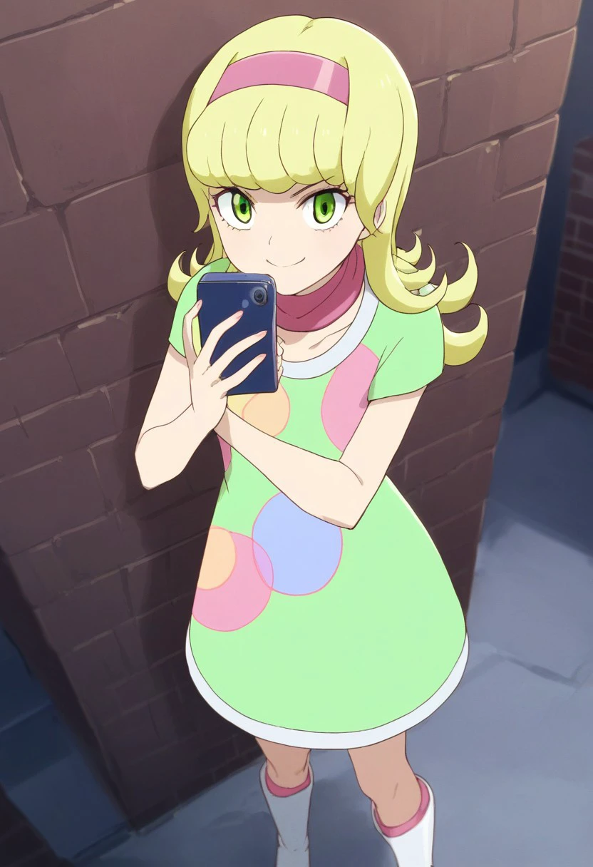 pink headband, green dress, polka dot-patterned dress, pink scarf, thighs, white boots