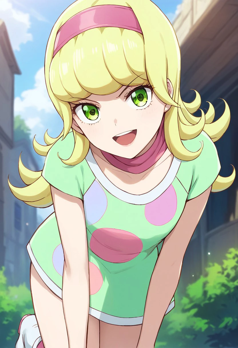 yuna goha, long hair, blonde hair, swirly bangs, green eyes