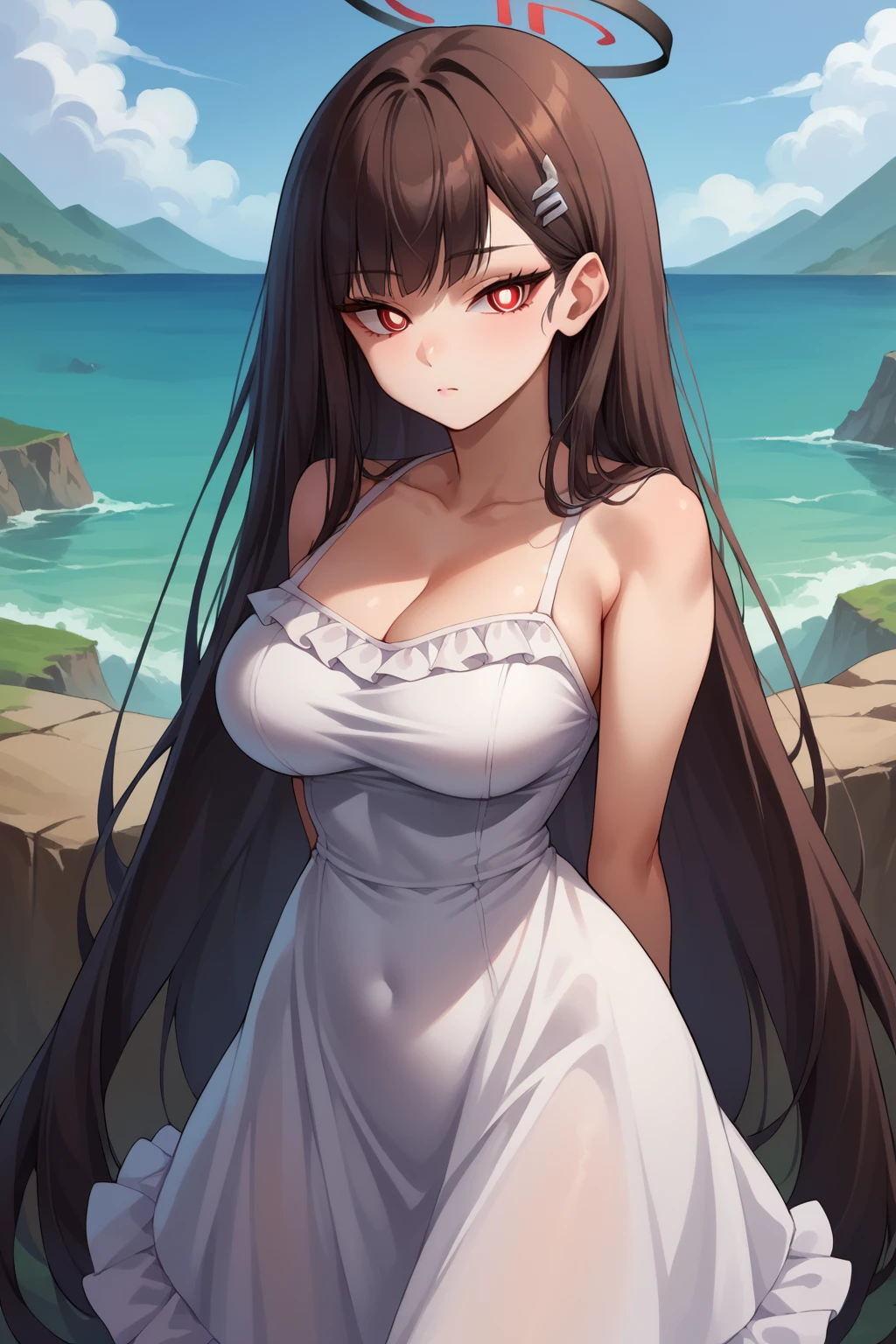 rioba, red eyes, ringed eyes, white pupils, halo, medium breasts, very long hair, hairclip