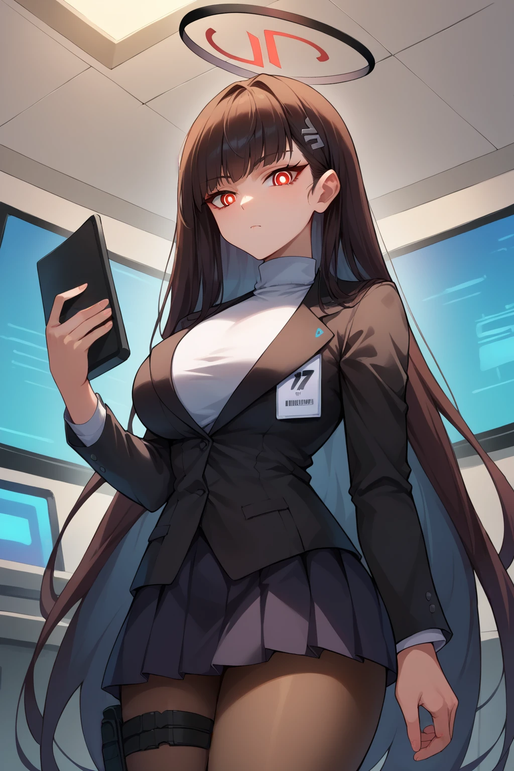 Outfit 1 : black jacket, id card, white turtleneck, black skirt, thigh holster, pantyhose