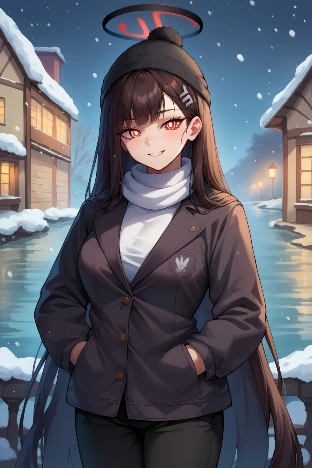 Character trigger : rioba, red eyes, ringed eyes, white pupils, halo, medium breasts, very long hair, hairclip