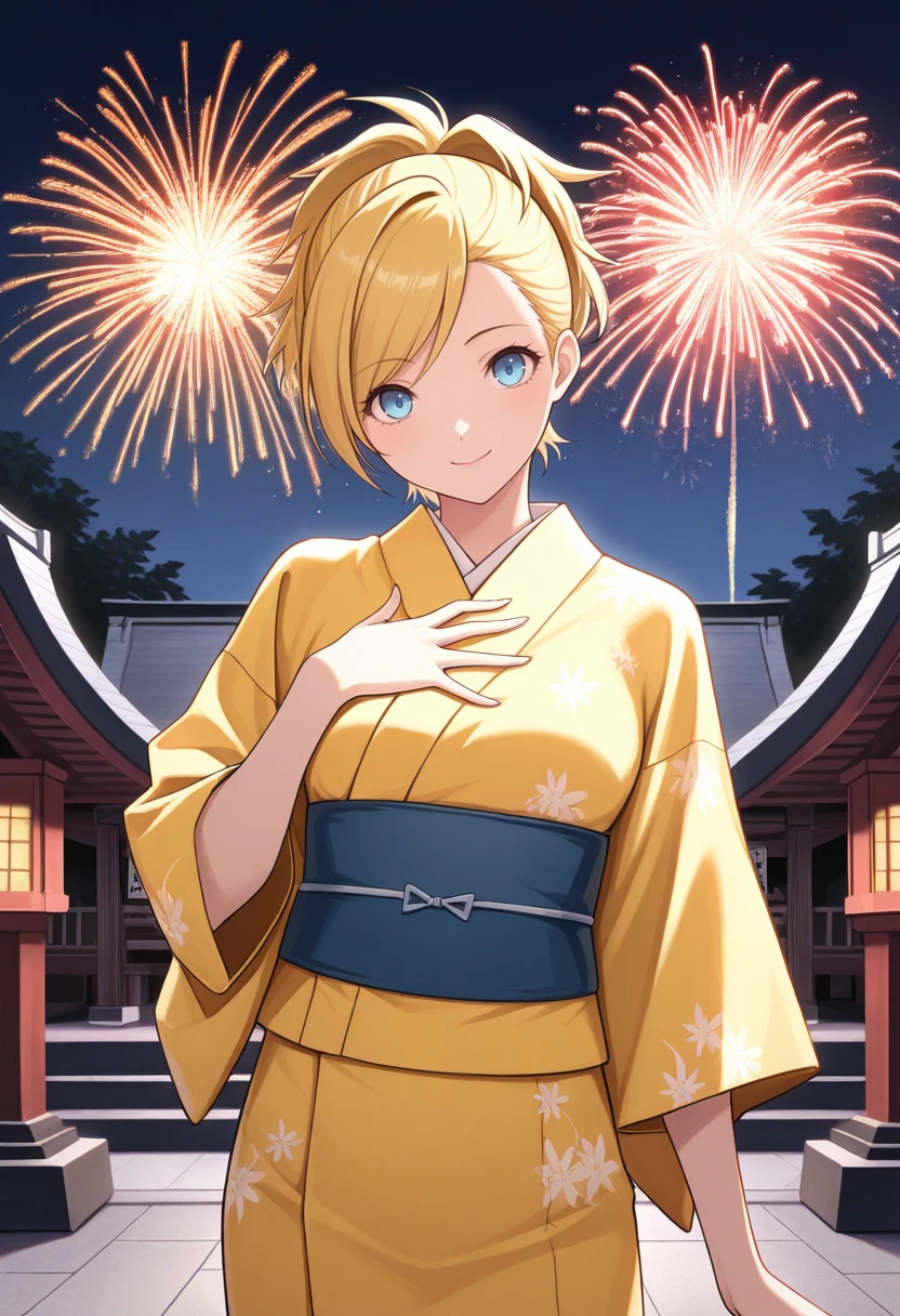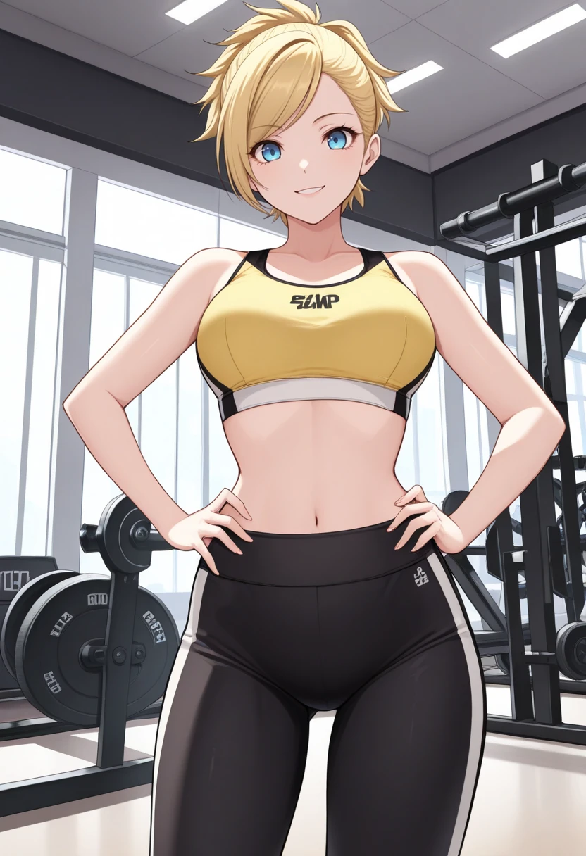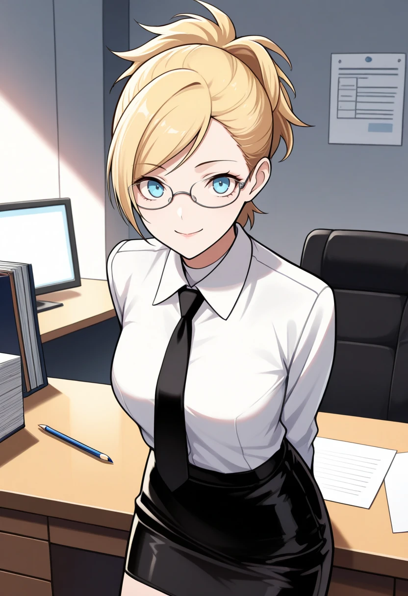 l1s4p2, blonde hair, short hair, ponytail, blue eyes, black school uniform, long sleeves, orange ribbon, skirt, knee socks