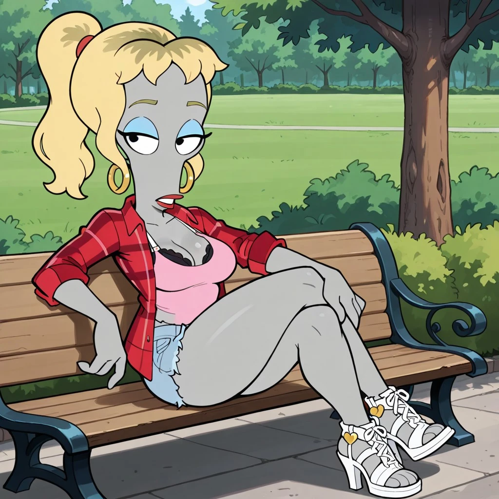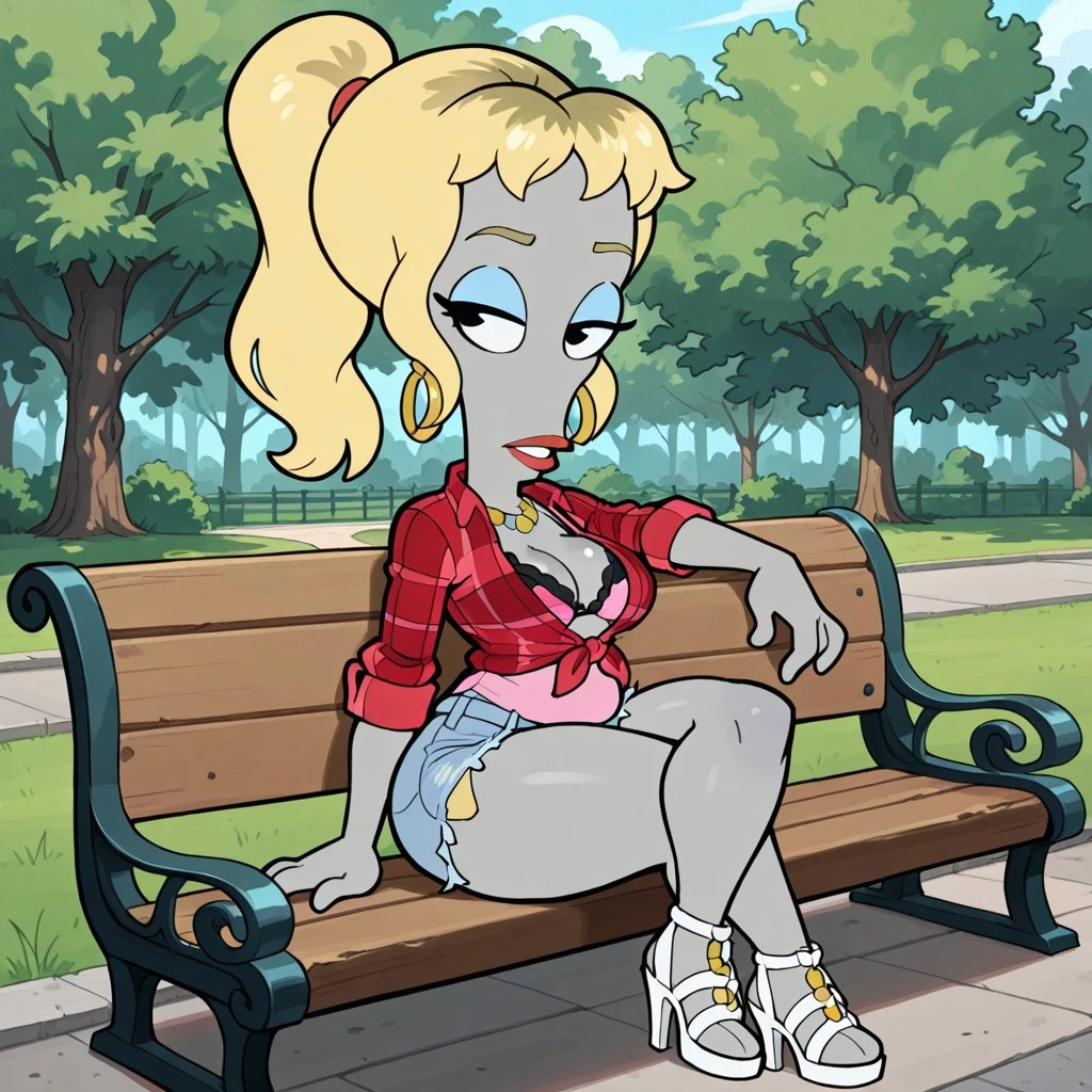alien female, solo, gray skin, no ears, gold hoop earrings, black eyes, blue eyeshadow, blonde hair with brown accents, red flannel shirt, pink undershirt, breasts, frayed jean shorts, visible black bra, white strap heels, red lips,