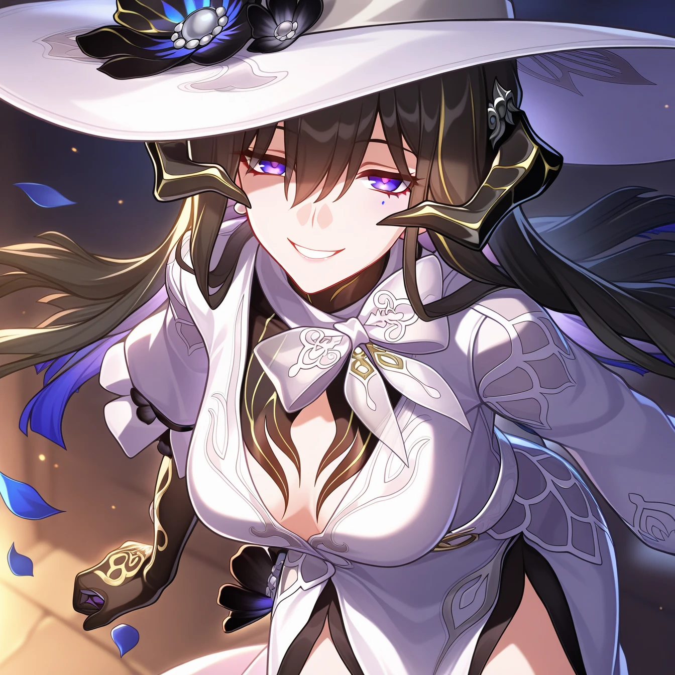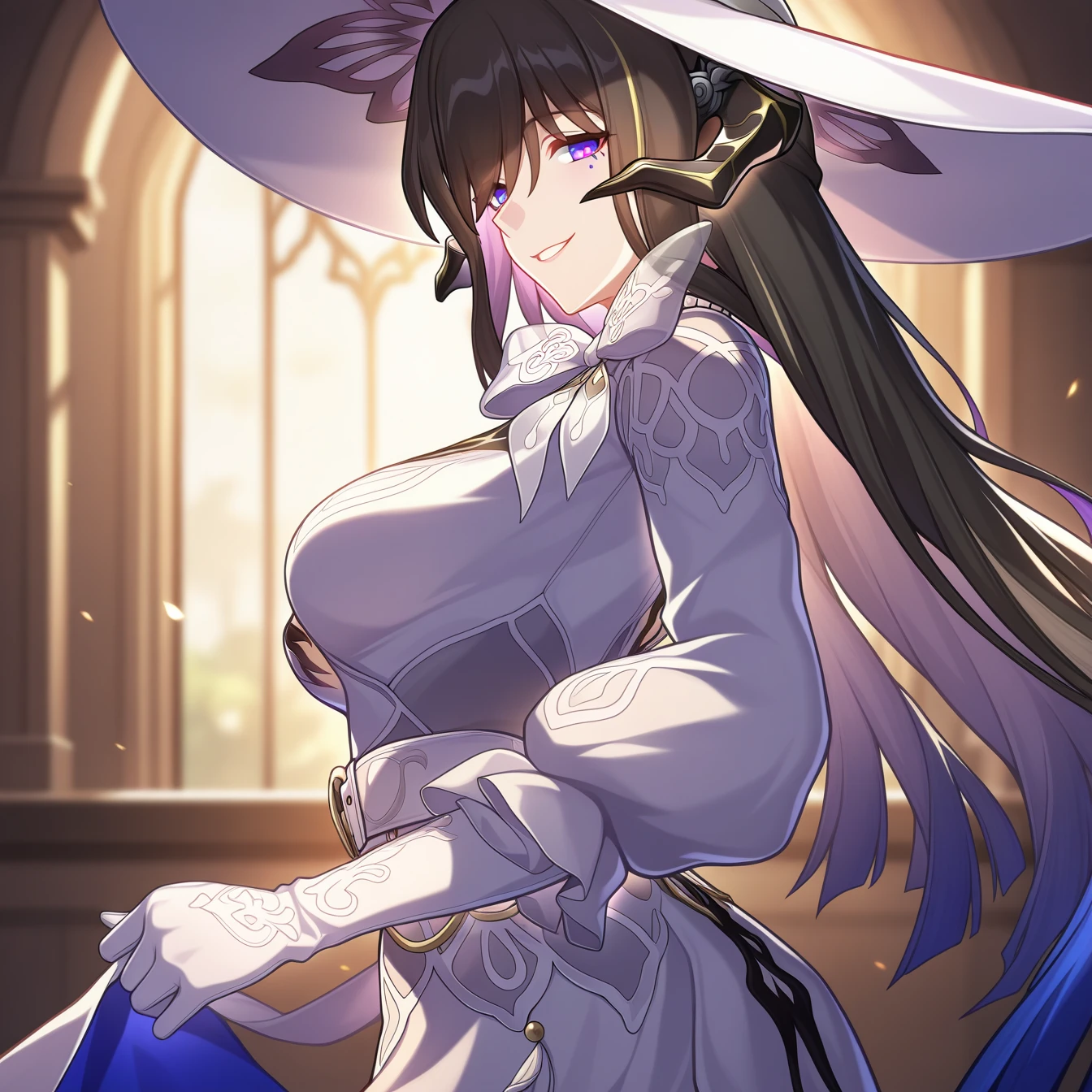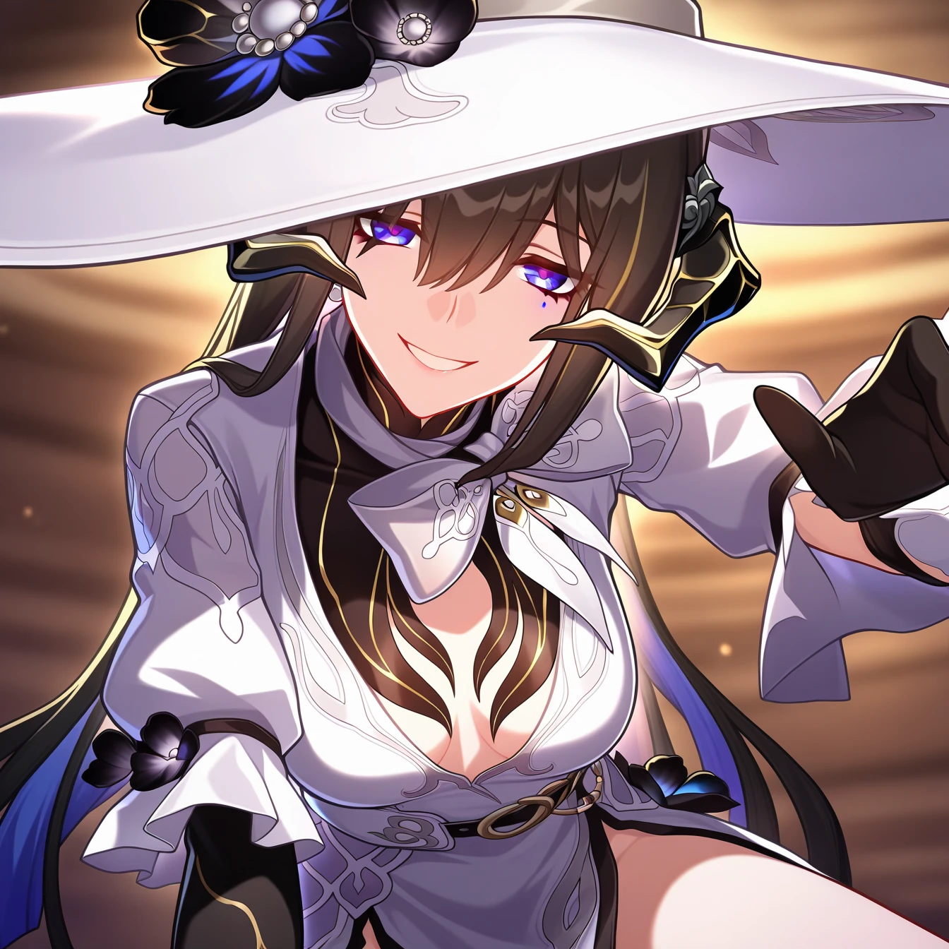 masterpiece, best quality, amazing quality, very aesthetic, 1girl, solo, Constance, hat, dress, looking at viewer, cowboy shot, smile,