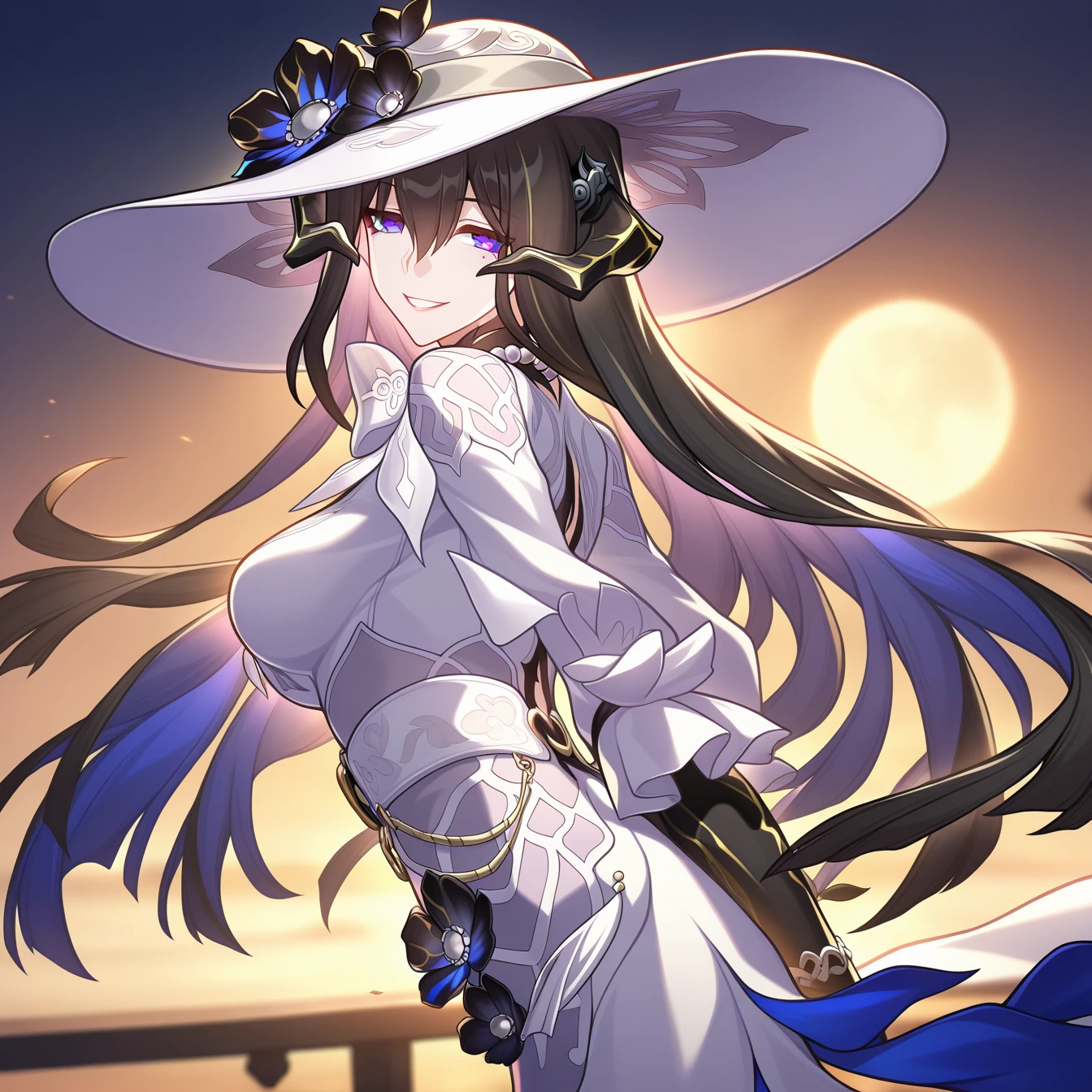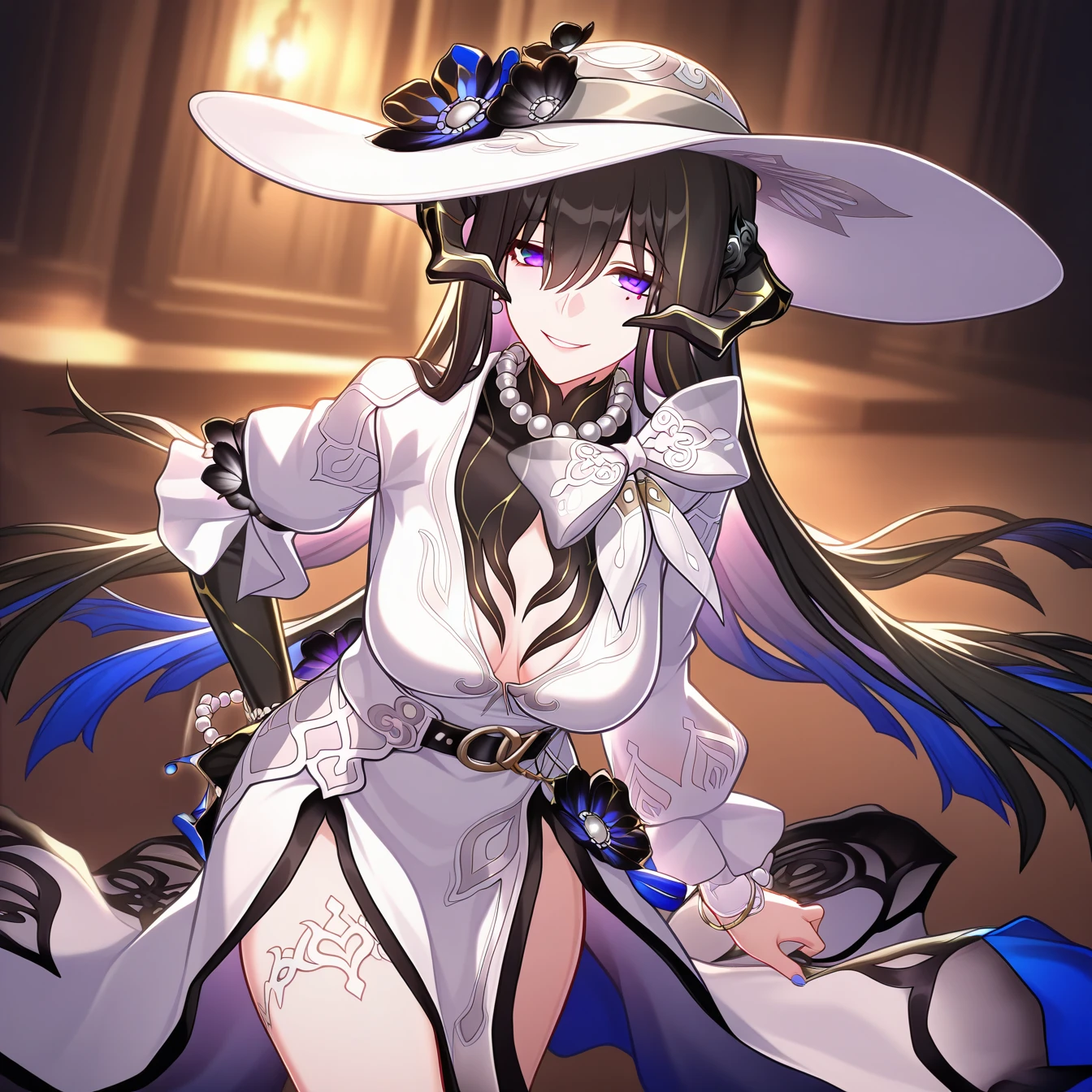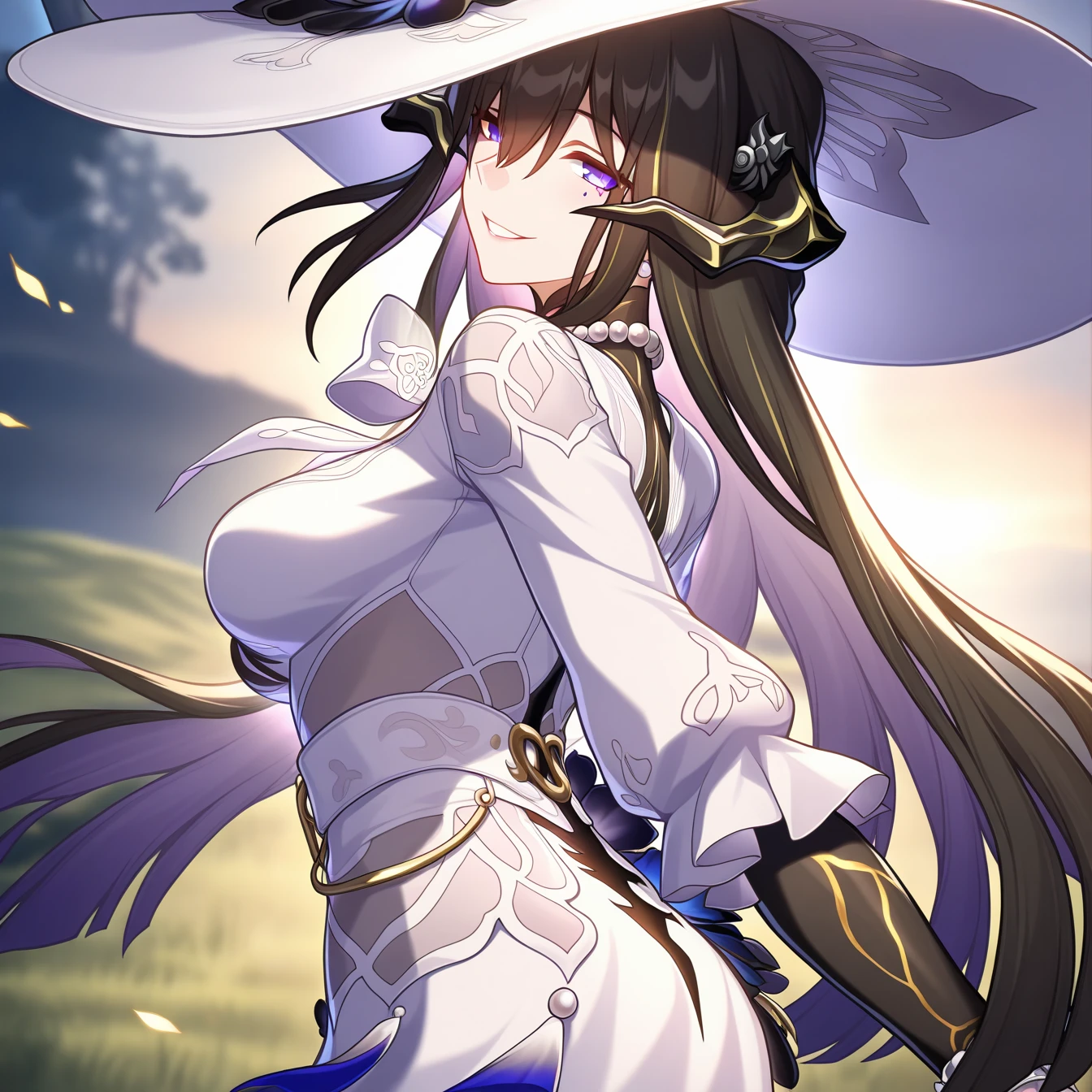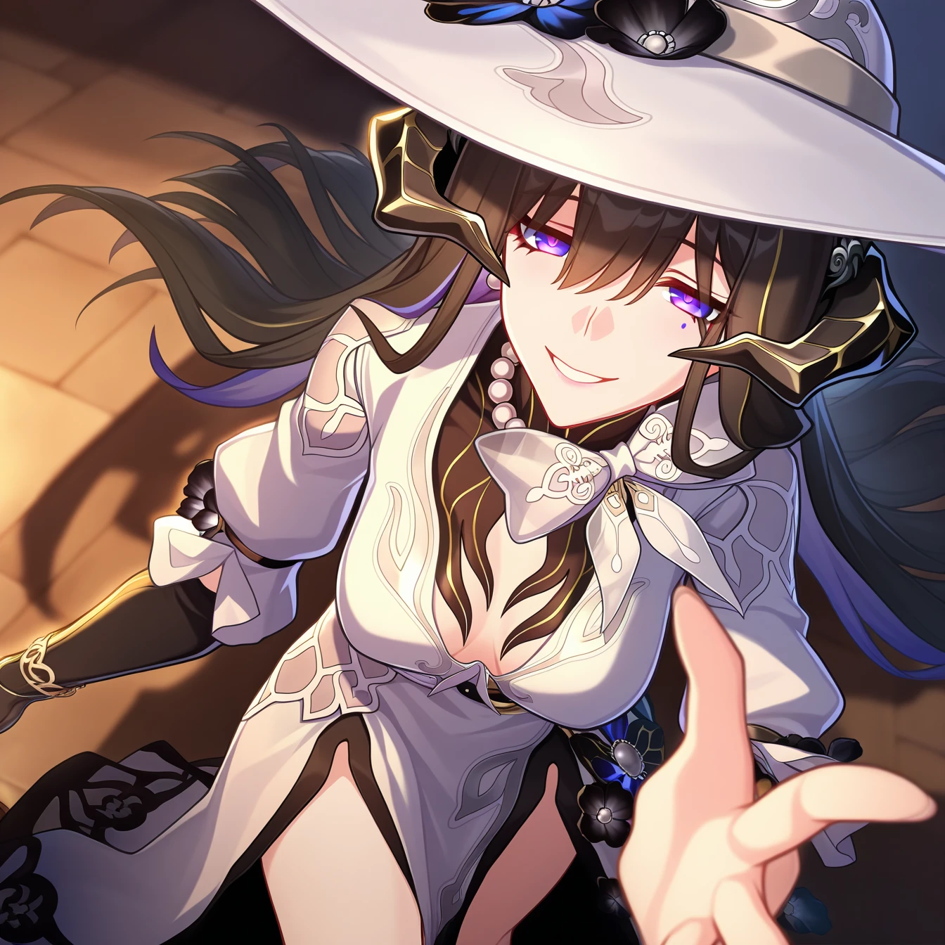 masterpiece, best quality, amazing quality, very aesthetic, 1girl, solo, Constance, hat, dress, looking at viewer, cowboy shot, smile,