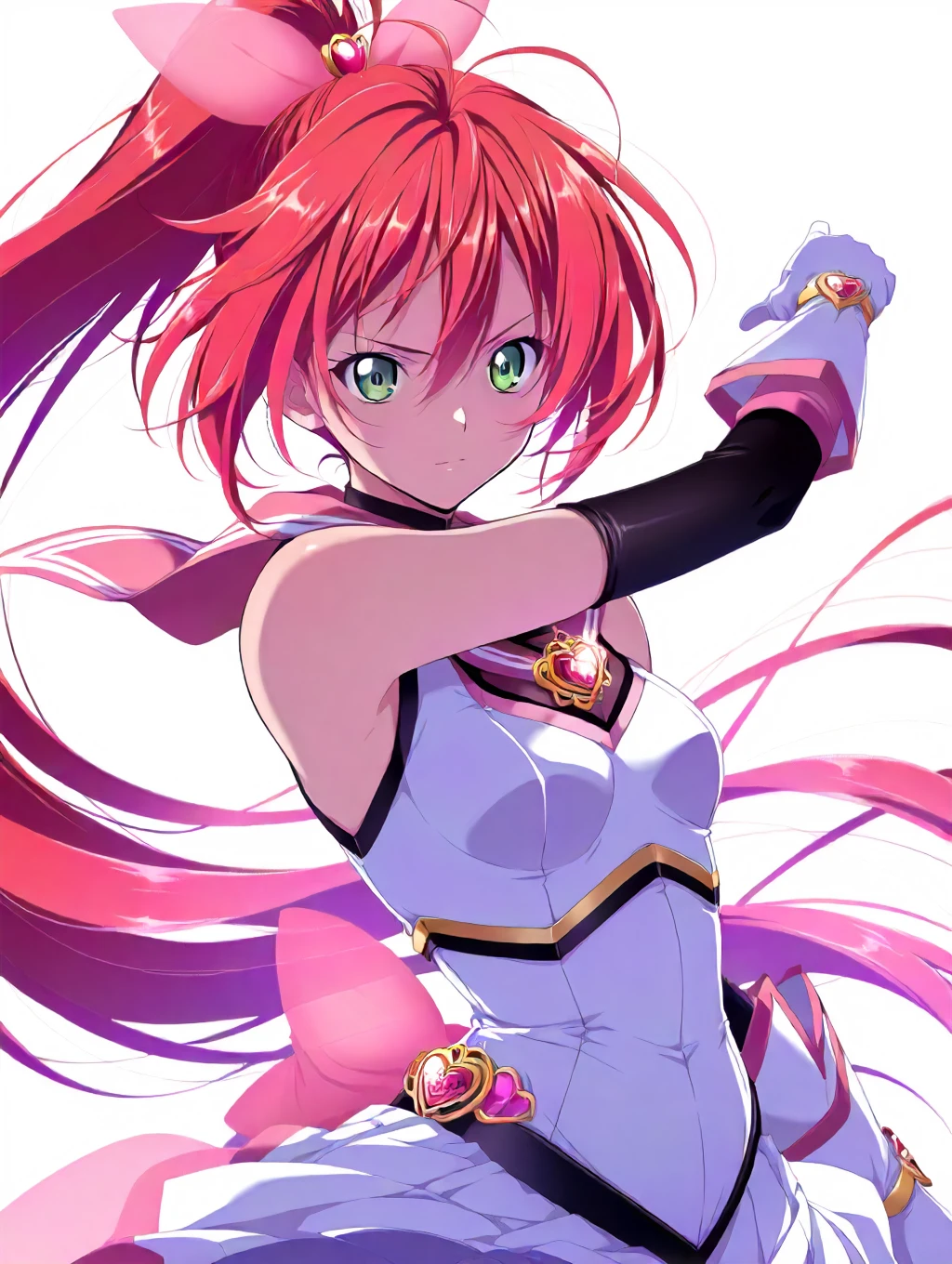 shanji,1girl,sailor collar,gloves,green eyes,elbow gloves,long hair,skirt,pink sailor collar,white gloves,red hair,white skirt,magical girl,ponytail,white leotard,