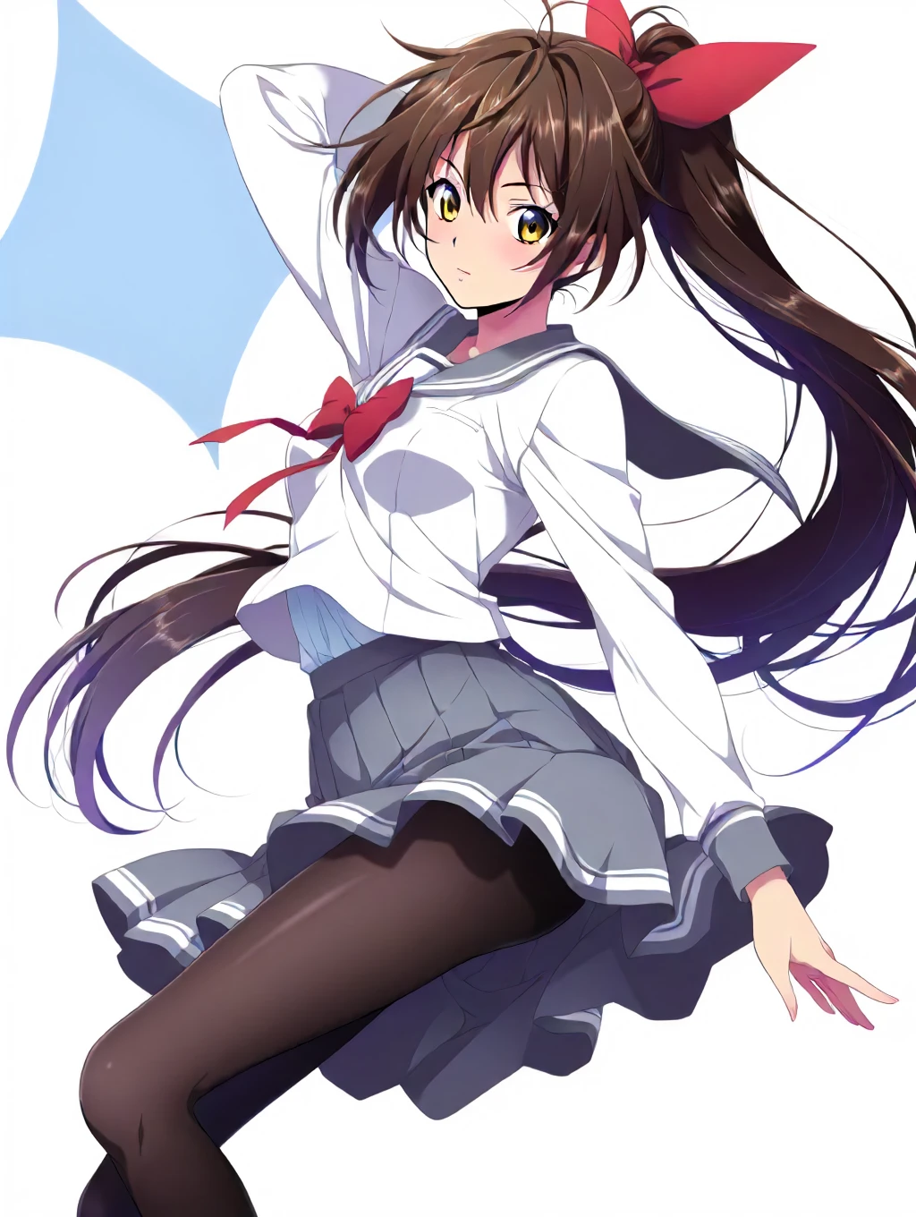 shanji,1girl,school uniform,pantyhose,long hair,brown hair,ponytail,skirt,white shirt,grey skirt,