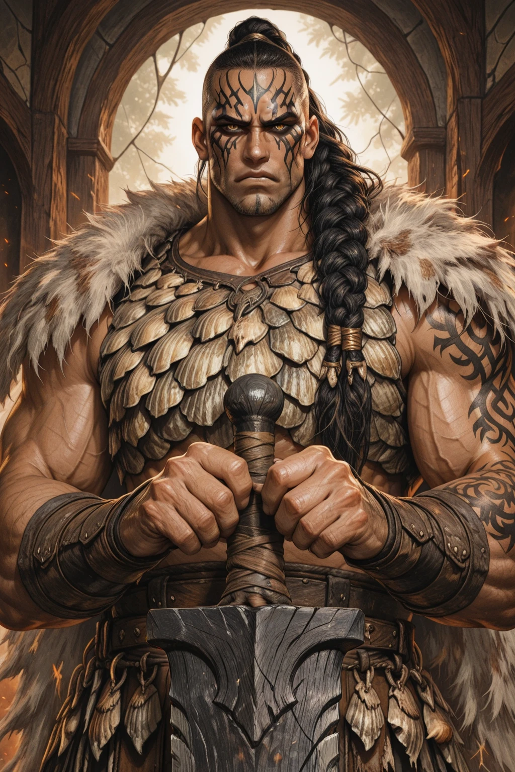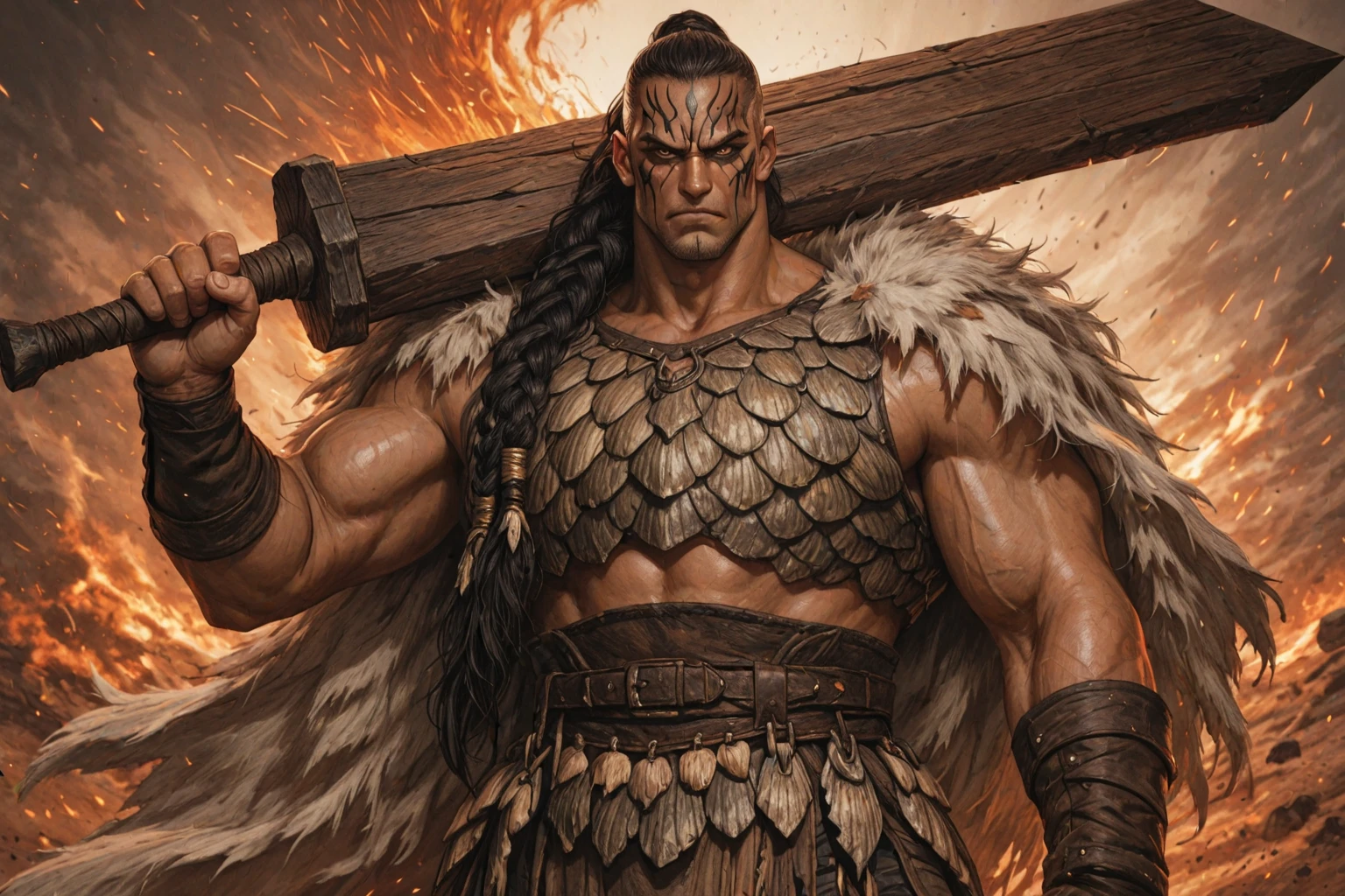 malazankarsa, 1boy, 1male, mature male, manly, muscular male, dark-skinned male, black hair, high braided ponytail, long hair, facial mark, facial tattoo, sharp teeth, shell armor, fur cape, He wields a wooden greatsword: