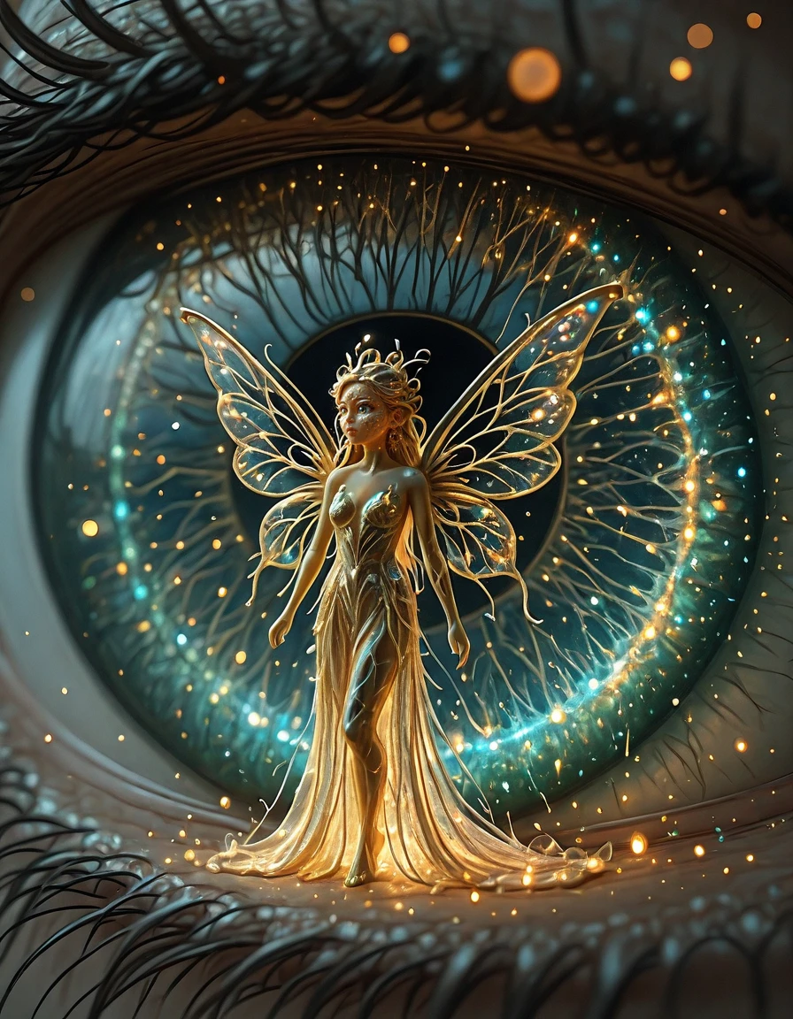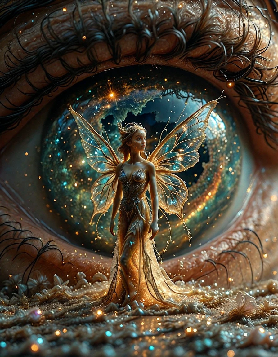 Create a weird macro shot of a fairy in front of an human eye