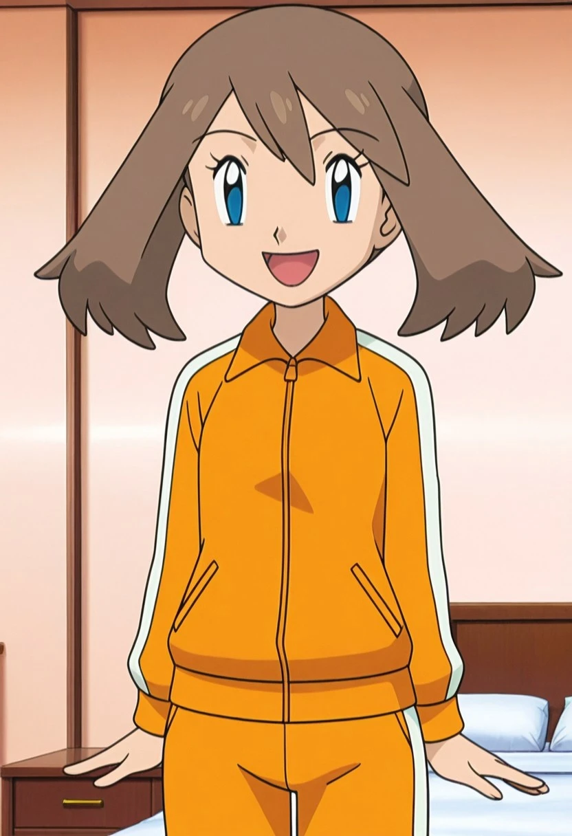 may haruka pokemon diamond and pearl anime style, medium hair, brown hair, blue eyes, eyelashes,