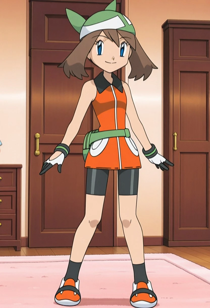 may haruka pokemon emerald outfit, green bandana, collared shirt, sleeveless shirt, orange shirt, two-tone gloves, black gloves, white gloves, fanny pack, green bag, bike shorts, black shorts, black socks, sneakers, orange shoes,