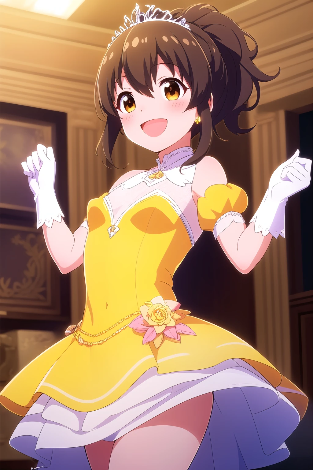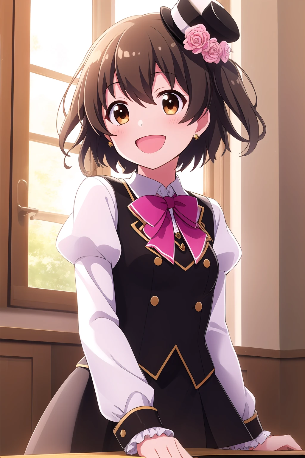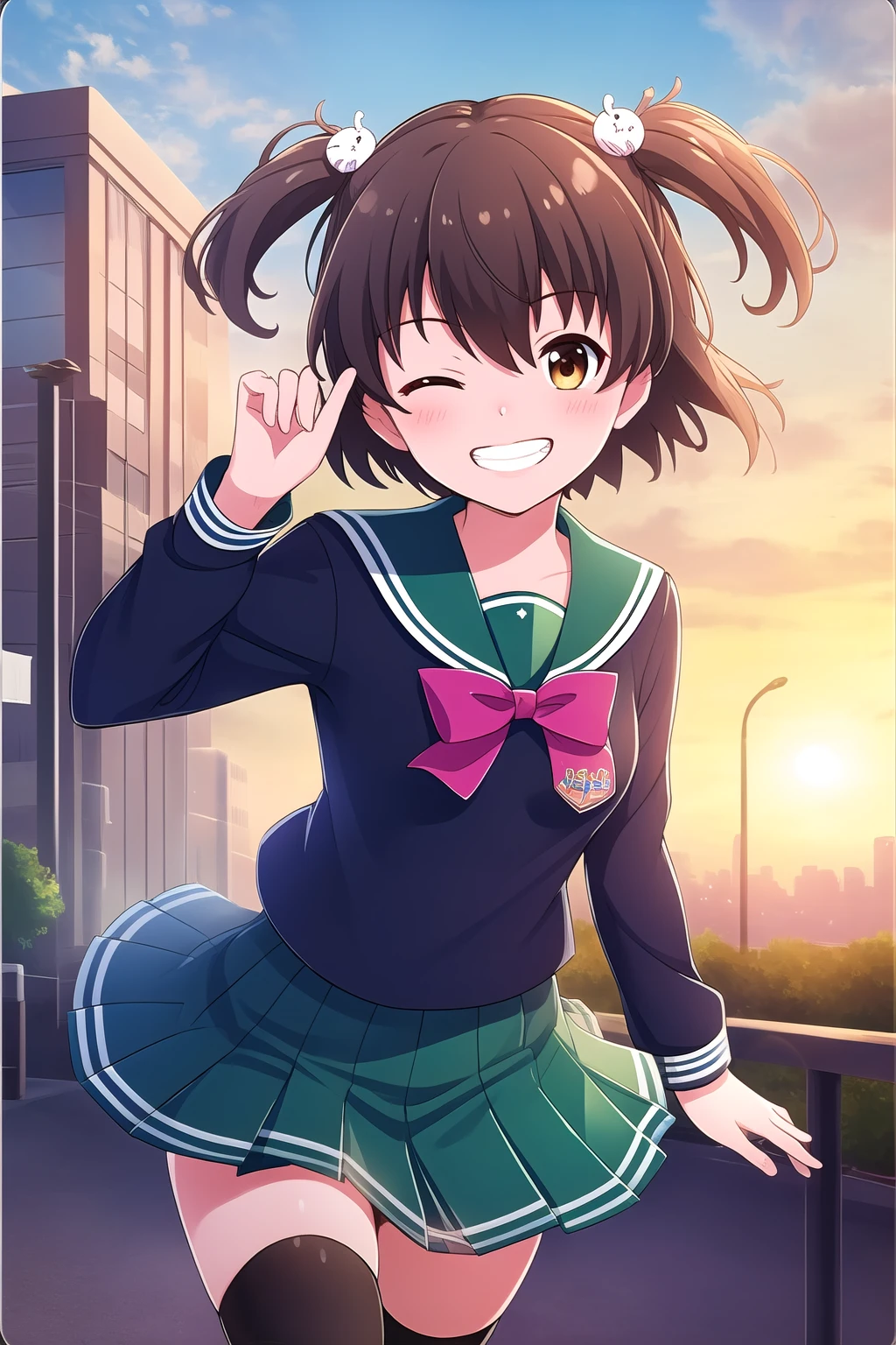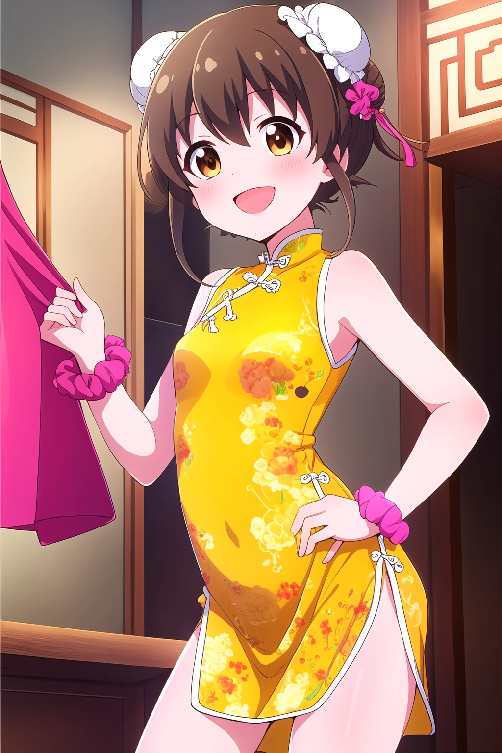 brown hair, two side up, hair ornament, hair between eyes, short hair, brown eyes