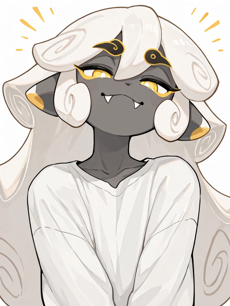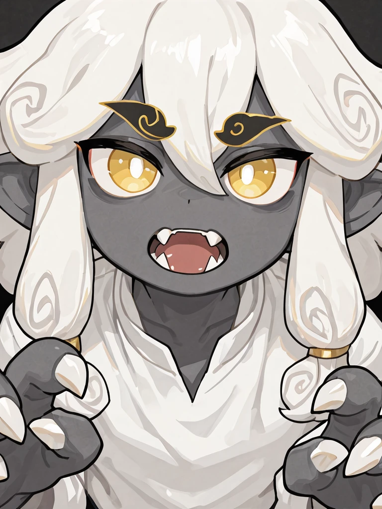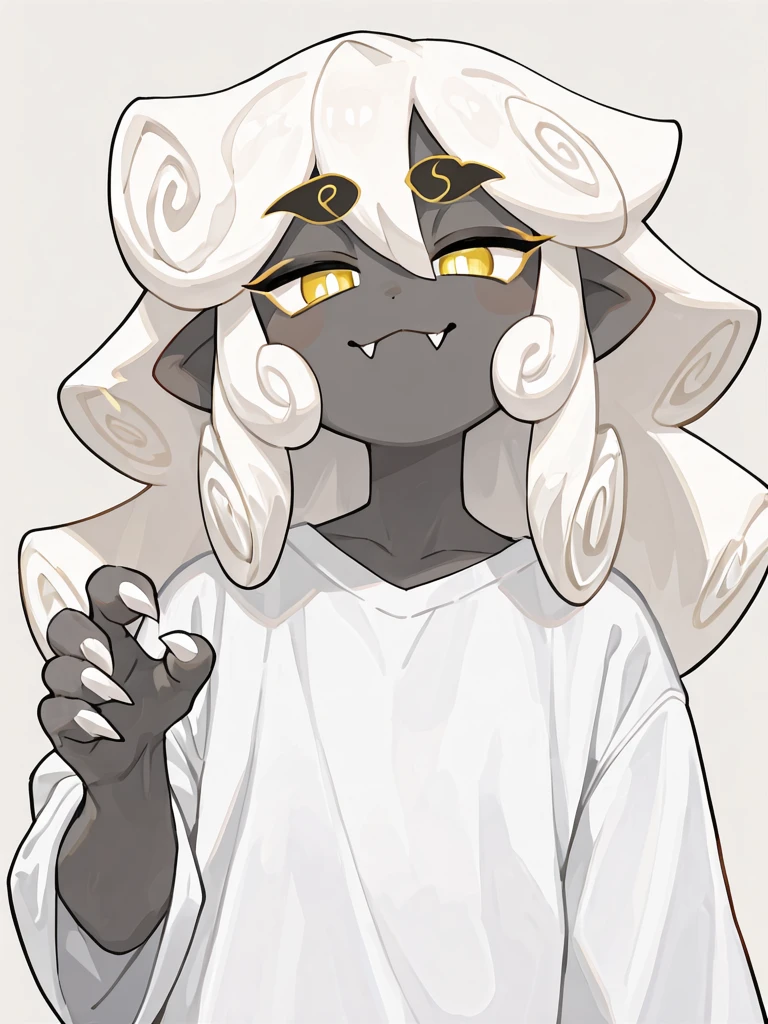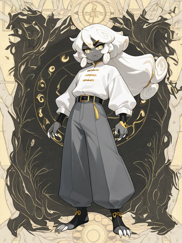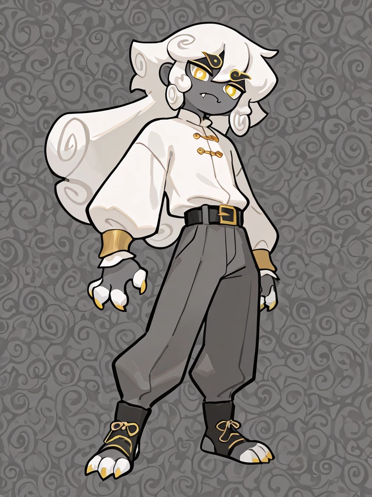 cloudhaetae, 1boy, solo, grey skin, colored skin, yellow eyes, solid color eyes, white pupils, white hair, long hair, hair rolls, fangs, claws, white shirt, belt, grey pants, full body