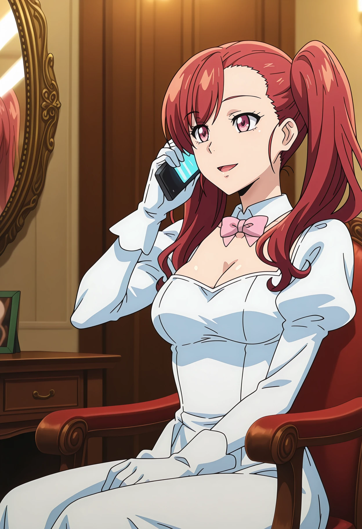 asymmetrical bangs, twintails, long hair, red hair, pink eyes