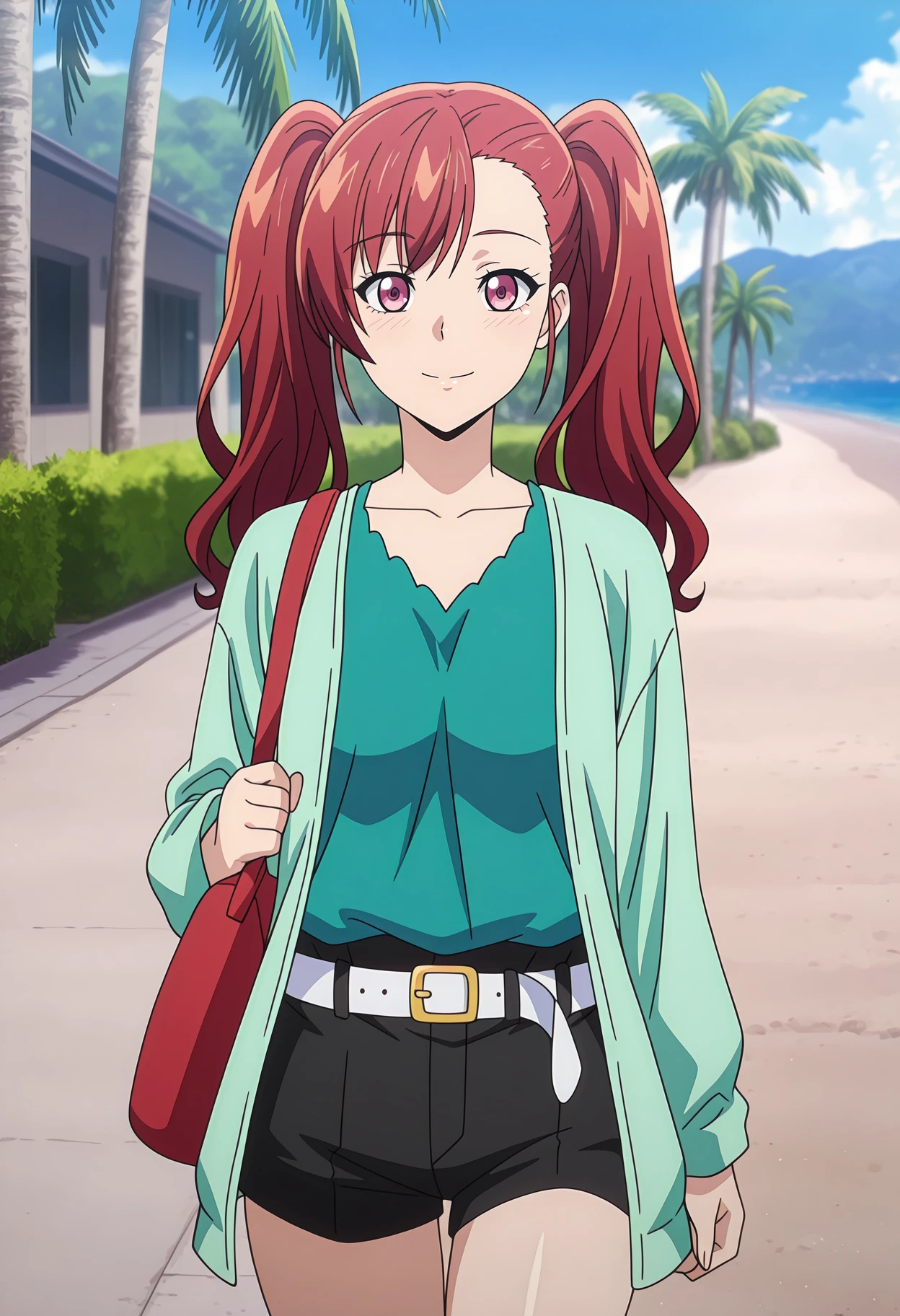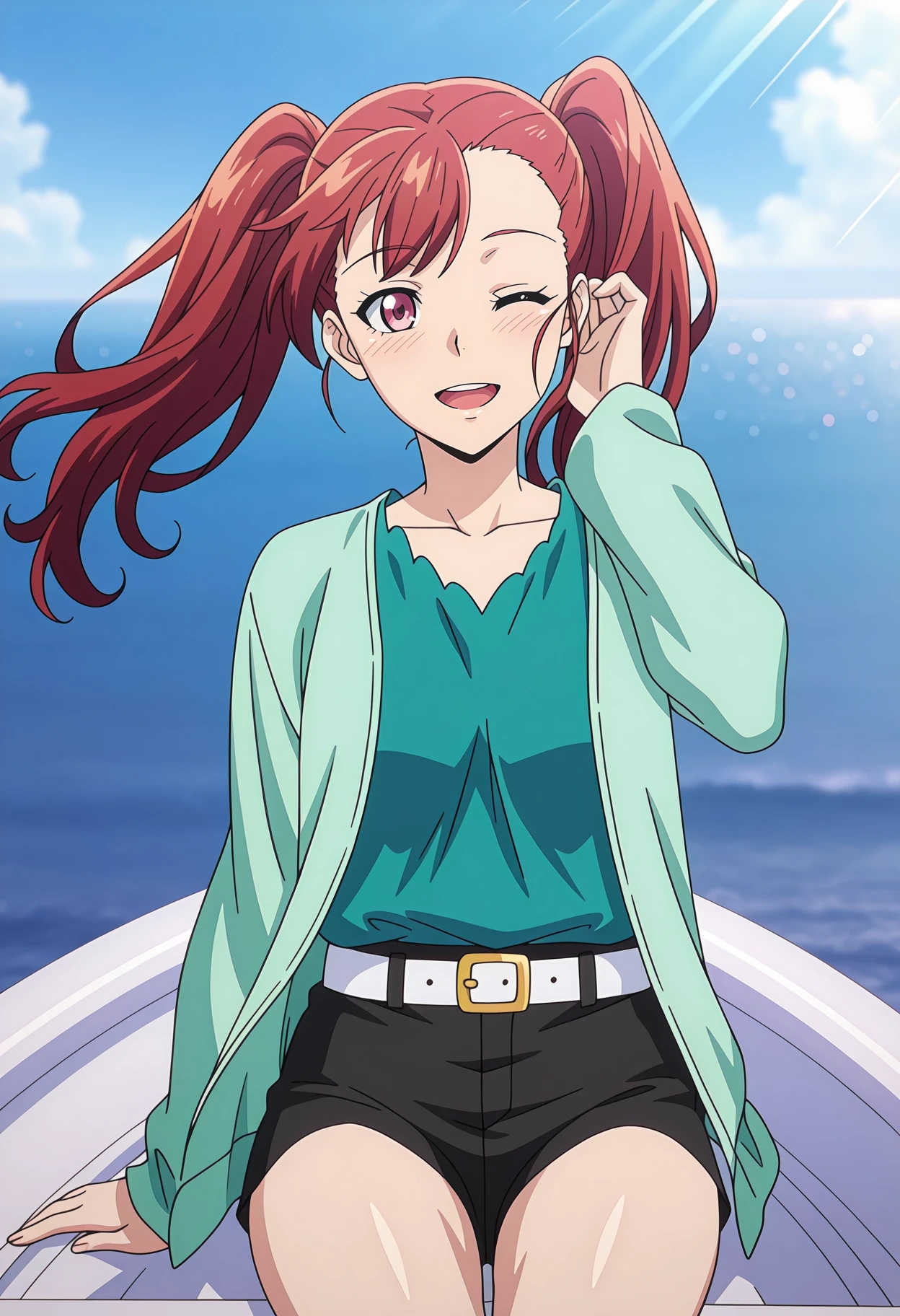 open cardigan, green cardigan, collarbone, aqua shirt, long sleeves, white belt, short shorts, black shorts