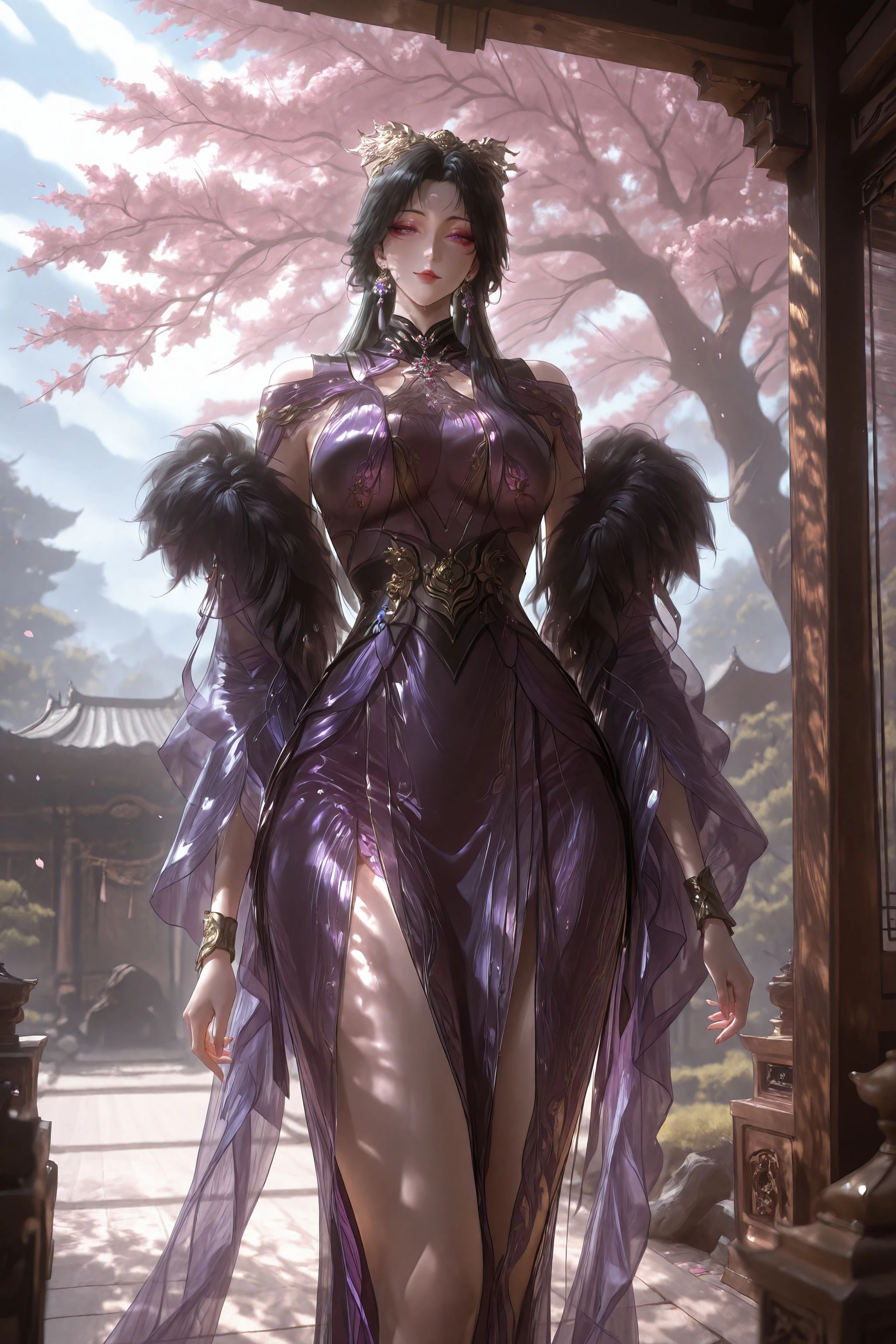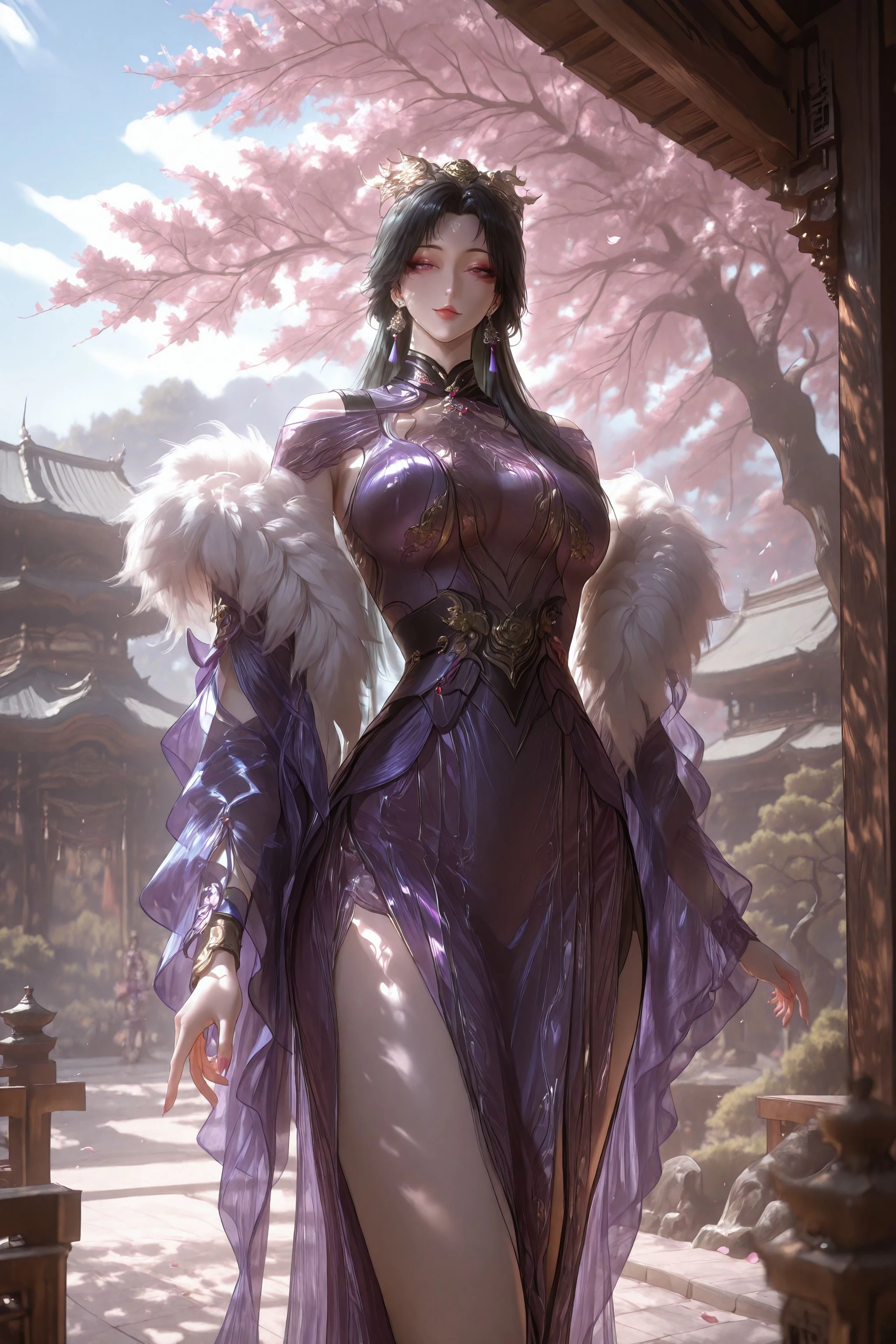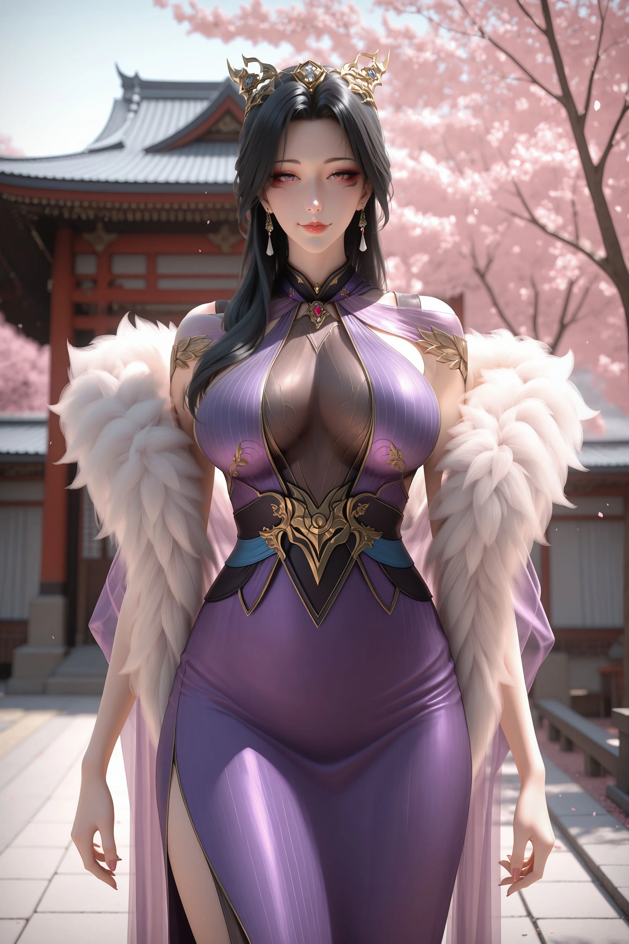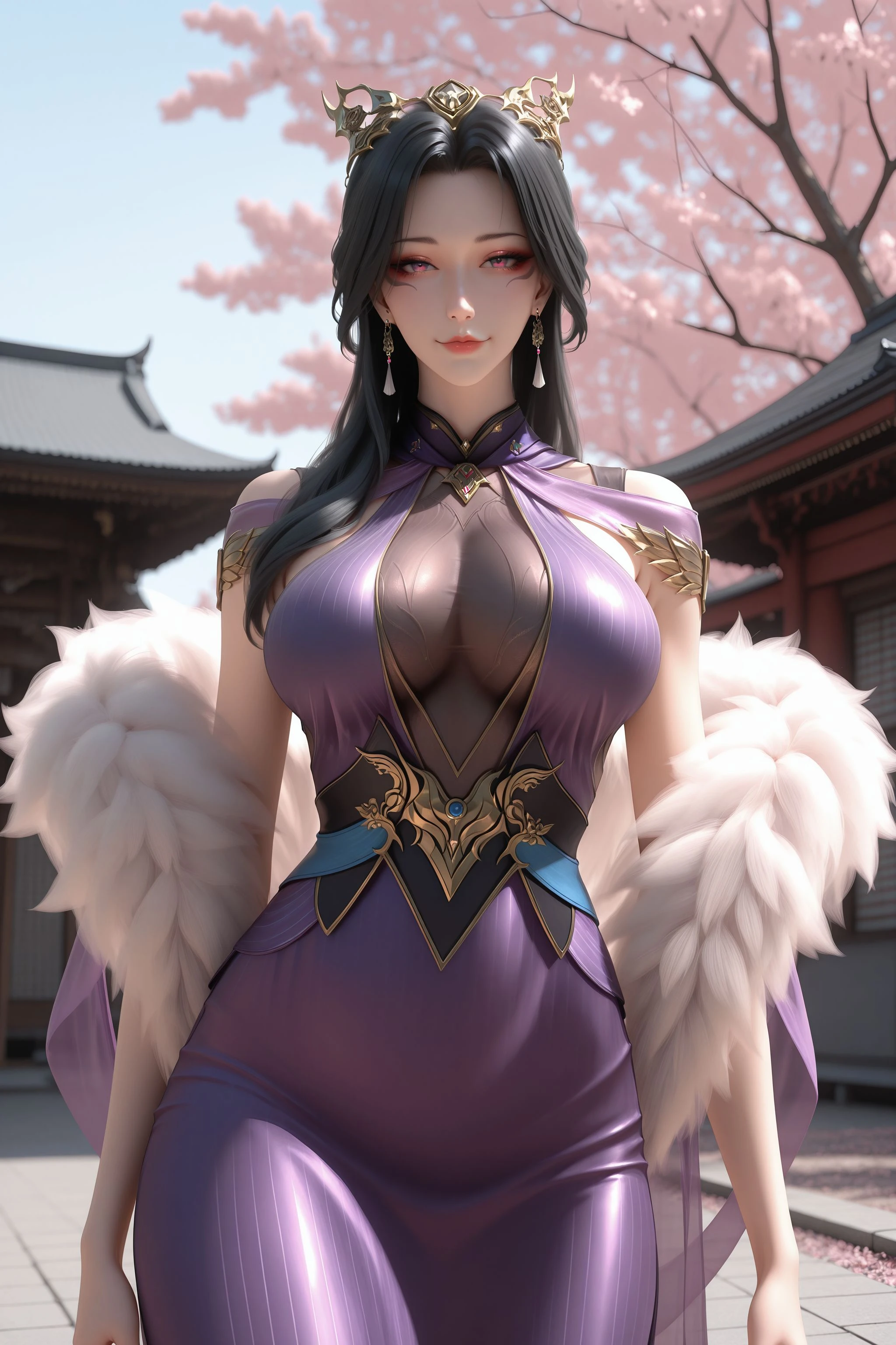 1girl, solo, earrings, black hair, jewelry, dress, purple dress, hair ornament, long hair, fur trim