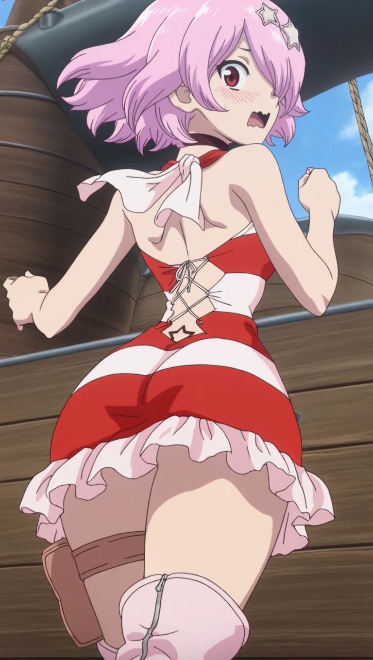 striped dress, cross-laced breast window, thigh pouch, pink thigh boots, black choker, star hair ornament, frills, breasts, medium breasts, cleavage, covered navel, bare shoulders,