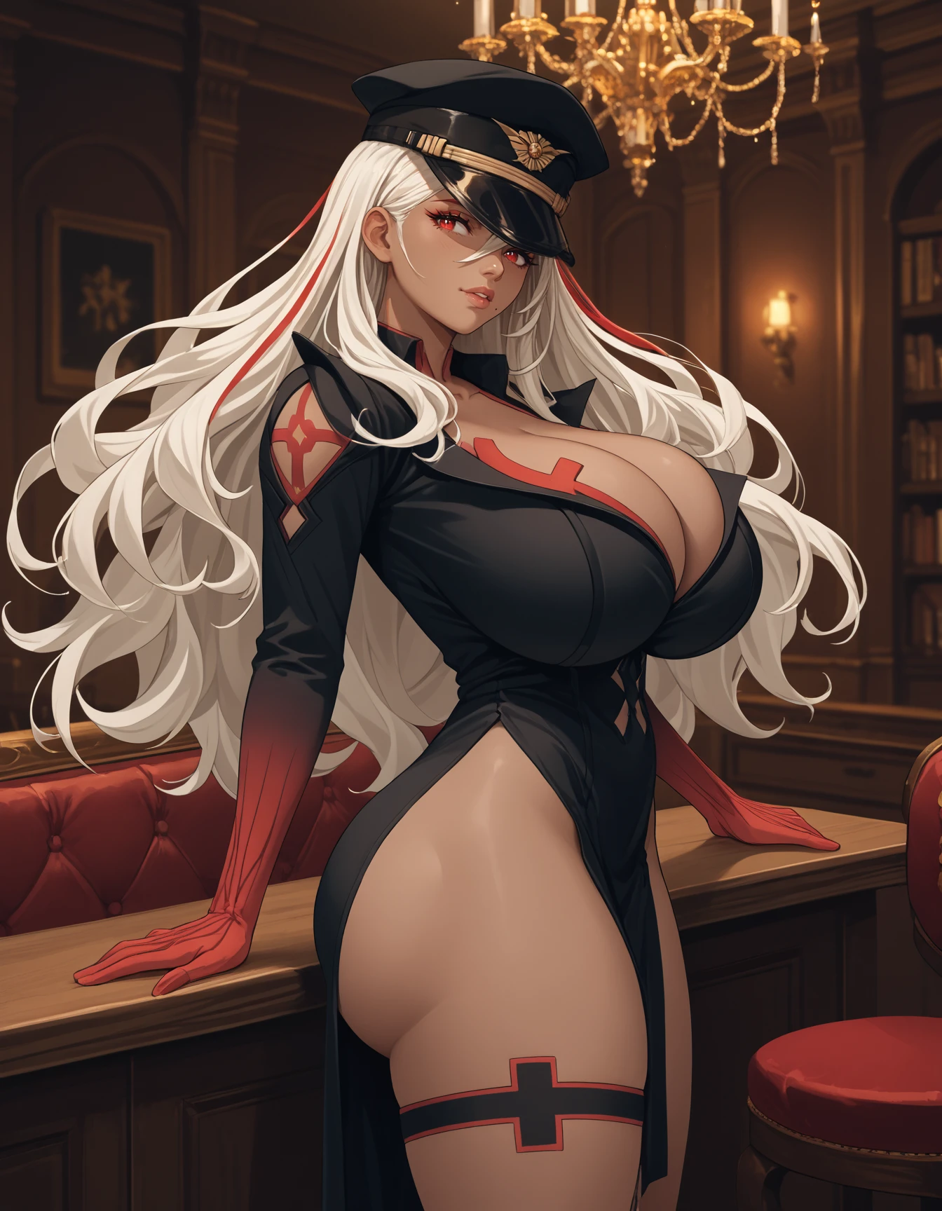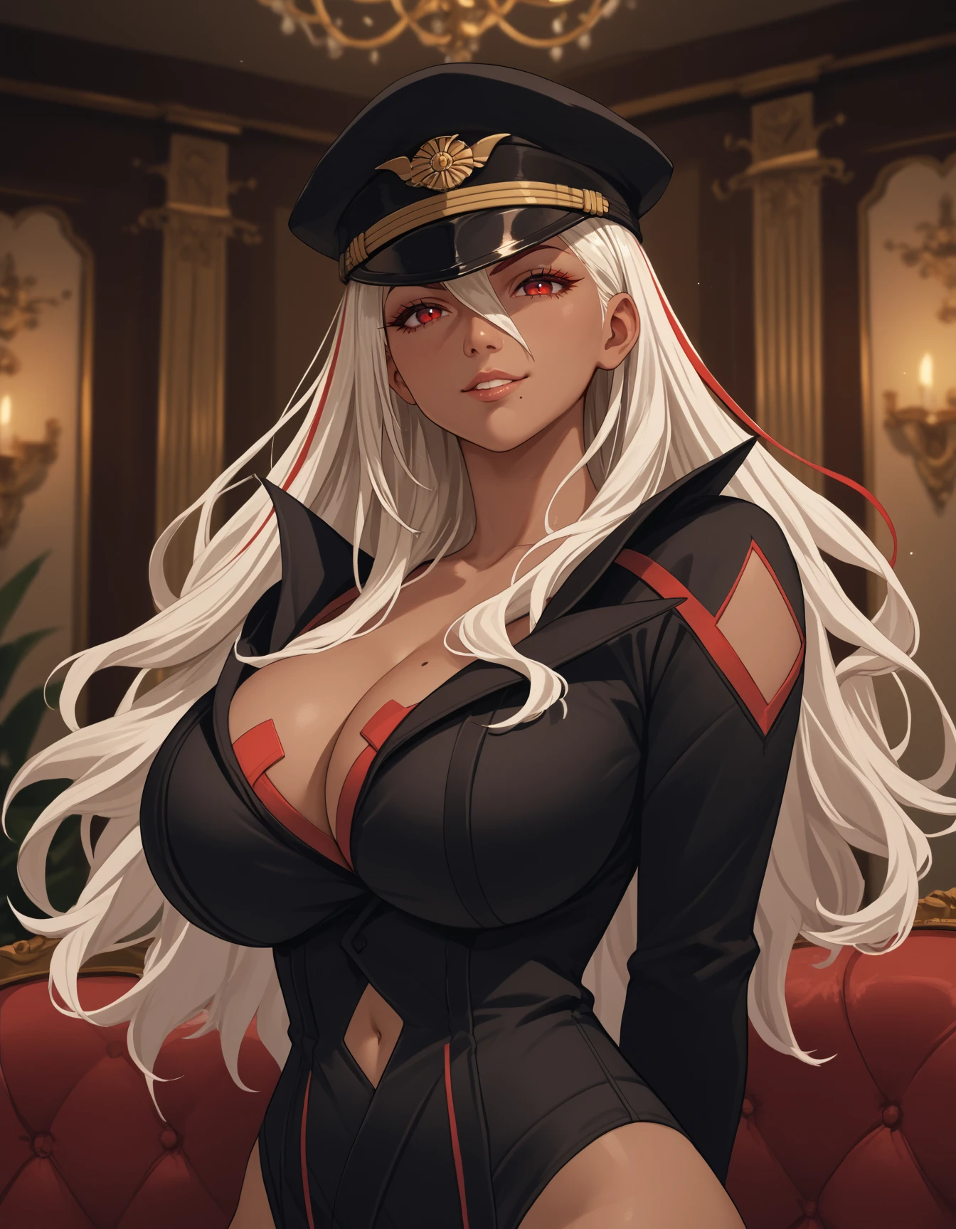 "TaAI, hat, long hair, mole under mouth, red eyes, white hair, clothing cutout, dark skin, dark-skinned female, cleavage, peaked cap, black headwear, black dress, streaked hair, hair between eyes"