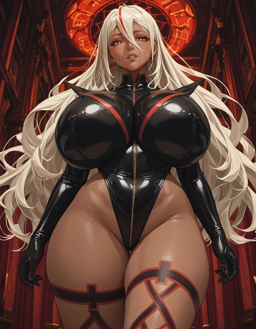 TaDEF, leg tattoo,long hair,mole under mouth, streaked hair, hair between eyes, red eyes,dark-skinned female, dark skin,white hair