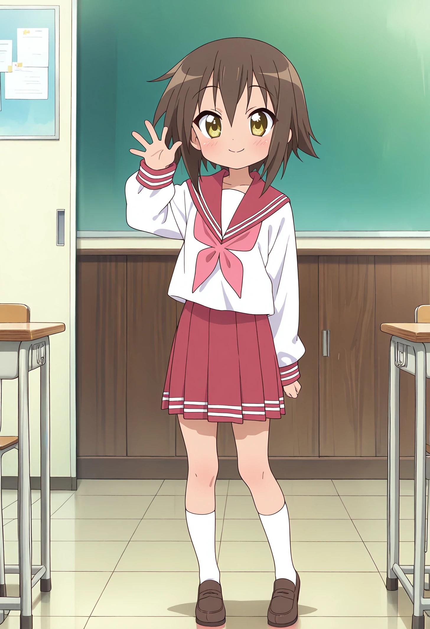 sailor collar, school shirt, red skirt, school uniform, pink neckerchief, white socks, brown loafers,