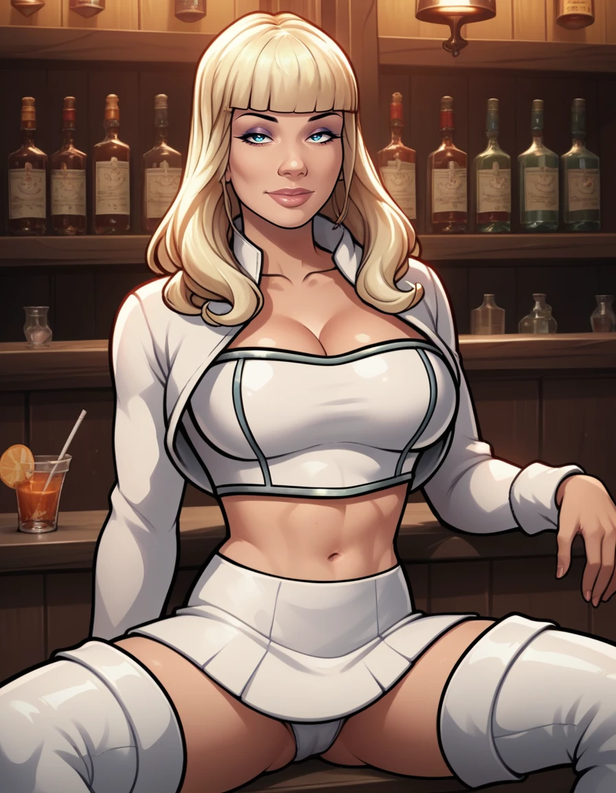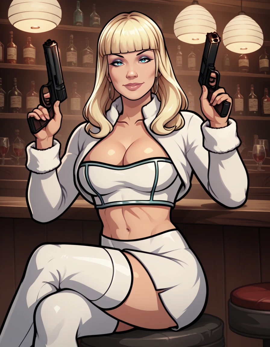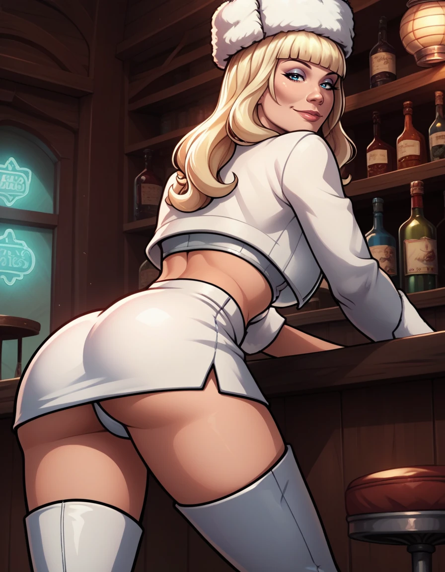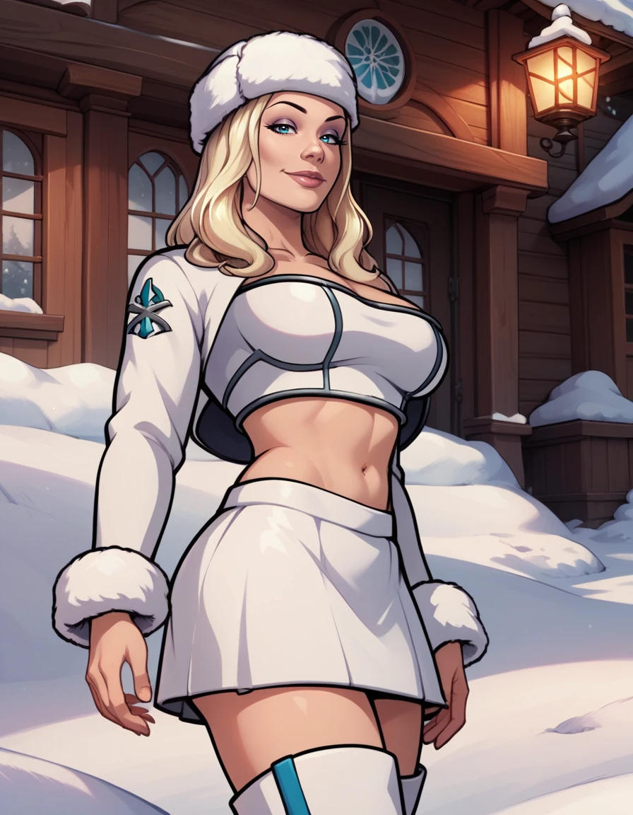 crop top, fur hat, high heel boots, white skirt, cropped jacket, fur trim,
