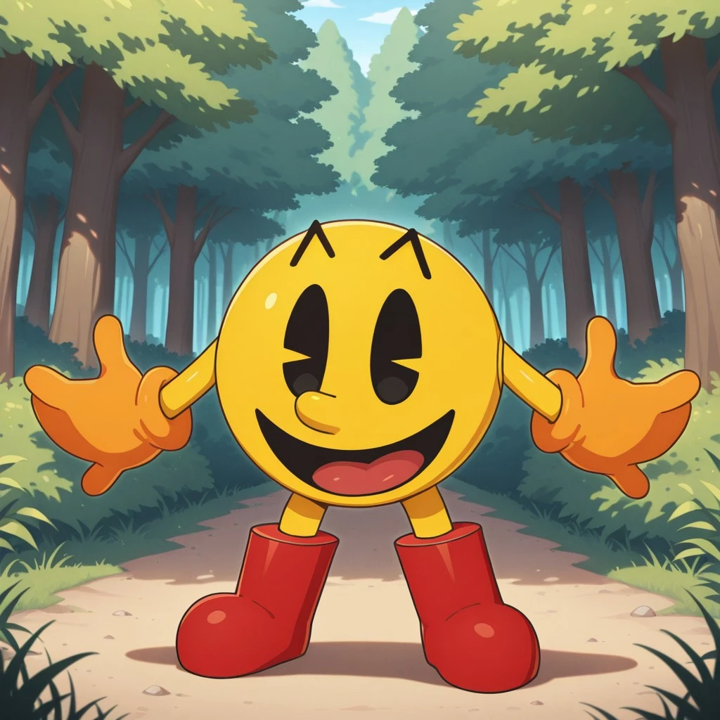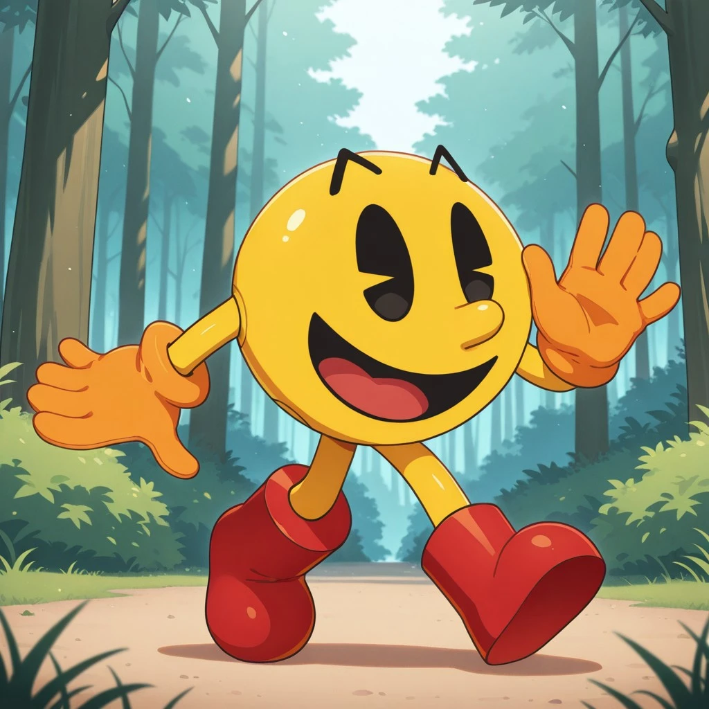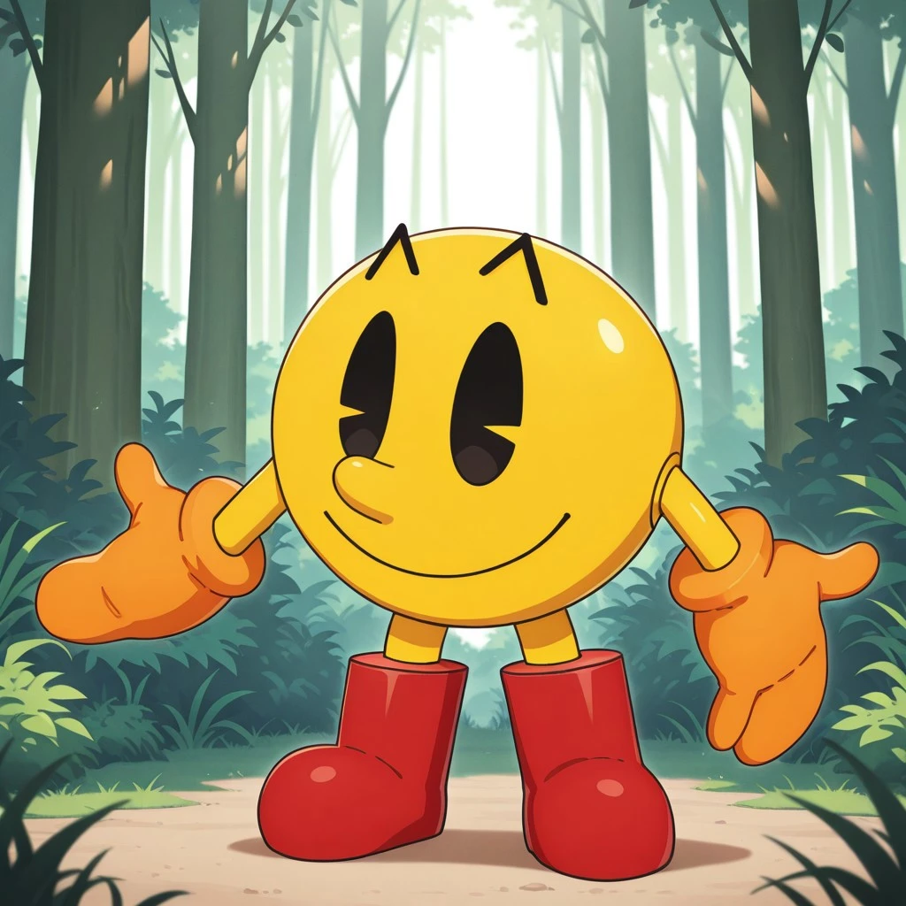 1 boy, PacMan, black eyes, soy pupils, Pacman Eyes, ball body, yellow gloves, red boots,