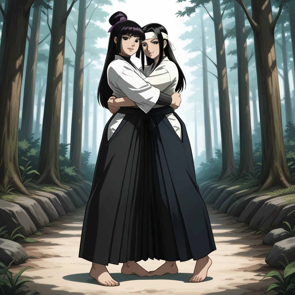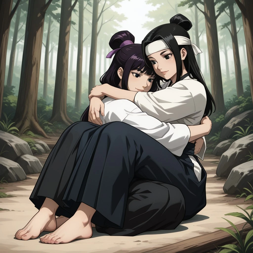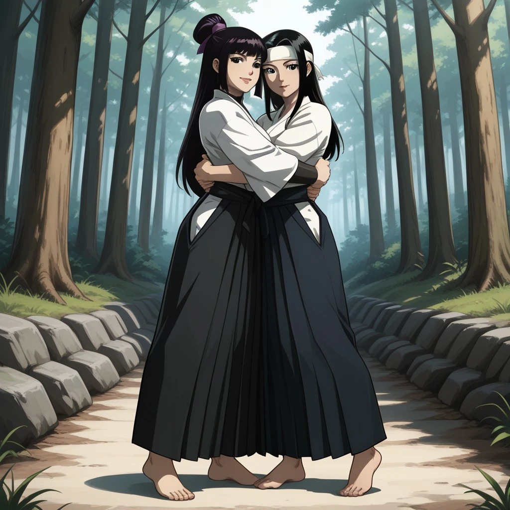 AsuKuto, 2girls, (1girl, Asuka, black hair, top knot, black eyes, white japanese clothes, black underclothes, black wristbands, black long skirt, barefoot), BREAK, (1girl, Hokuto, 1girl, black hair, black eyes, white headband, white japanese clothes, dark blue long pleated skirt, barefoot)