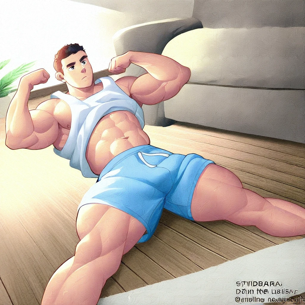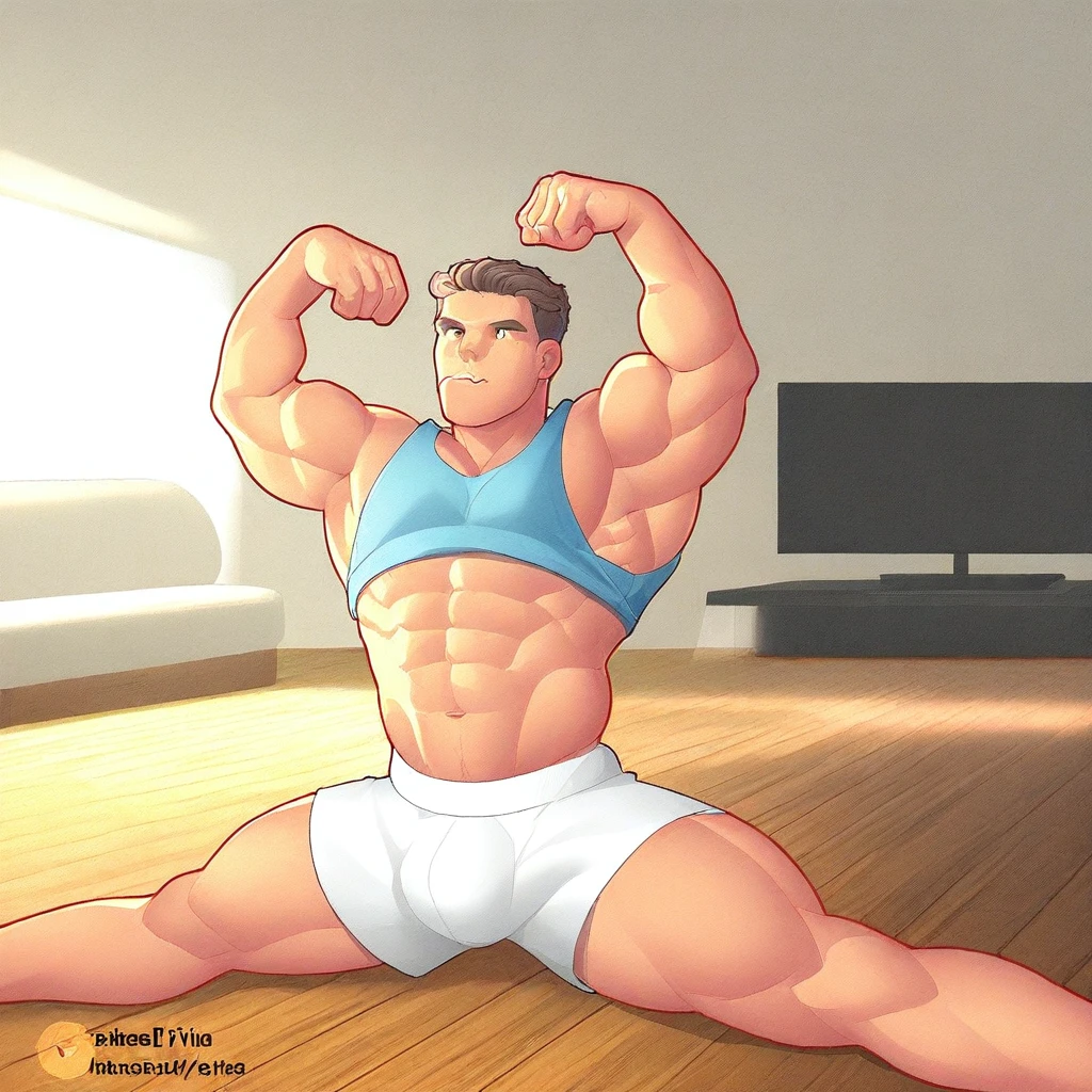 Male "bara/muscle anime-cartoon" aesthetic, common in fan art of wrestlers or strong original characters.