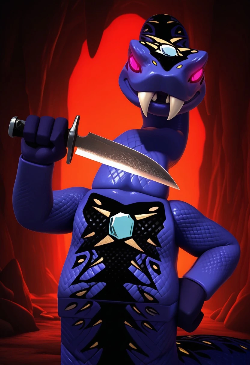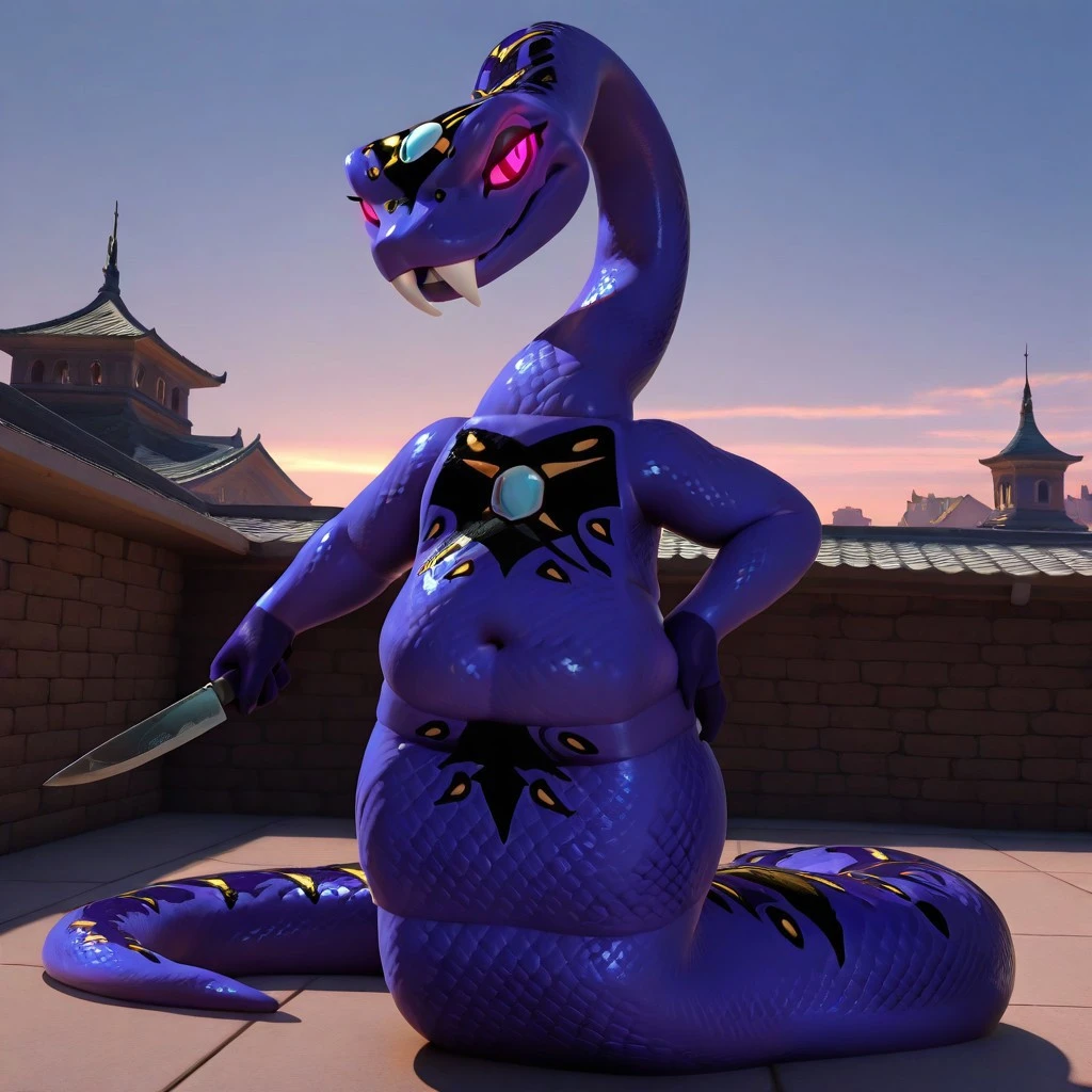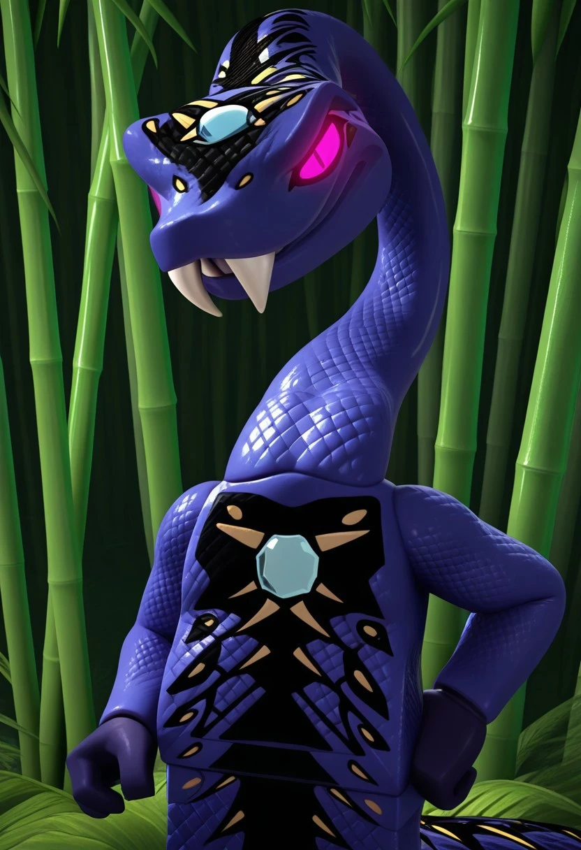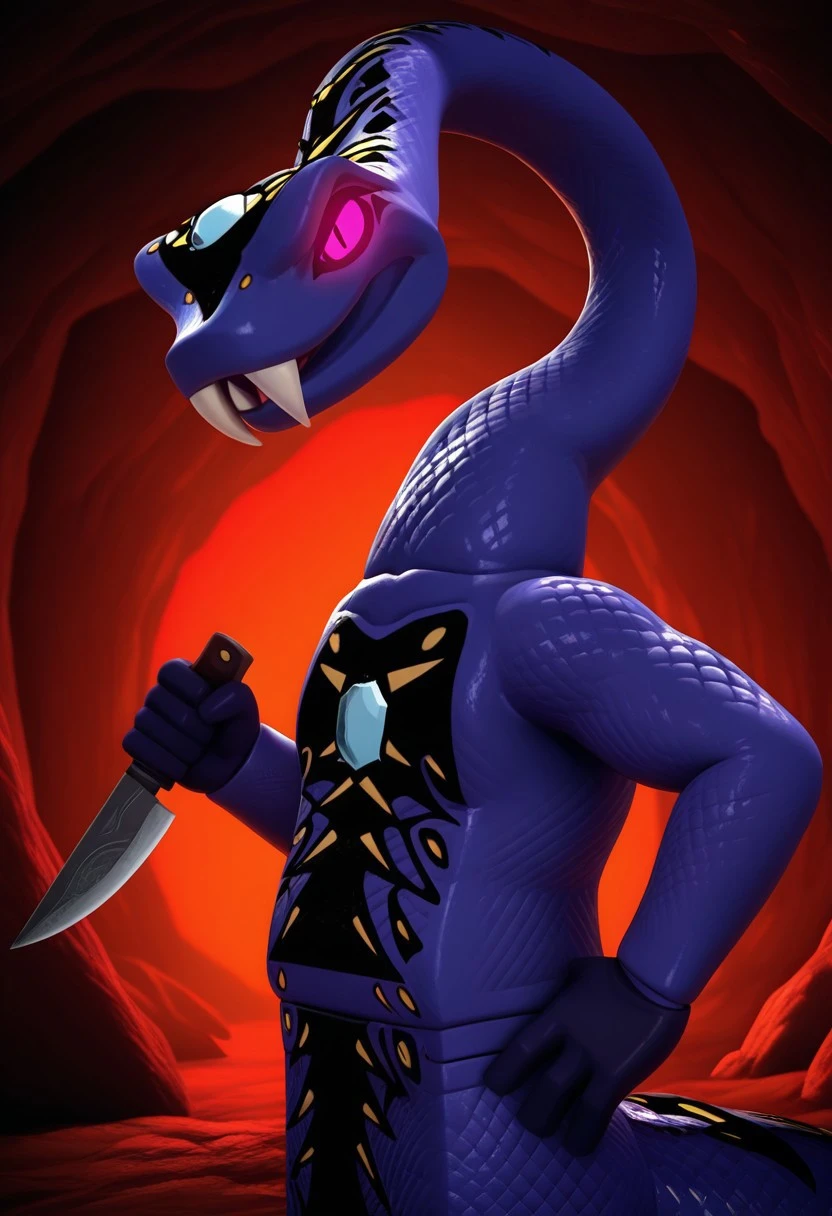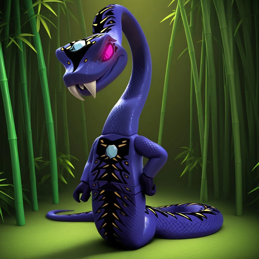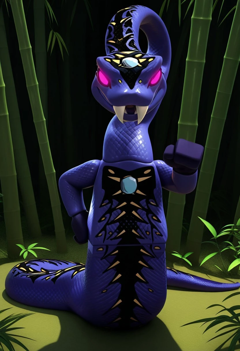 OG: Pythor_P_Chumsworth, serpentine, snake, snake tail, long tail, no legs, apode, purple scales, light blue gem on head, light blue gem on chest, long neck, black and yellow body markings, intricate body markings, head markings, belly markings, tail markings, pointed teeth, 2 large fangs, glowing eyes, hot pink sclera, black pupils, black eyeshadow, dark purple hands